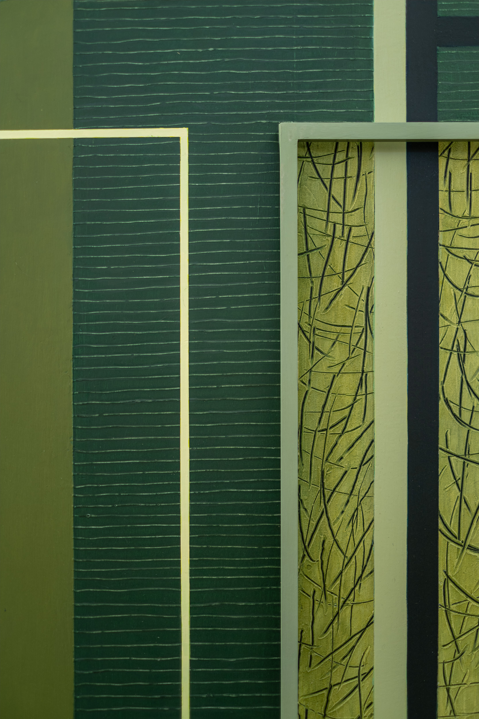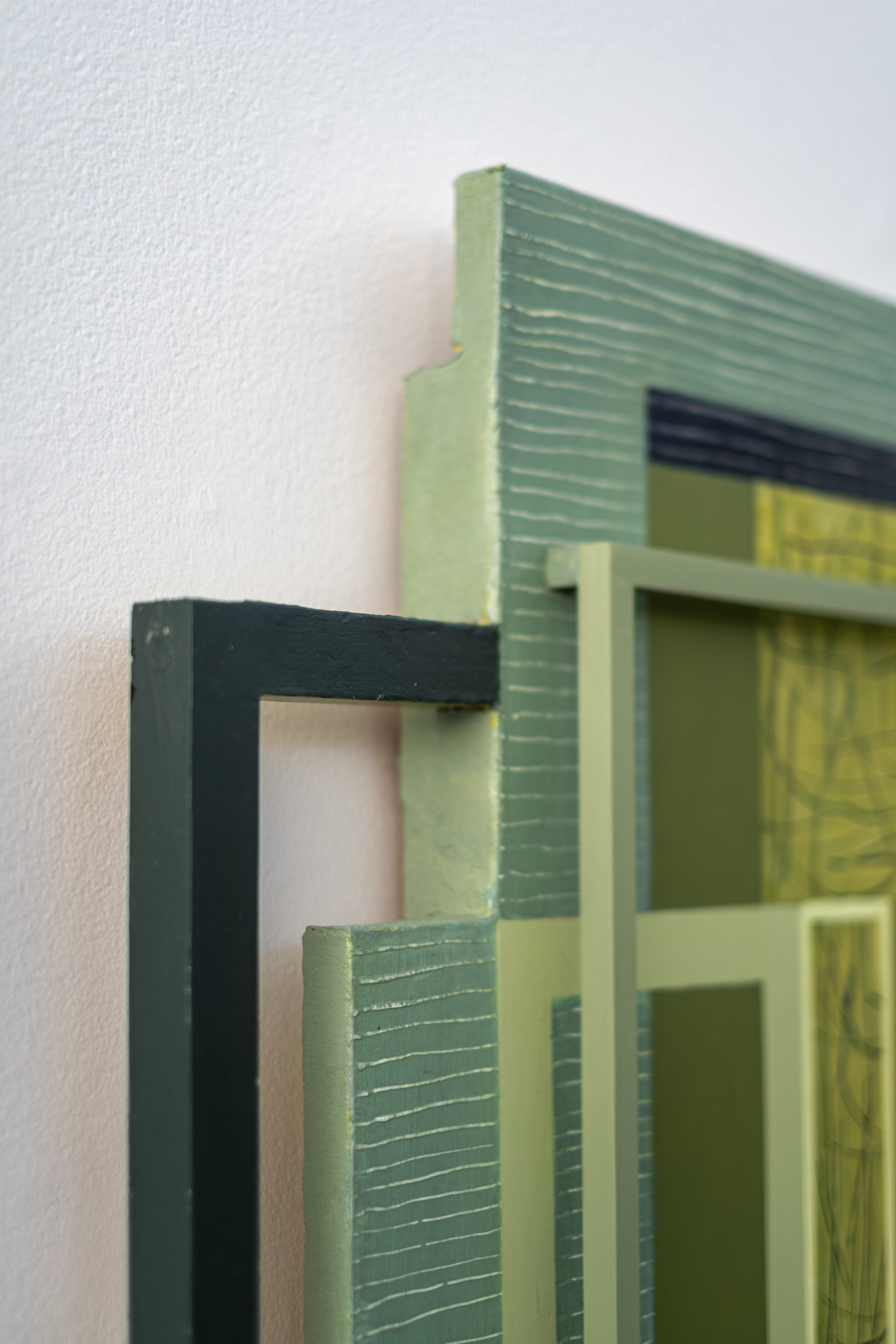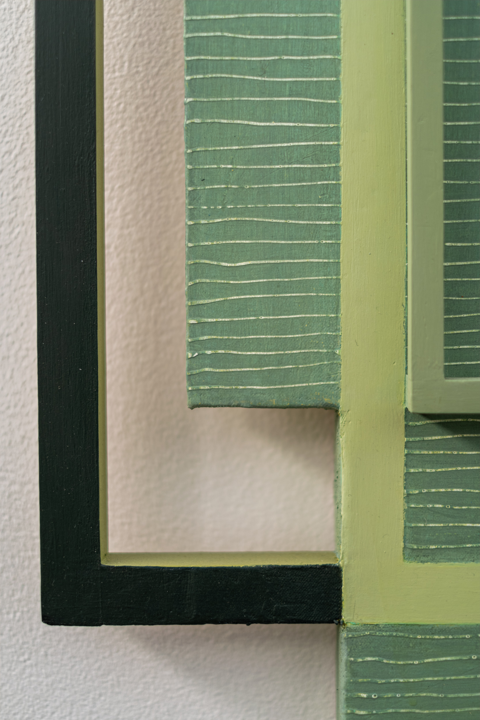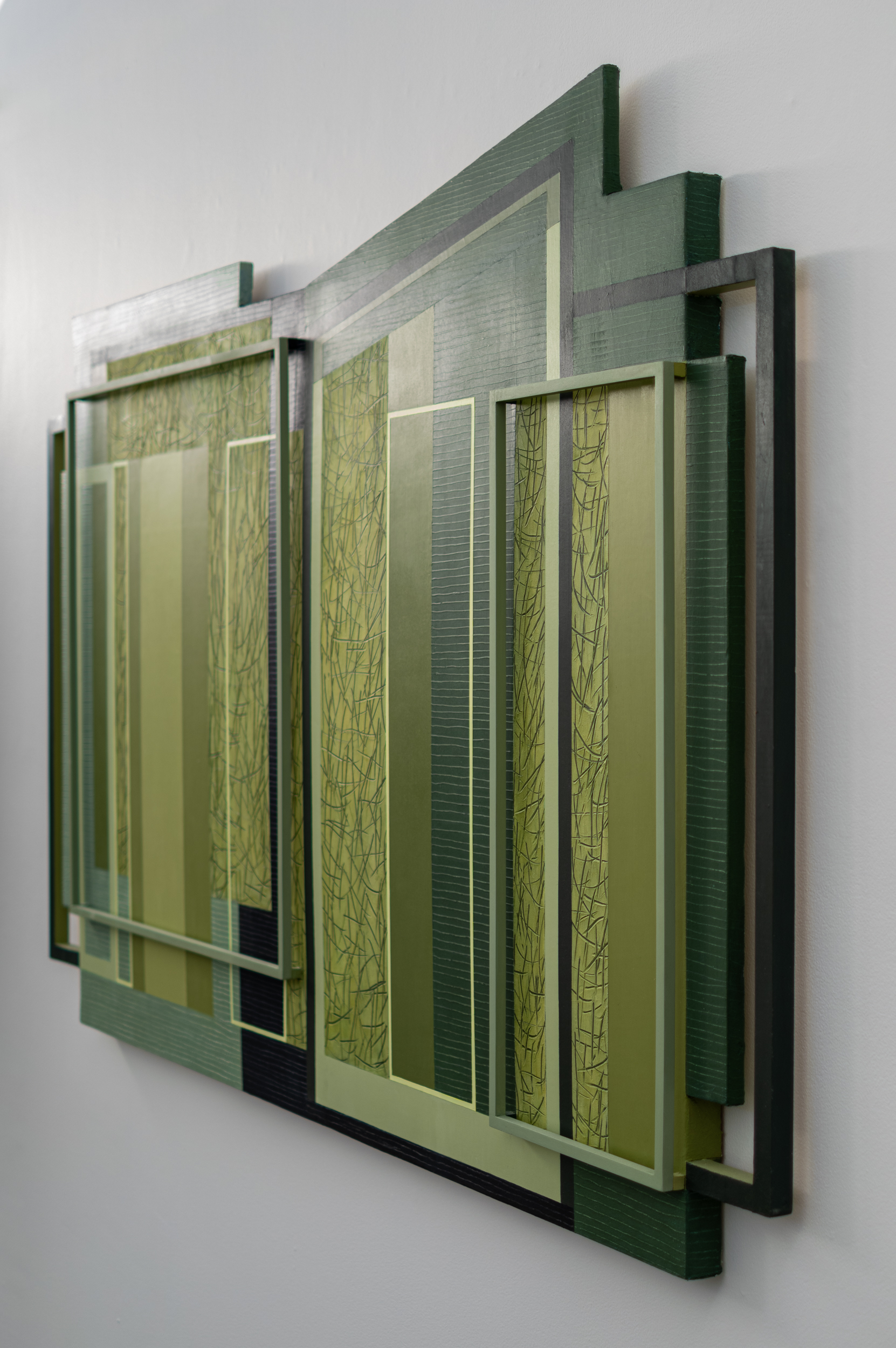 This contemporary abstract acrylic painting consists of green geometric shapes.An intuitive artist, Lucy Maki’s unique artwork is often both a painting and a sculptural piece. With Floating Frames, the New Mexico artist says she is “playing with illusion as two pop-out wood ‘frames’ float across illusory painted white frames.” Rendered in a green palette ranging from deep forest green to soft green and chartreuse, this piece is composed of acrylic media, wood, and canvas over a shaped panel. The concept of shaped paintings became wildly popular in the 1960s. For decades, Maki has explored a distinctive visual language that incorporates mixed media, geometric shapes and architectural elements.
