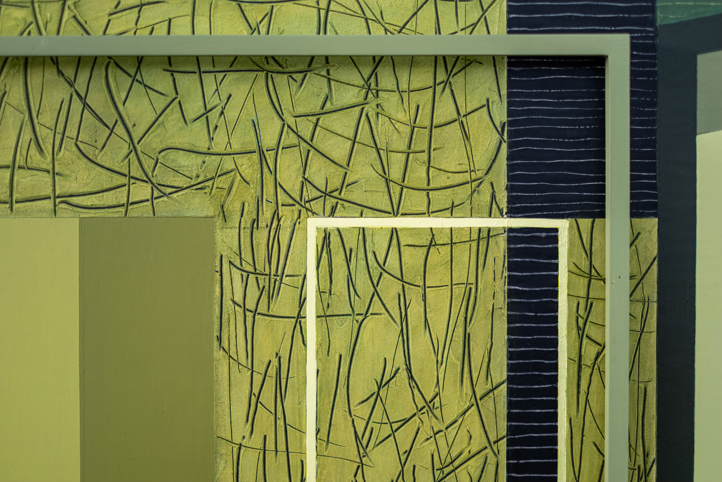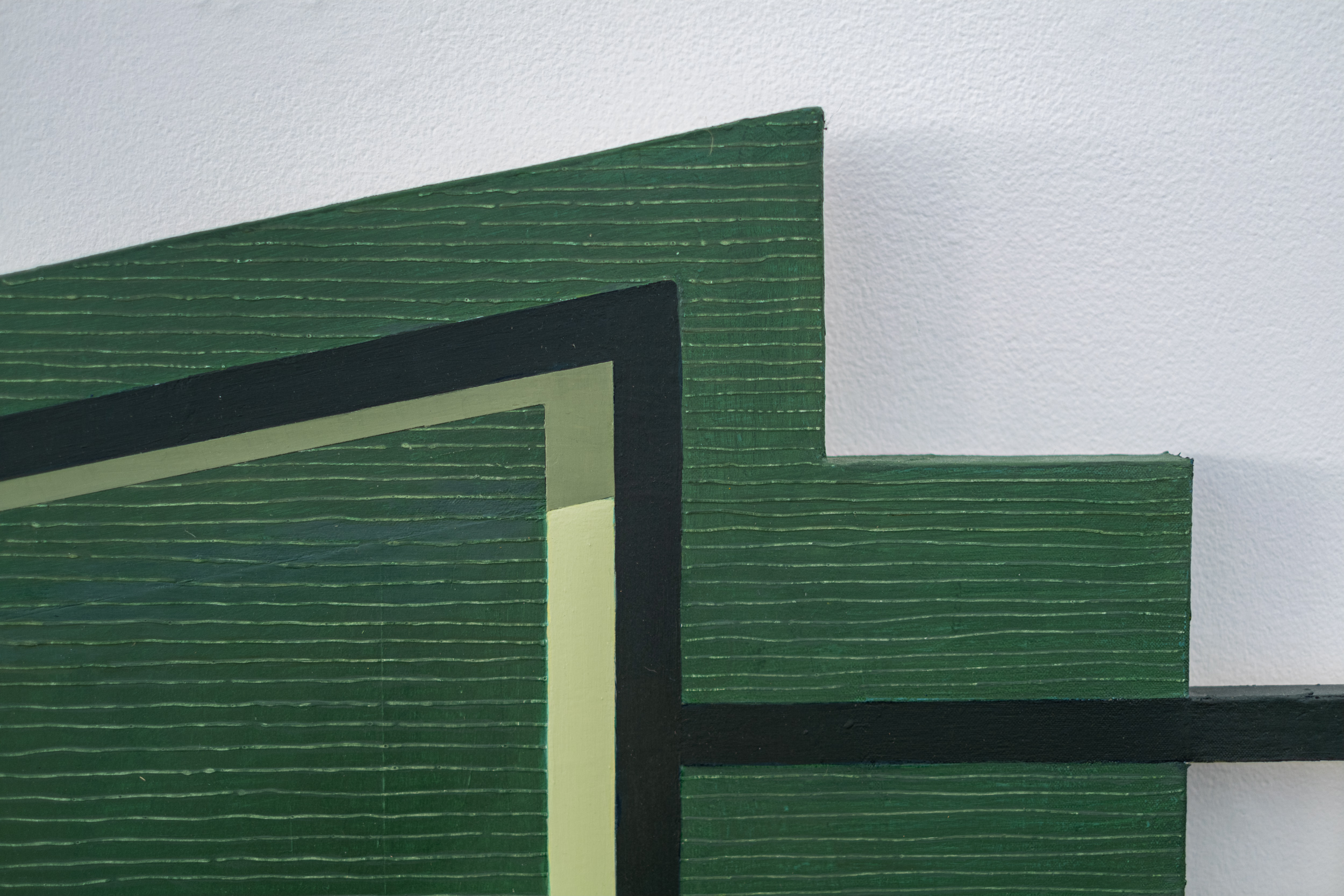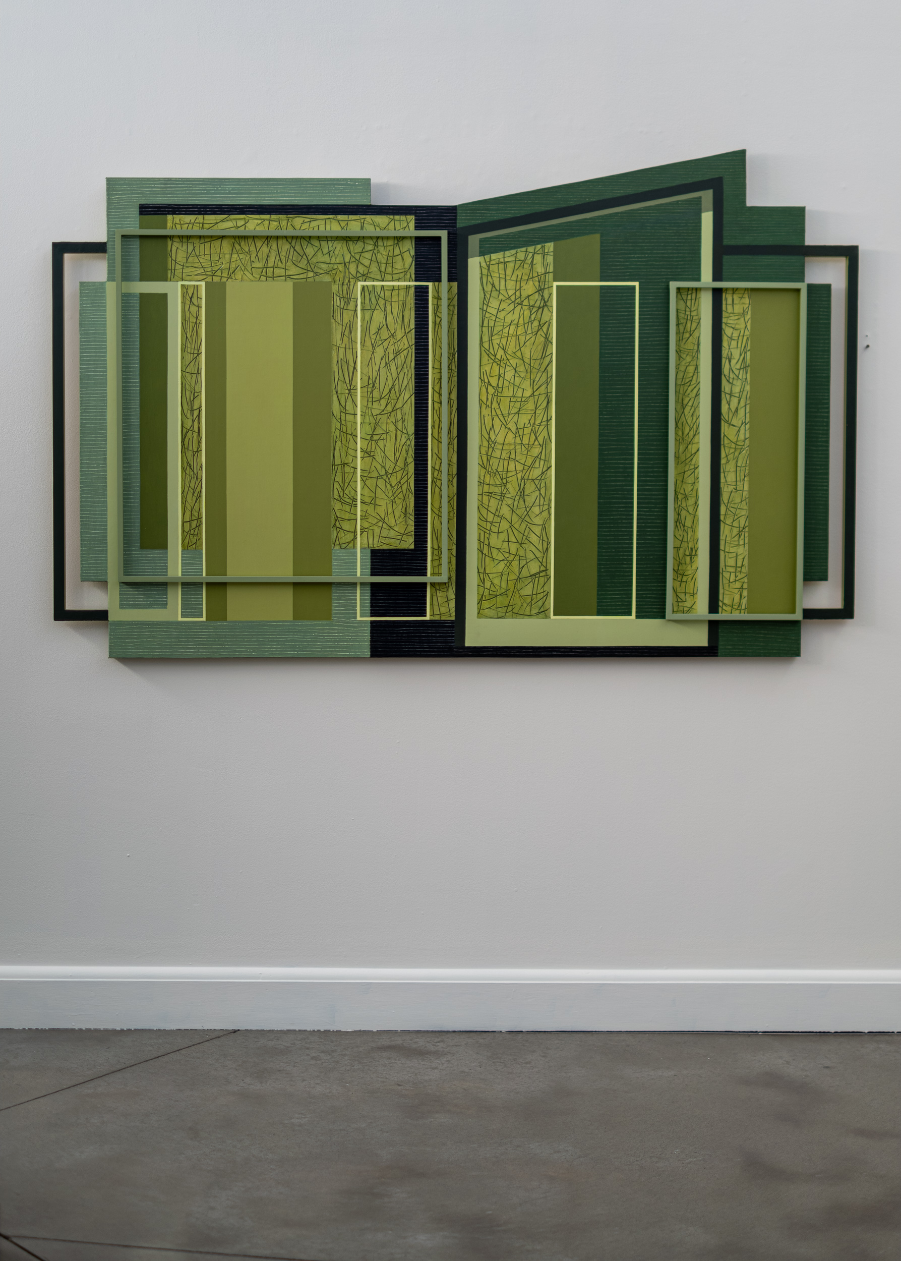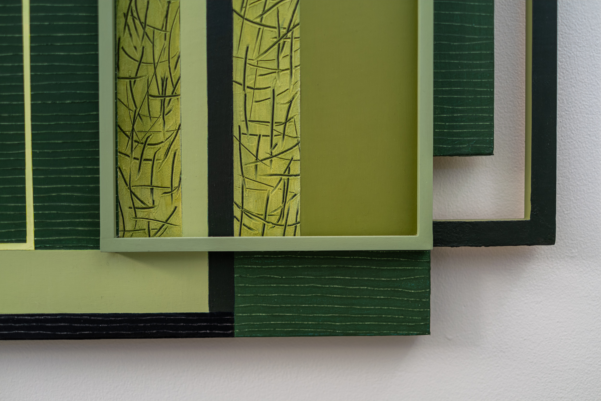 This contemporary abstract acrylic painting consists of green geometric shapes.An intuitive artist, Lucy Maki’s unique artwork is often both a painting and a sculptural piece. With Floating Frames, the New Mexico artist says she is “playing with illusion as two pop-out wood ‘frames’ float across illusory painted white frames.” Rendered in a green palette ranging from deep forest green to soft green and chartreuse, this piece is composed of acrylic media, wood, and canvas over a shaped panel. The concept of shaped paintings became wildly popular in the 1960s. For decades, Maki has explored a distinctive visual language that incorporates mixed media, geometric shapes and architectural elements.