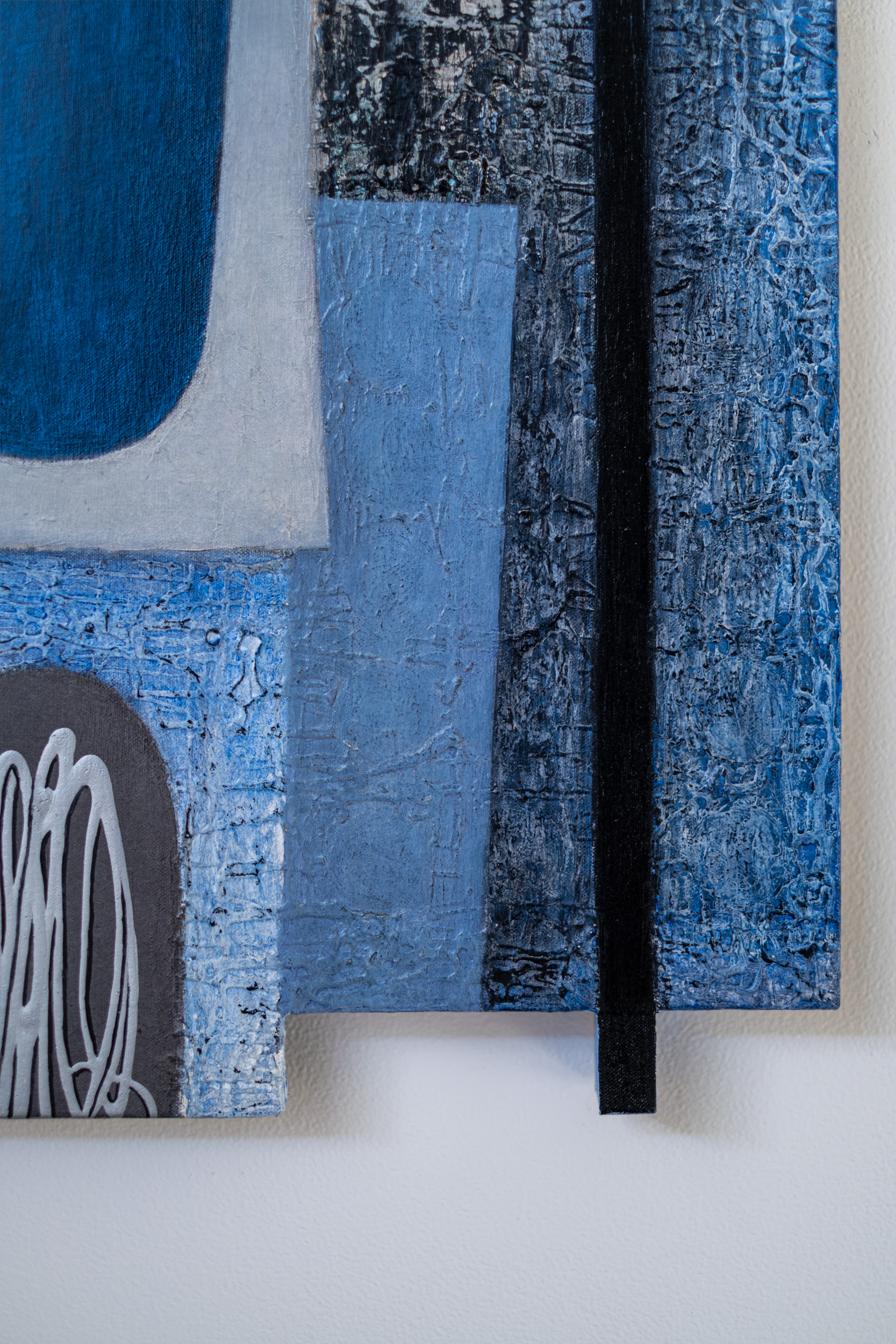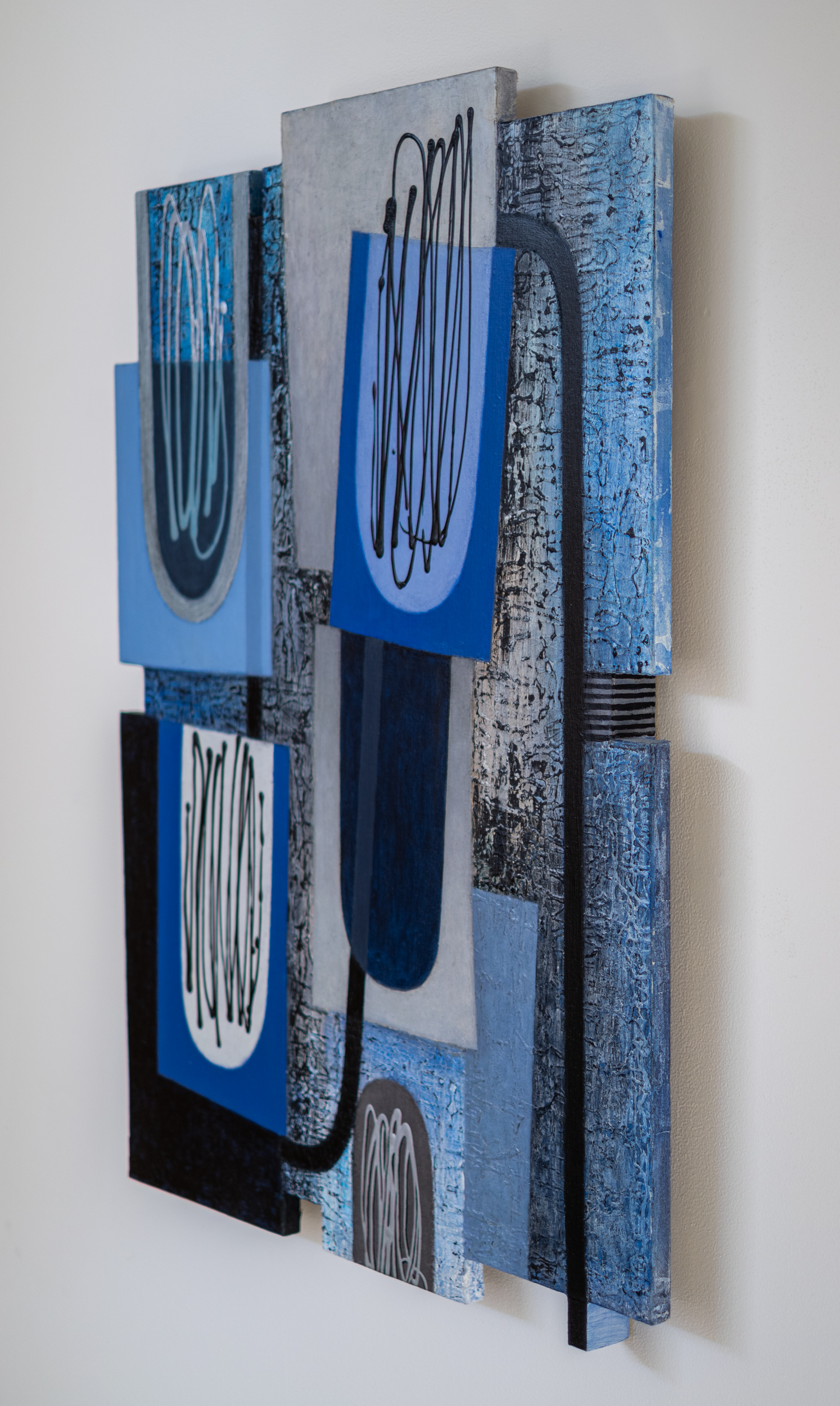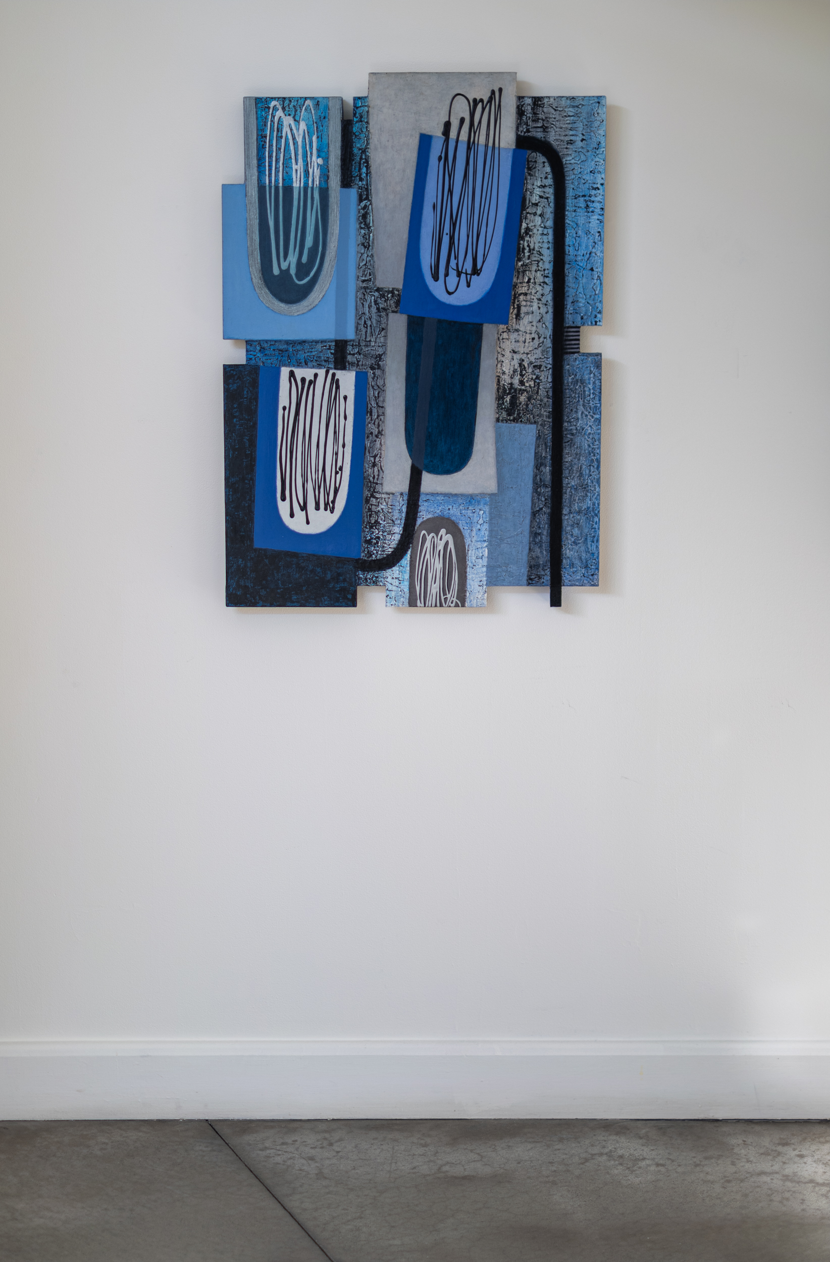 This contemporary abstract painting consists of geometric shapes in shades of blue.For decades, the engaging work of Lucy Maki has attracted both critics and collectors internationally. Influenced by modernist abstraction, cubism and surrealism, the New Mexico artist has explored a distinctive visual language that often incorporates mixed media, geometric shapes and architectural elements. In this dynamic composition, layered squares and rectangles are rendered in various shades of blue—from sky blue to turquoise and deep blue. Patterns and calligraphic markings in black on white add visual interest and energy to the work.