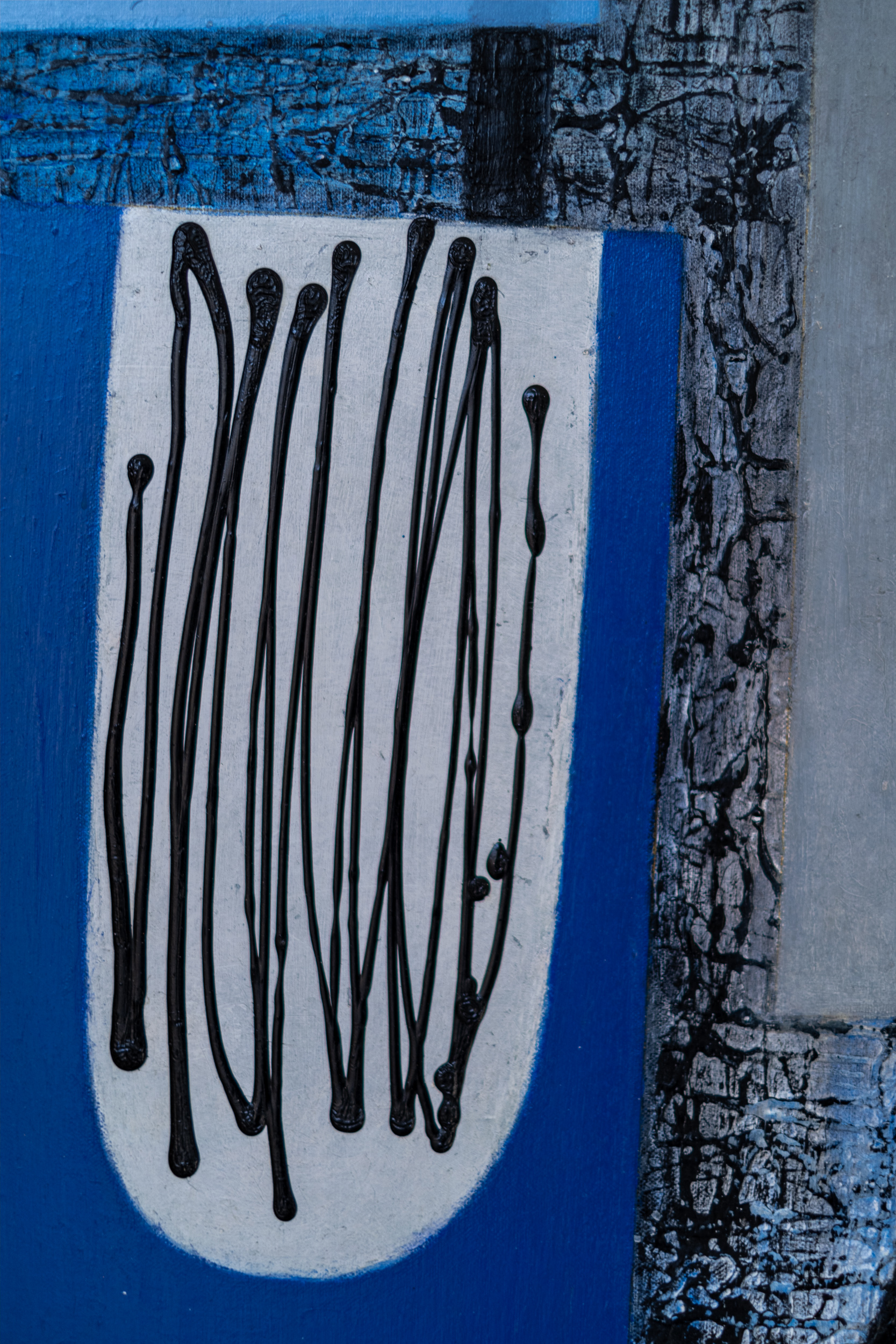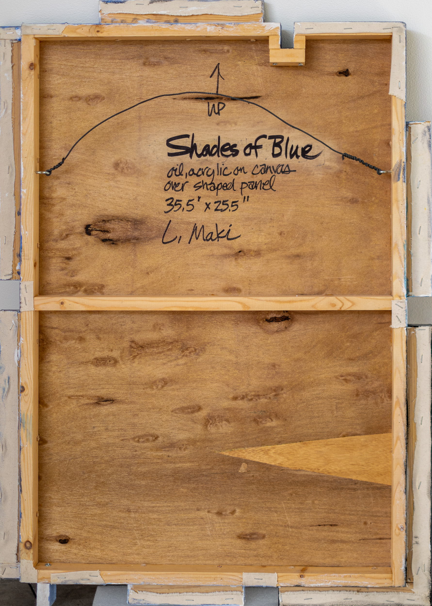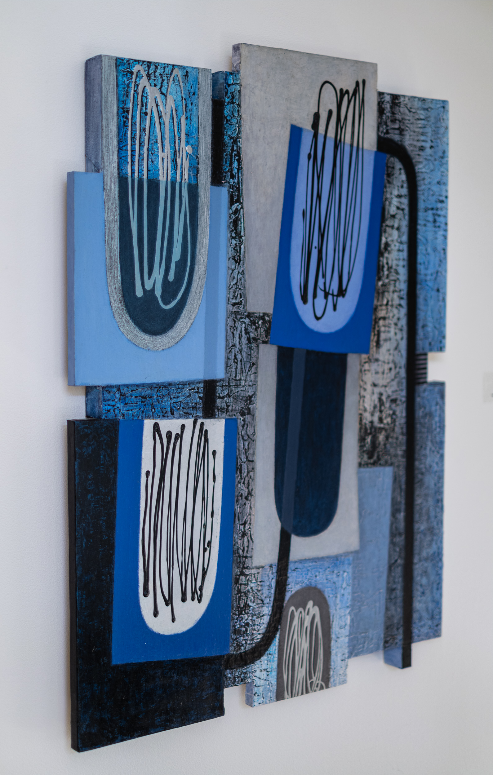 This contemporary abstract painting consists of geometric shapes in shades of blue.For decades, the engaging work of Lucy Maki has attracted both critics and collectors internationally. Influenced by modernist abstraction, cubism and surrealism, the New Mexico artist has explored a distinctive visual language that often incorporates mixed media, geometric shapes and architectural elements. In this dynamic composition, layered squares and rectangles are rendered in various shades of blue—from sky blue to turquoise and deep blue. Patterns and calligraphic markings in black on white add visual interest and energy to the work.