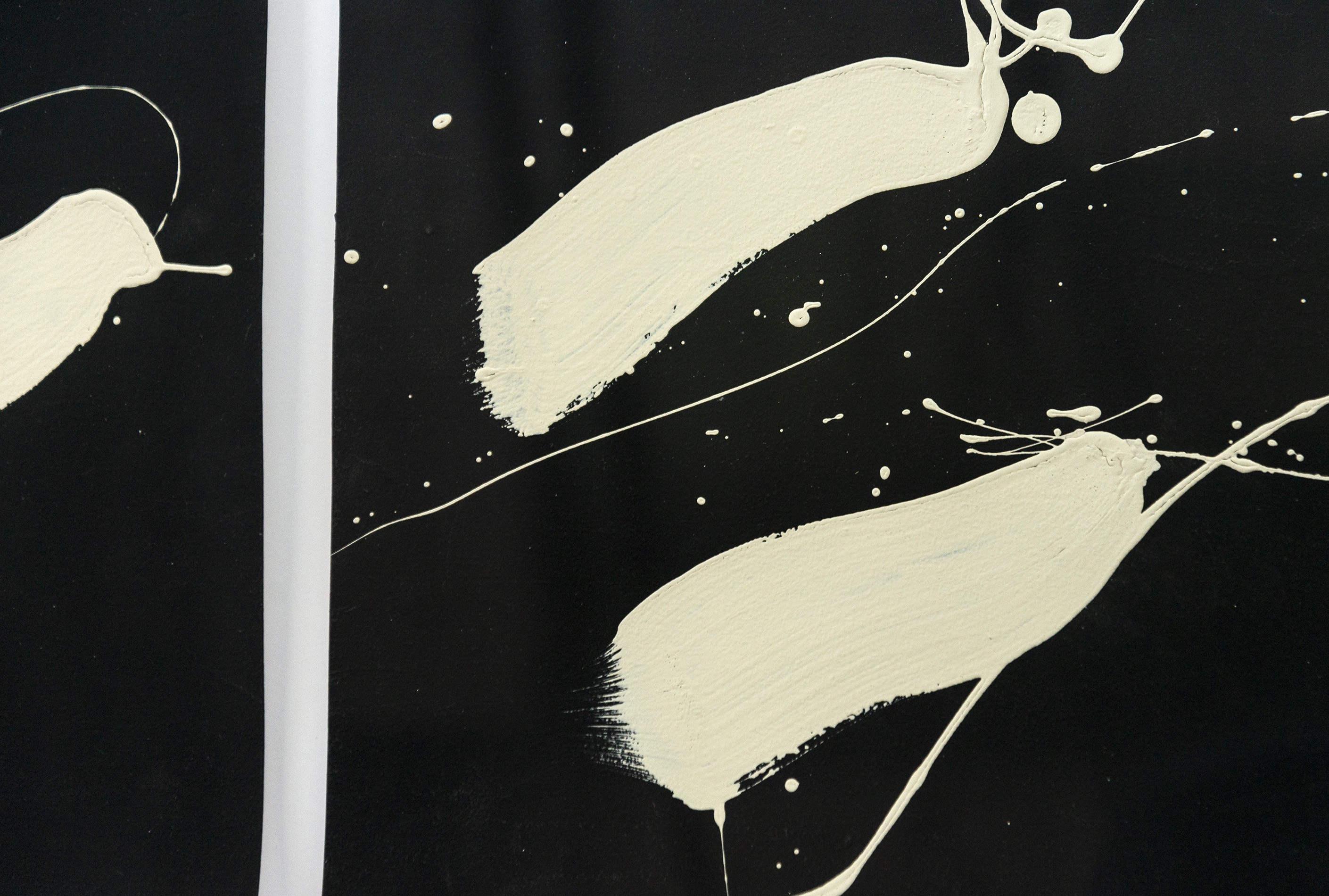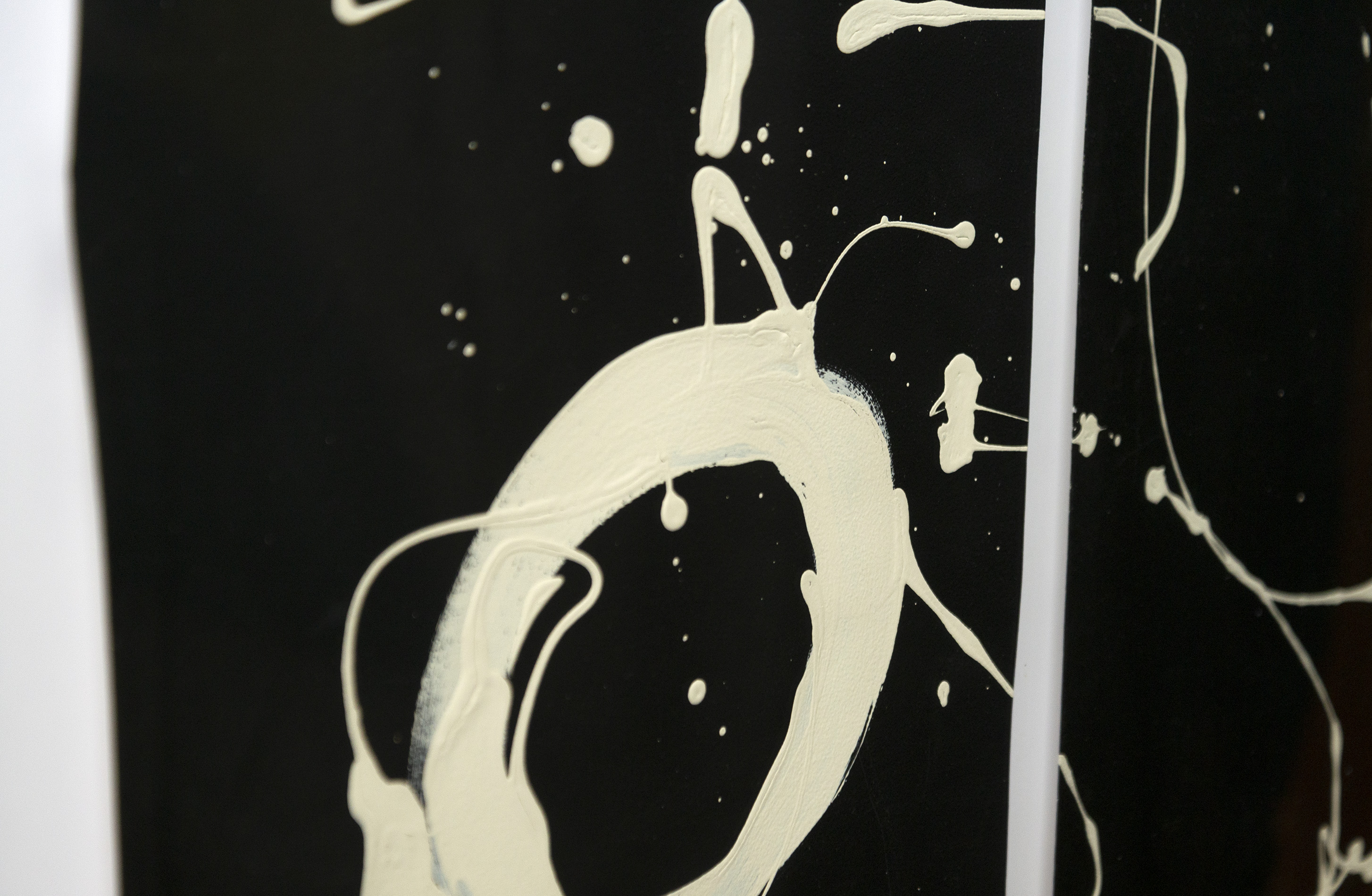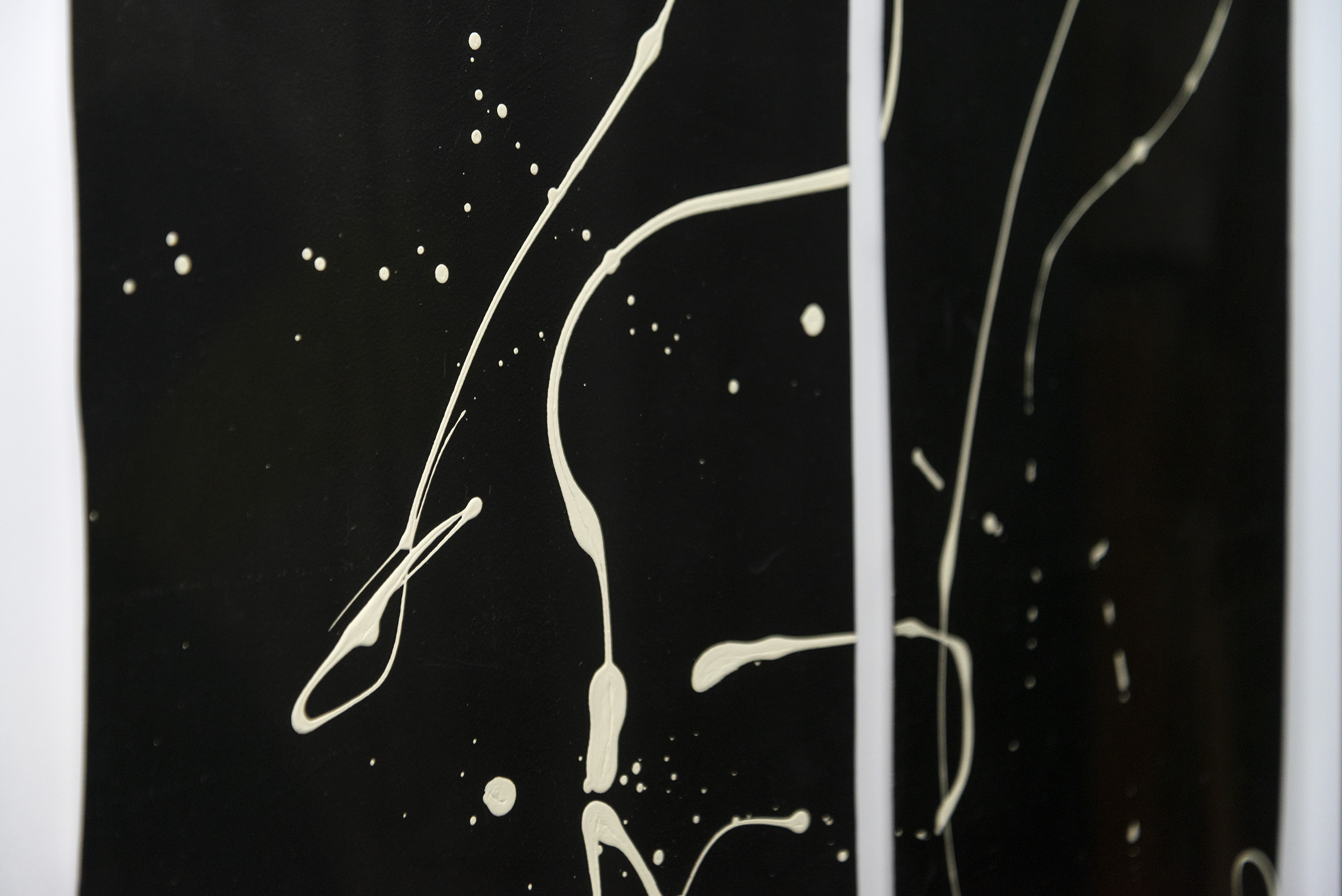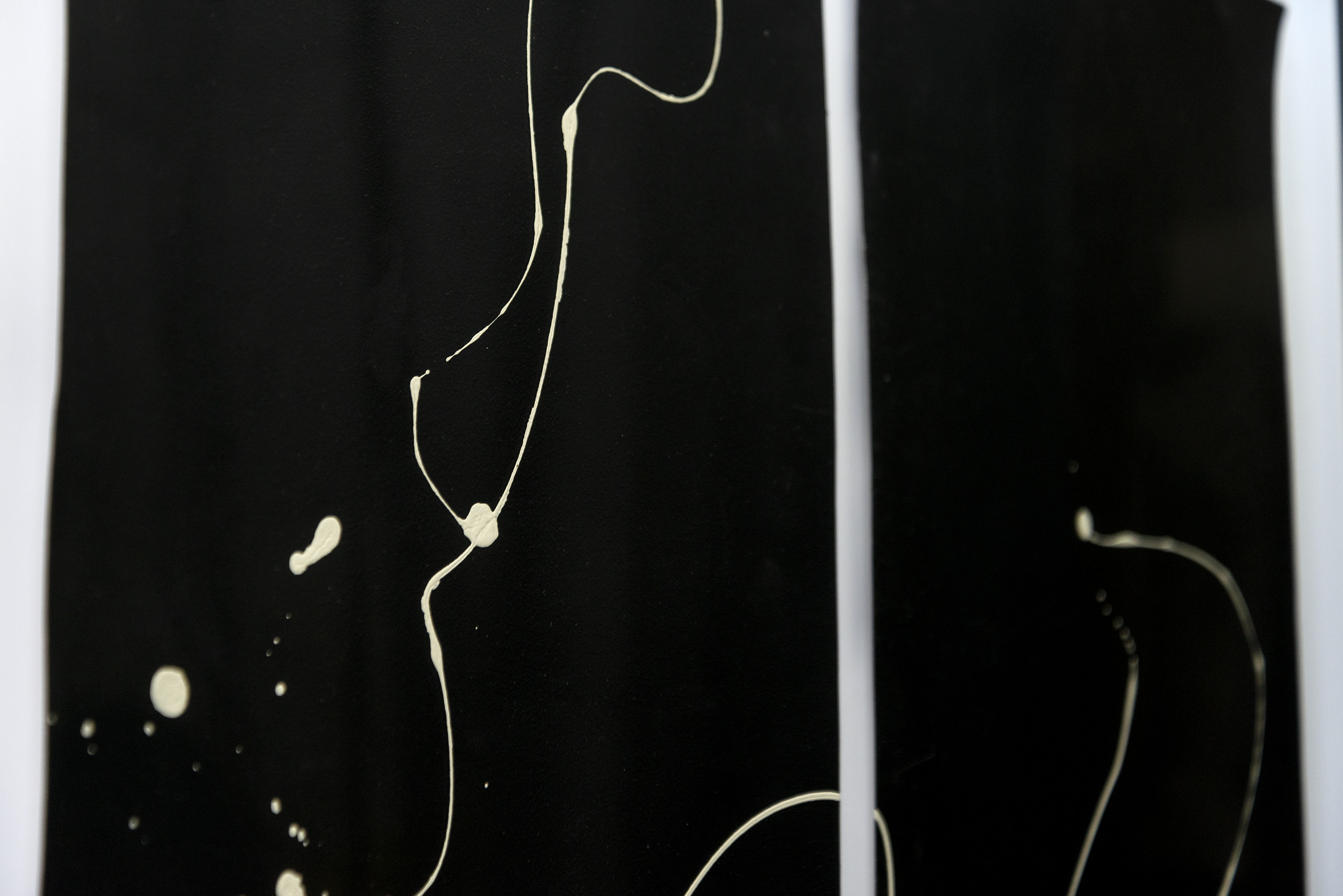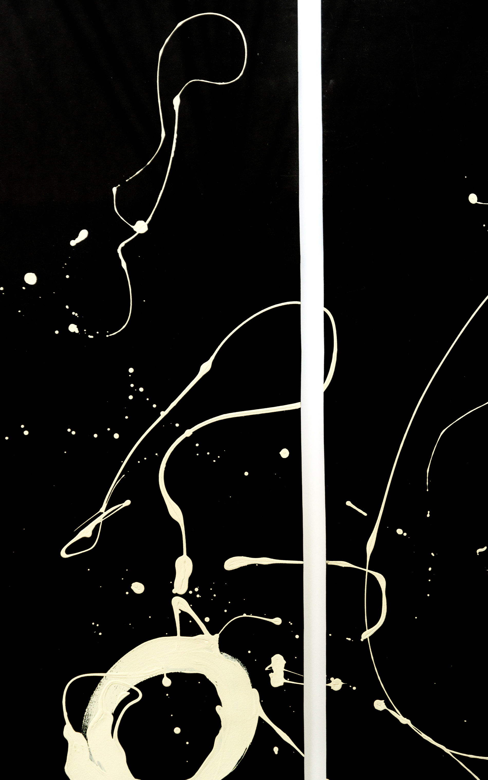 Toronto artist Lynne Fernie prefers working in black and white. She enjoys the pure pleasure of drawing, the first art form she began to work in. Drawing 1 & 2, two panels of jet black with detailed white markings, are part of an intriguing series she created in ink, latex and acrylic.“I think I might be a bit like a writer who faces a blank page. You know you have an idea… What happens when I put the first line on is how the drawing progresses. It’s more like a kind of visual intellect.” Lynne Fernie