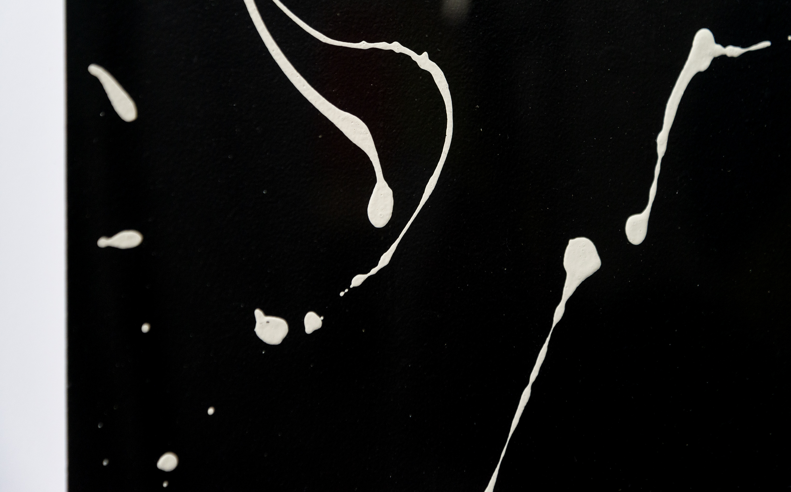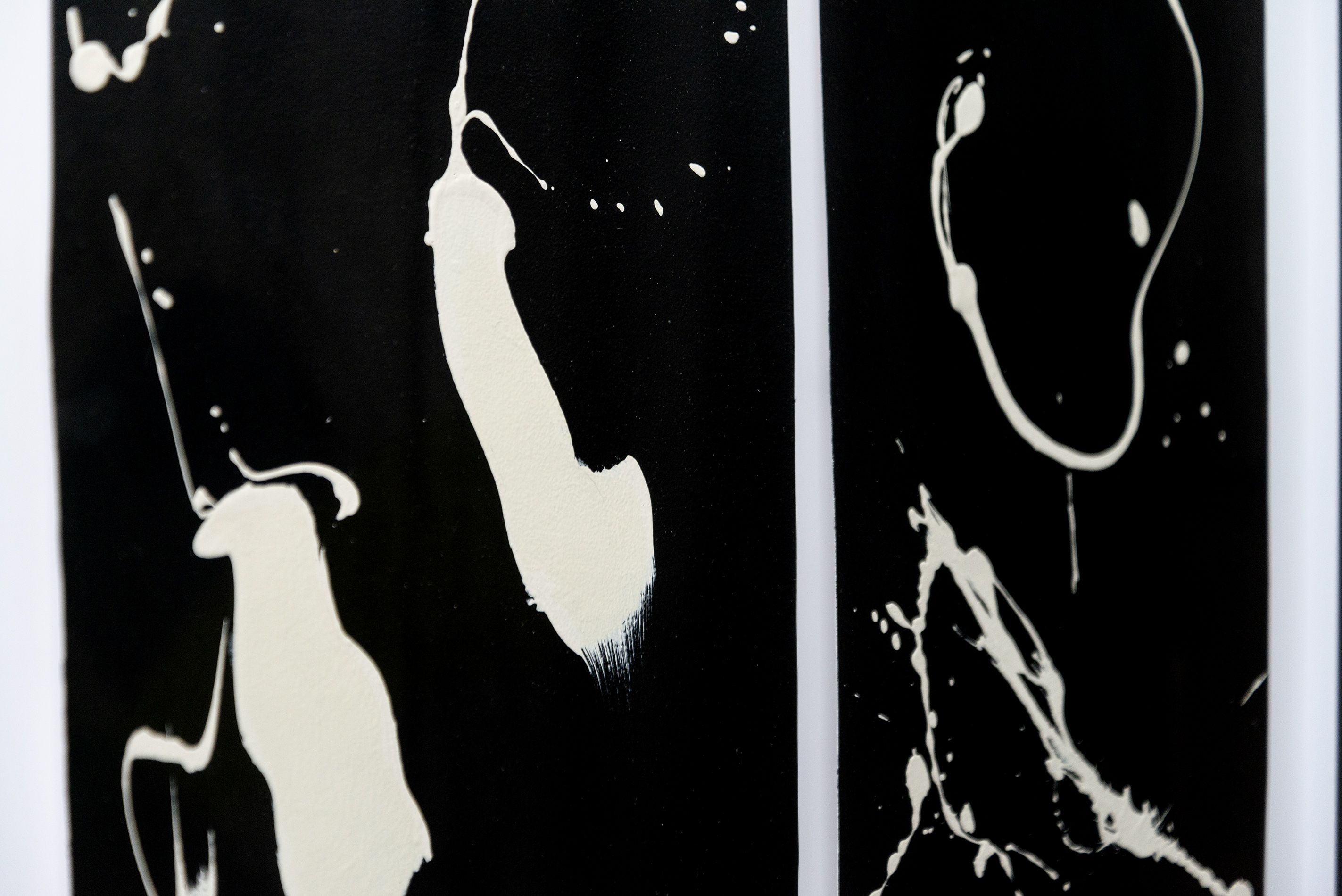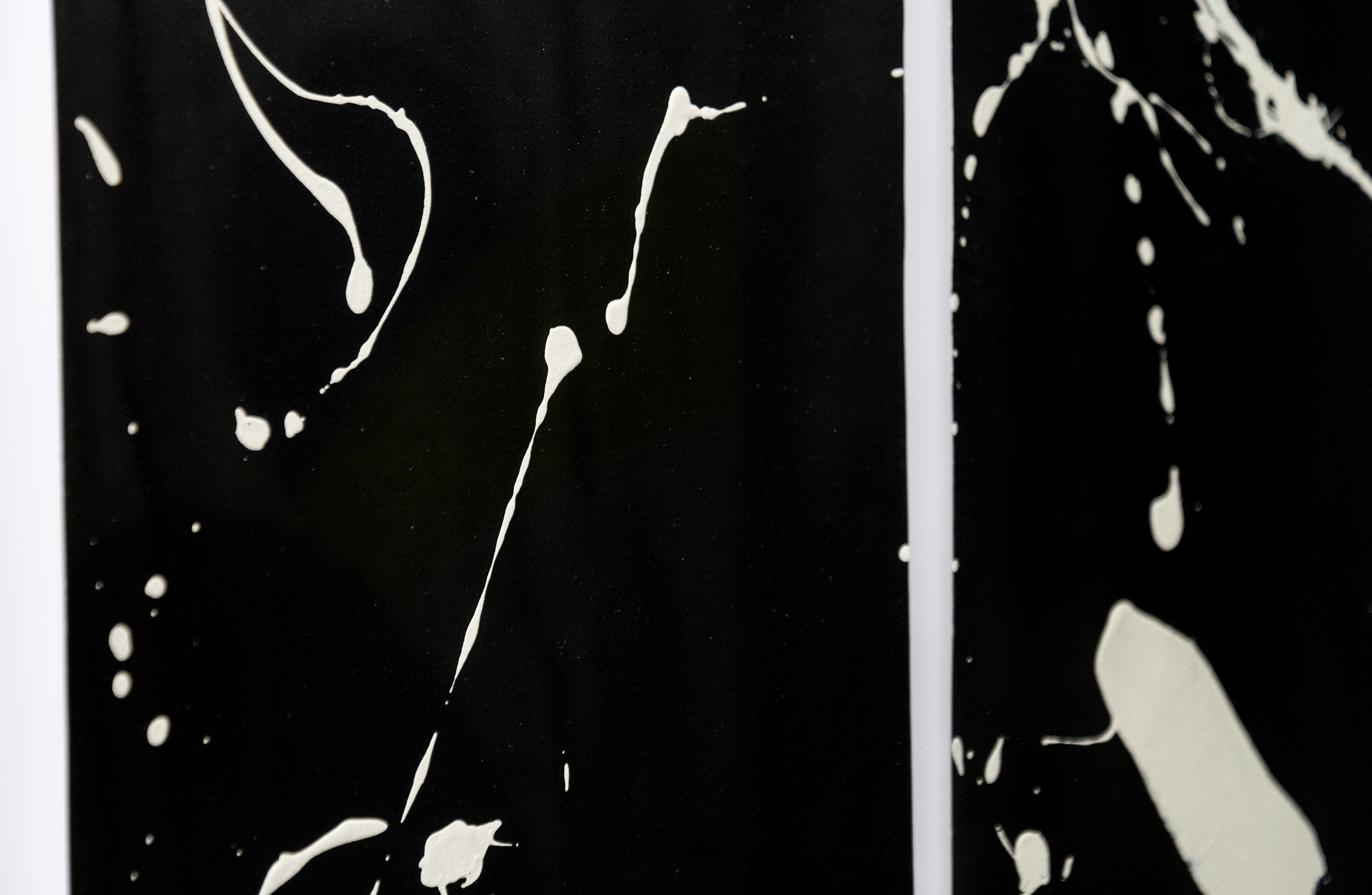 Toronto artist Lynne Fernie prefers working in black and white. She enjoys the pure pleasure of drawing, the first art form she began to work in. Drawing 3 & 4, two panels of jet black with detailed white markings, are part of an intriguing series she created in ink, latex and acrylic.“I think I might be a bit like a writer who faces a blank page. You know you have an idea…What happens when I put the first line on is how the drawing progresses. It’s more like a kind of visual intellect.” Lynne Fernie