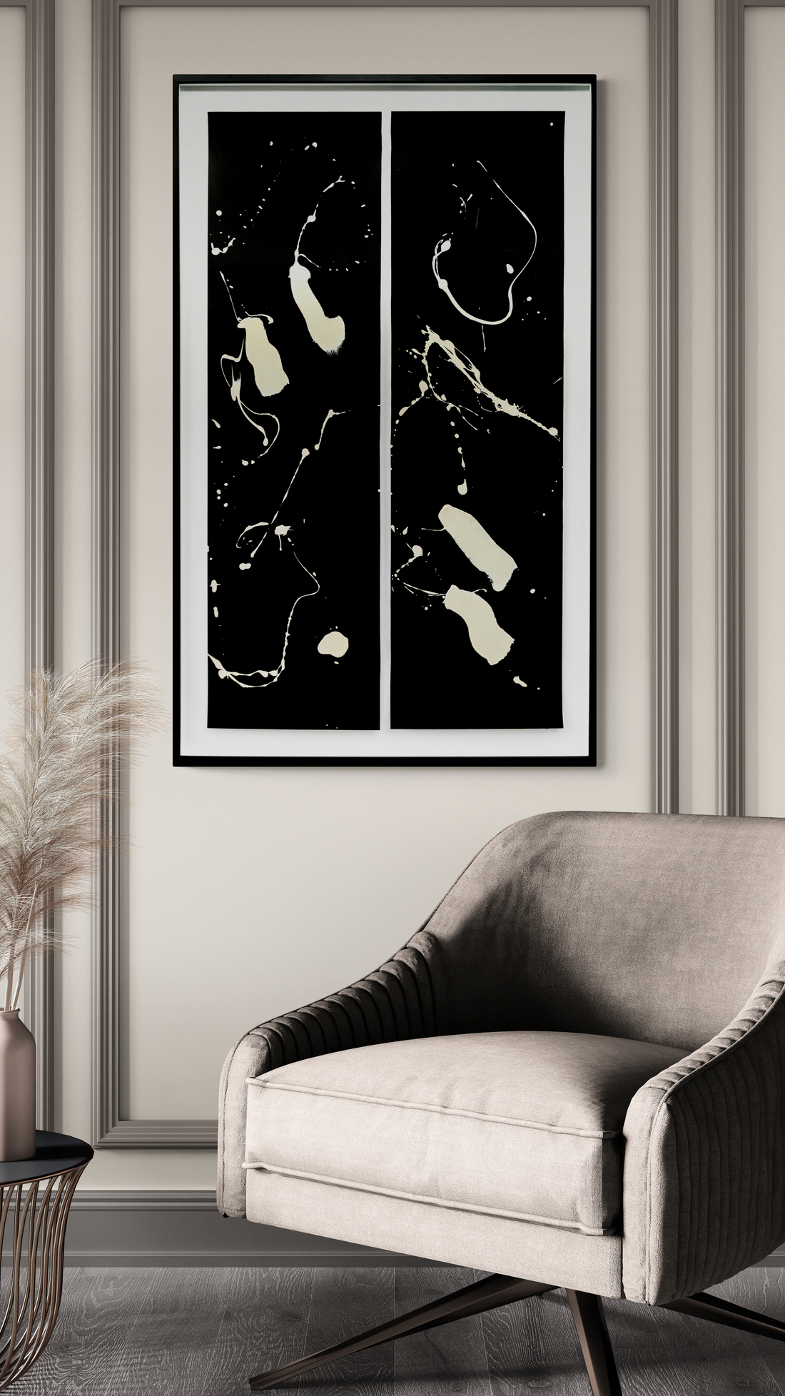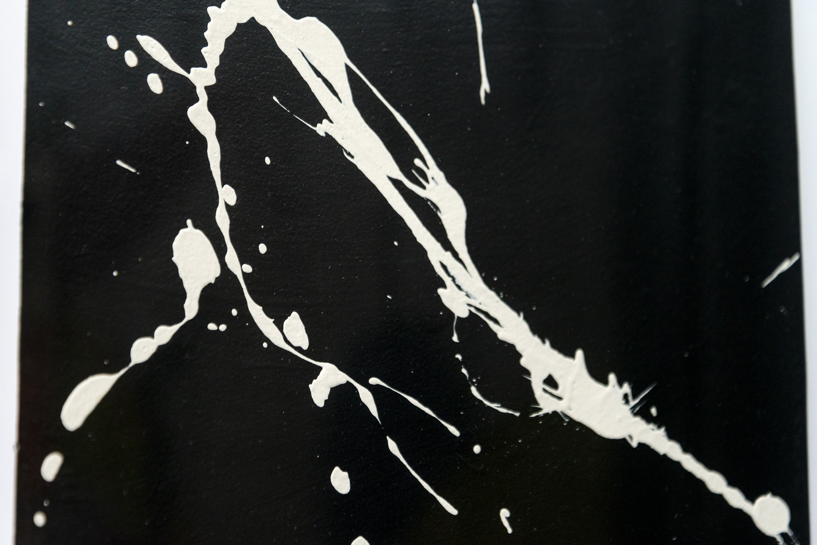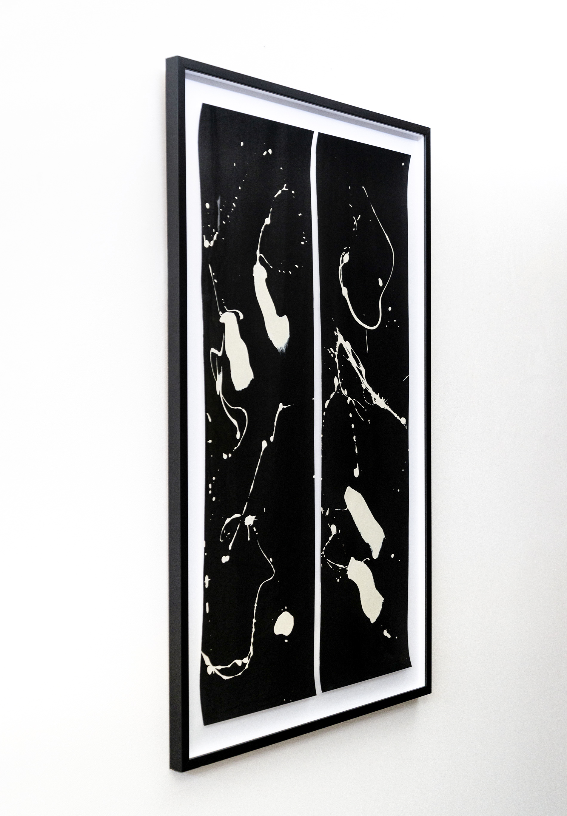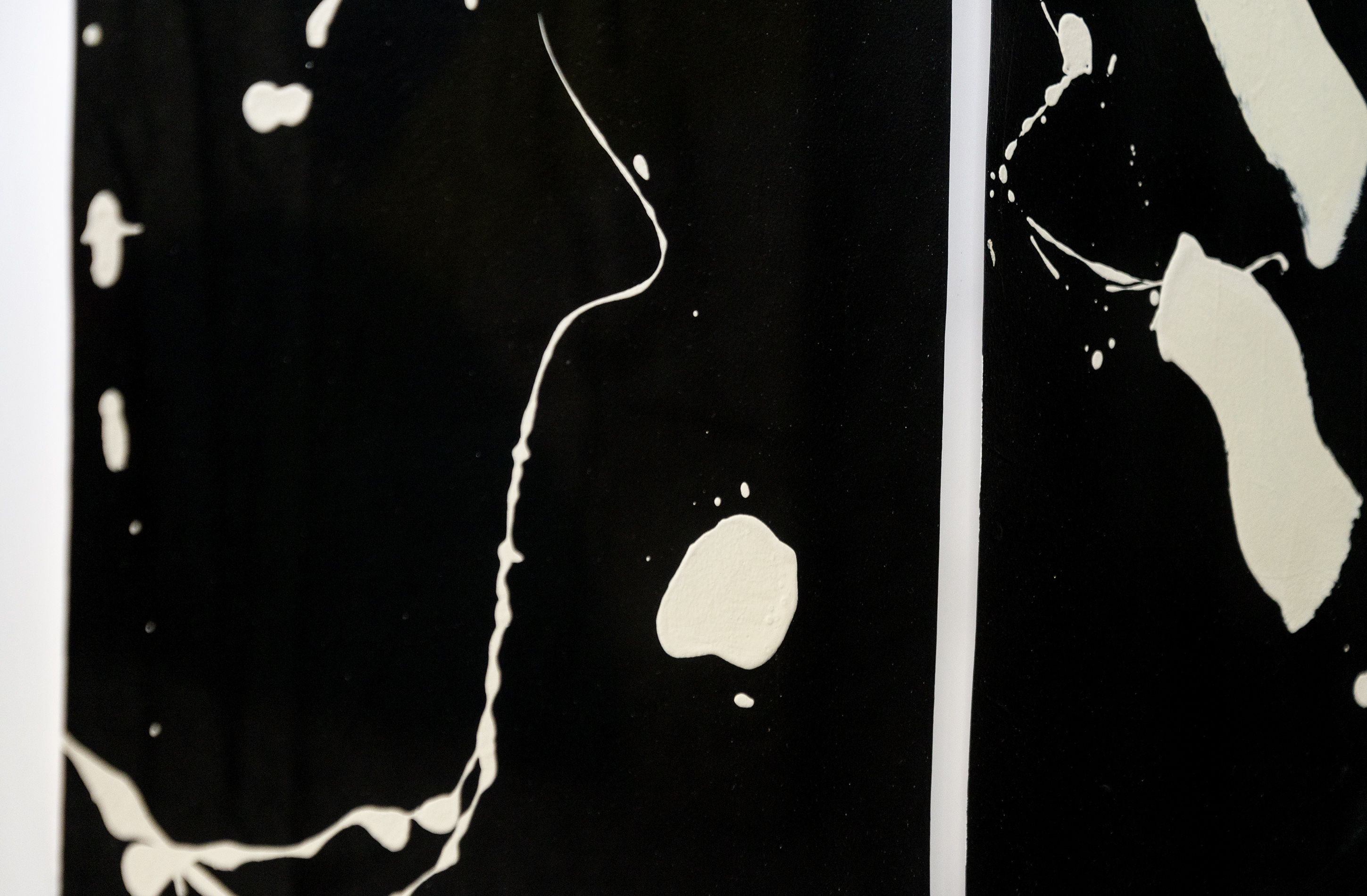 Toronto artist Lynne Fernie prefers working in black and white. She enjoys the pure pleasure of drawing, the first art form she began to work in. Drawing 3 & 4, two panels of jet black with detailed white markings, are part of an intriguing series she created in ink, latex and acrylic.“I think I might be a bit like a writer who faces a blank page. You know you have an idea…What happens when I put the first line on is how the drawing progresses. It’s more like a kind of visual intellect.” Lynne Fernie