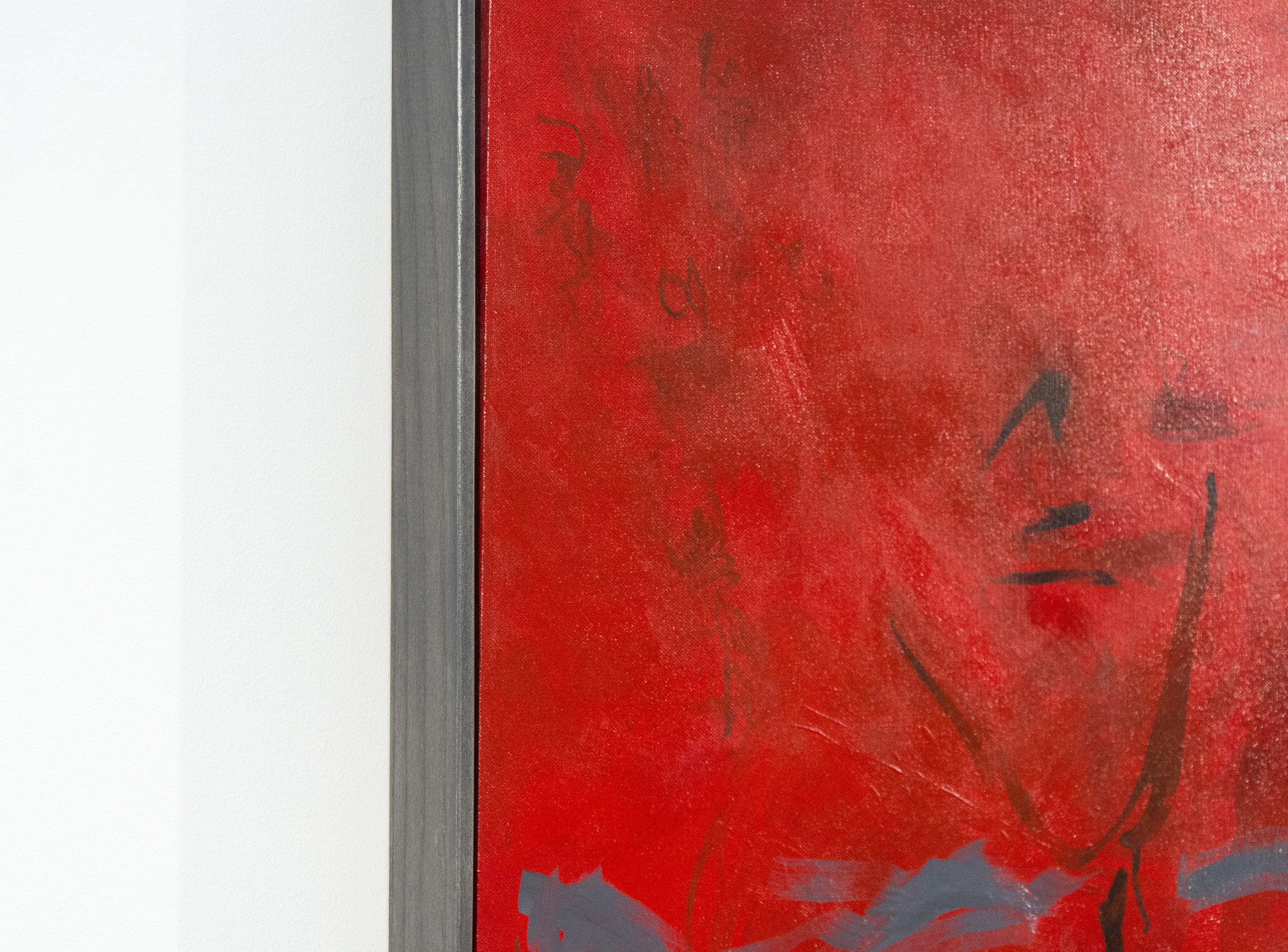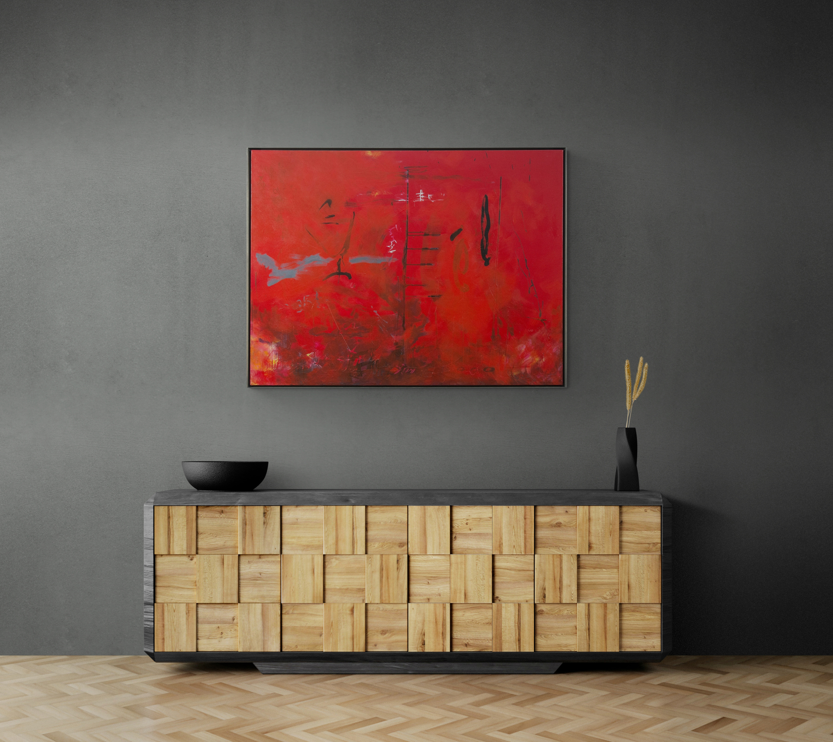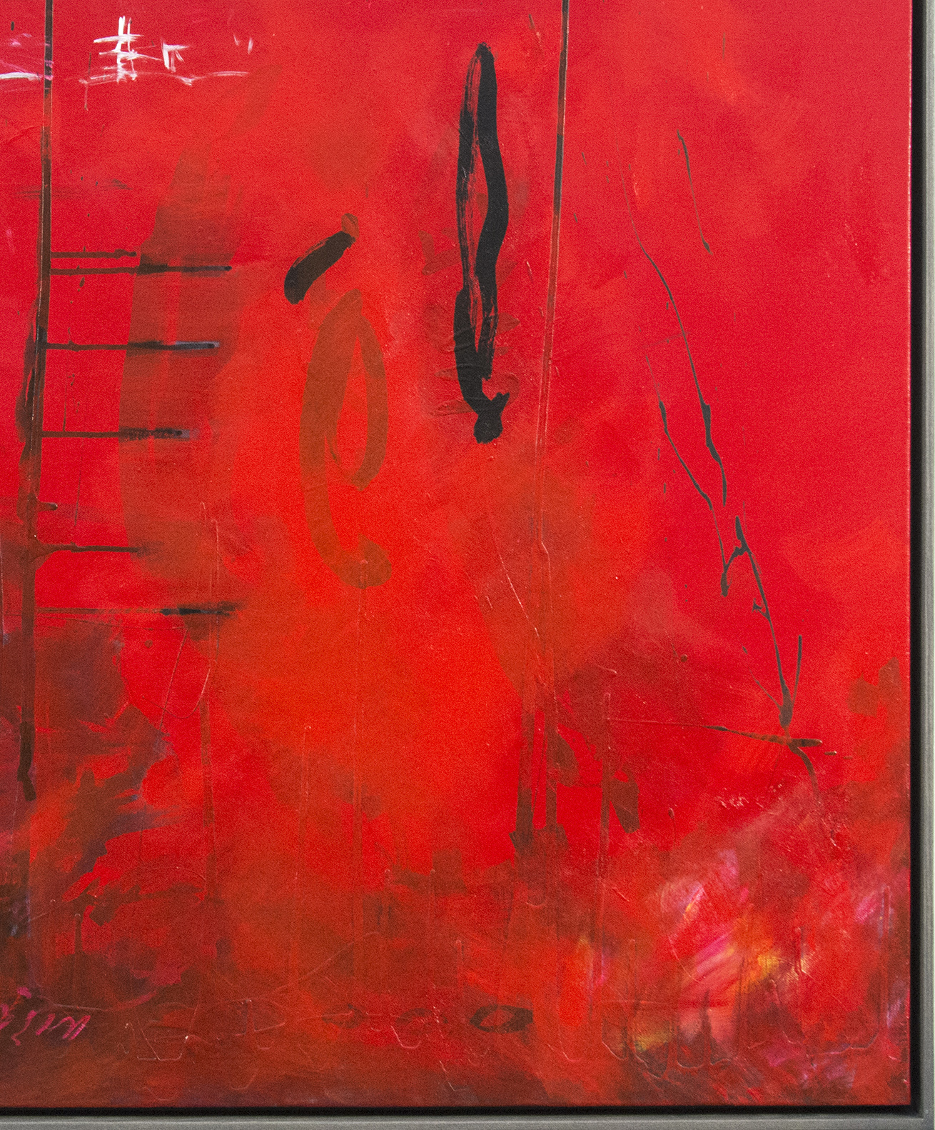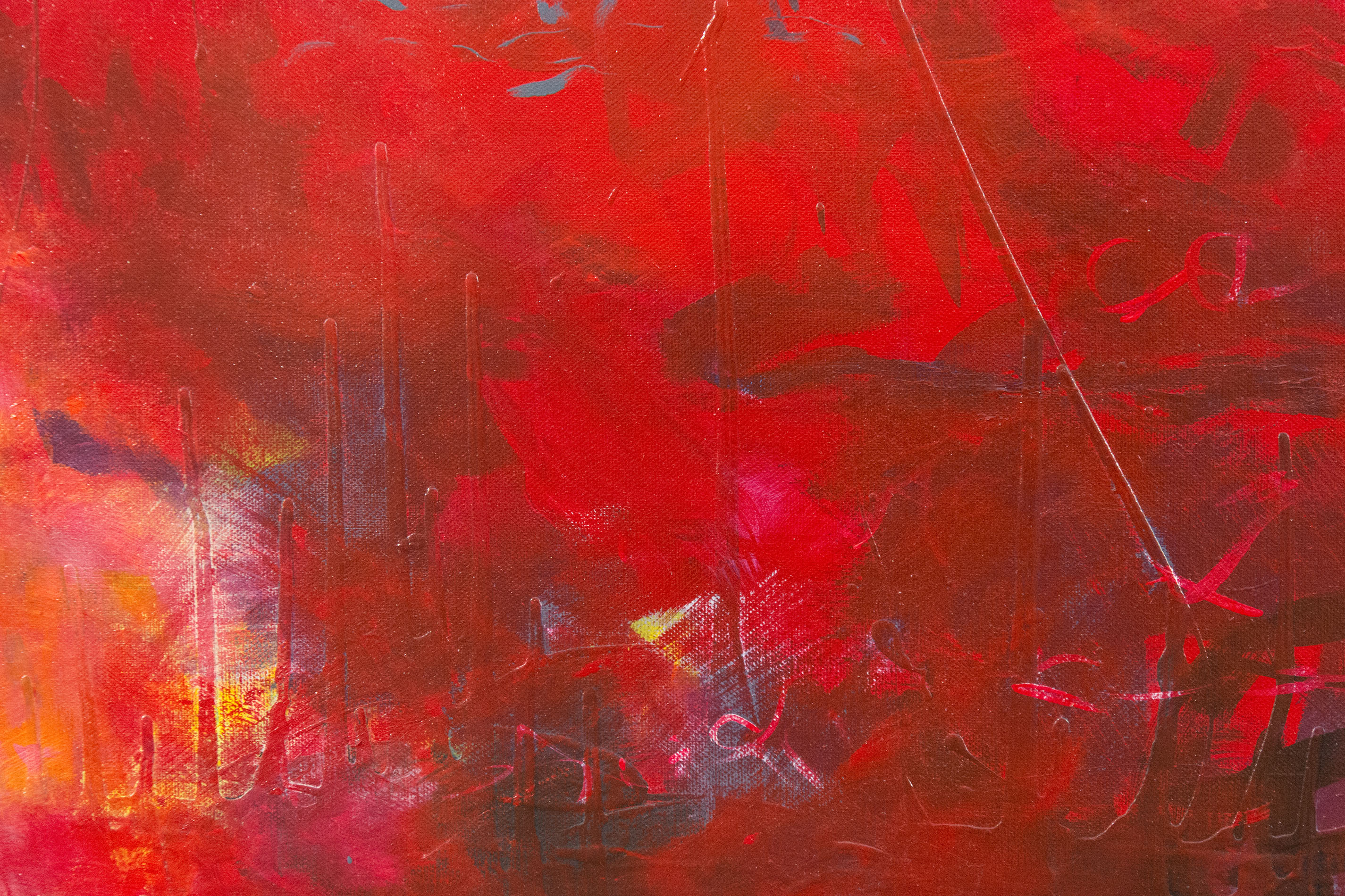 This contemporary abstract painting is rendered in red and black.The pure emotion of saturated colour—a fiery red provides a dynamic backdrop for this graphic acrylic painting by Canadian interdisciplinary artist, Lynne Fernie. Expressive dashes of charcoal and black appear to dance across the canvas. Additional markings in turquoise, yellow, white and pink add intriguing detail and contrast. The shapes and characters in this work also appear to reference the elegant simplicity of Japanese calligraphy and primitive figurative imagery.
