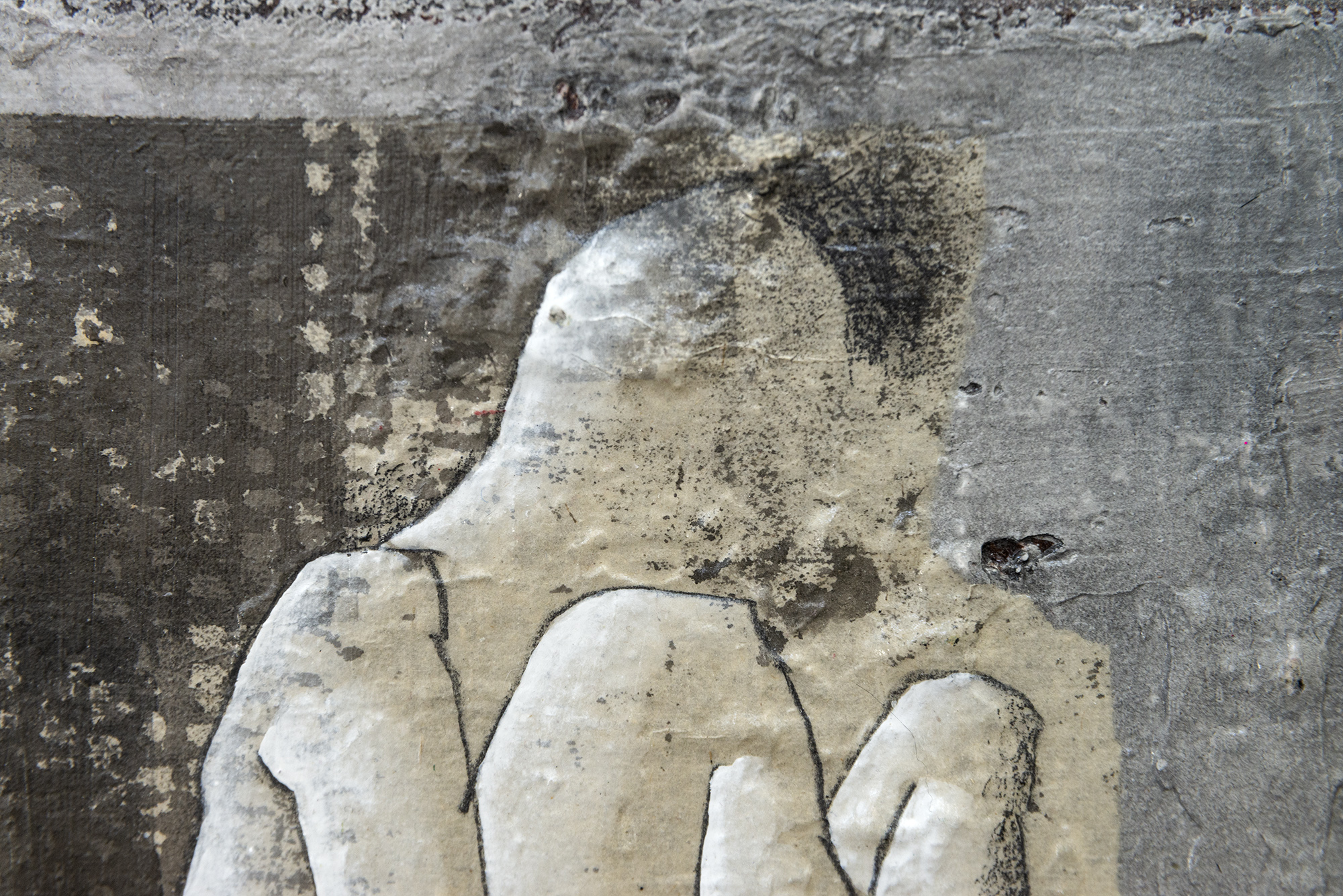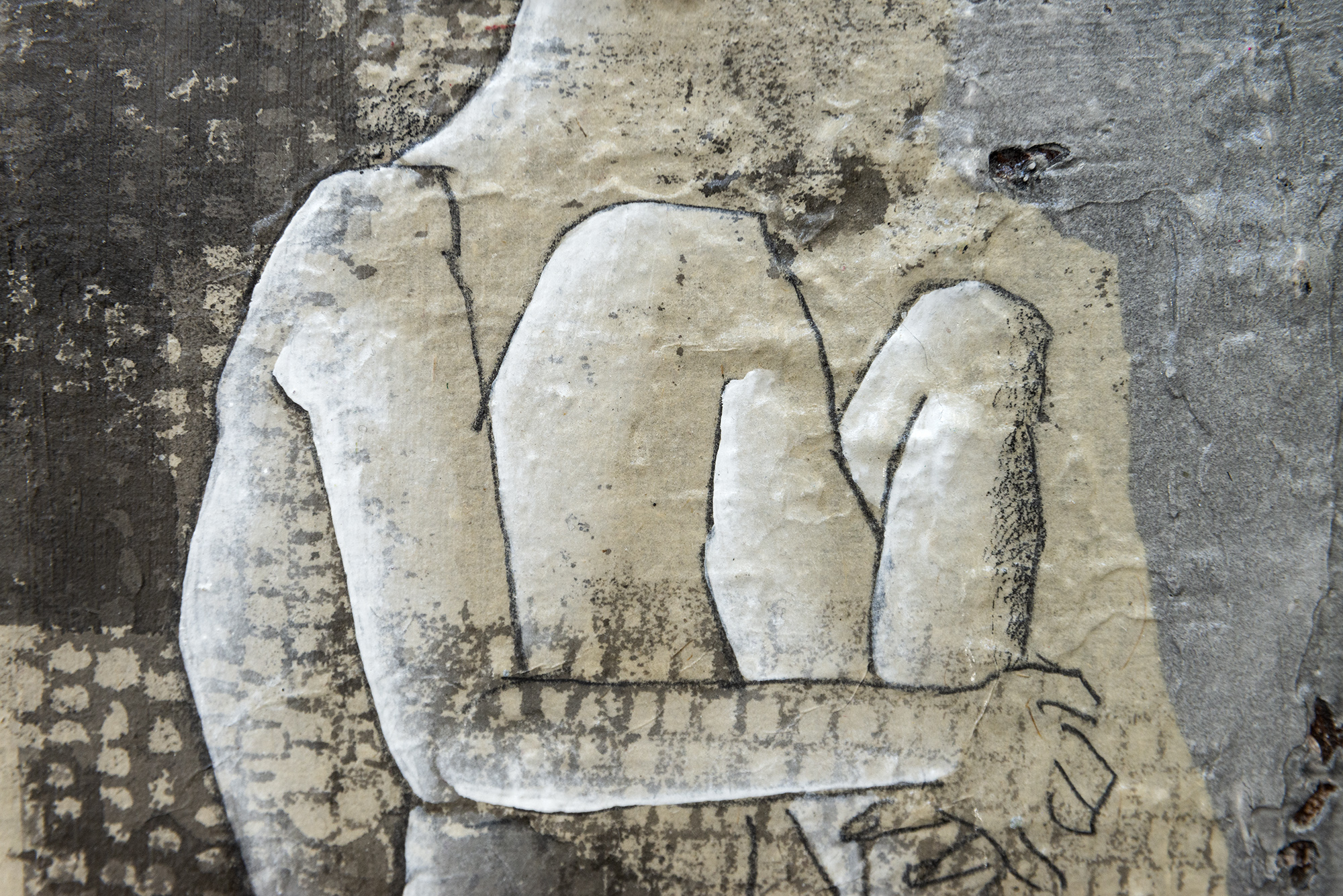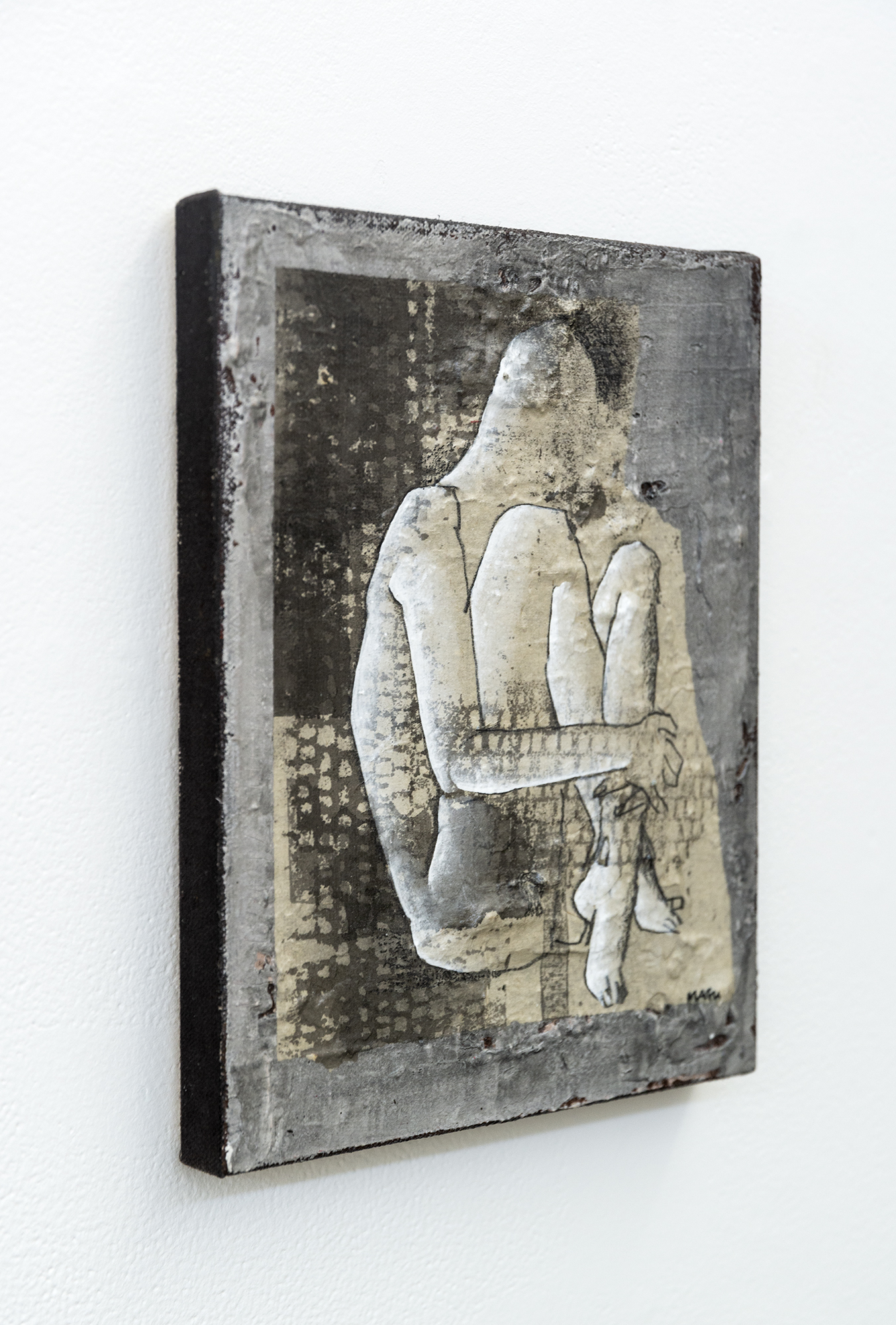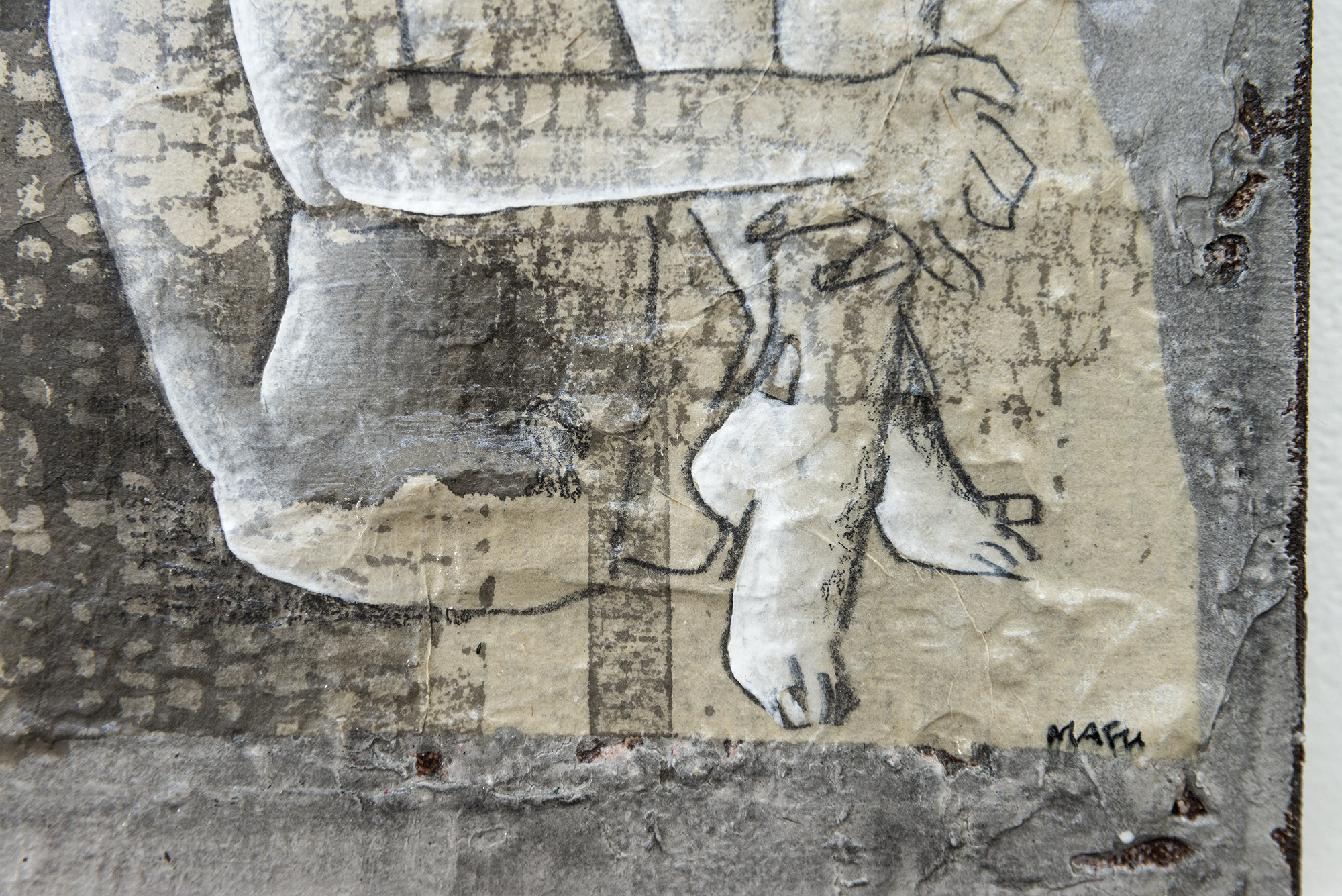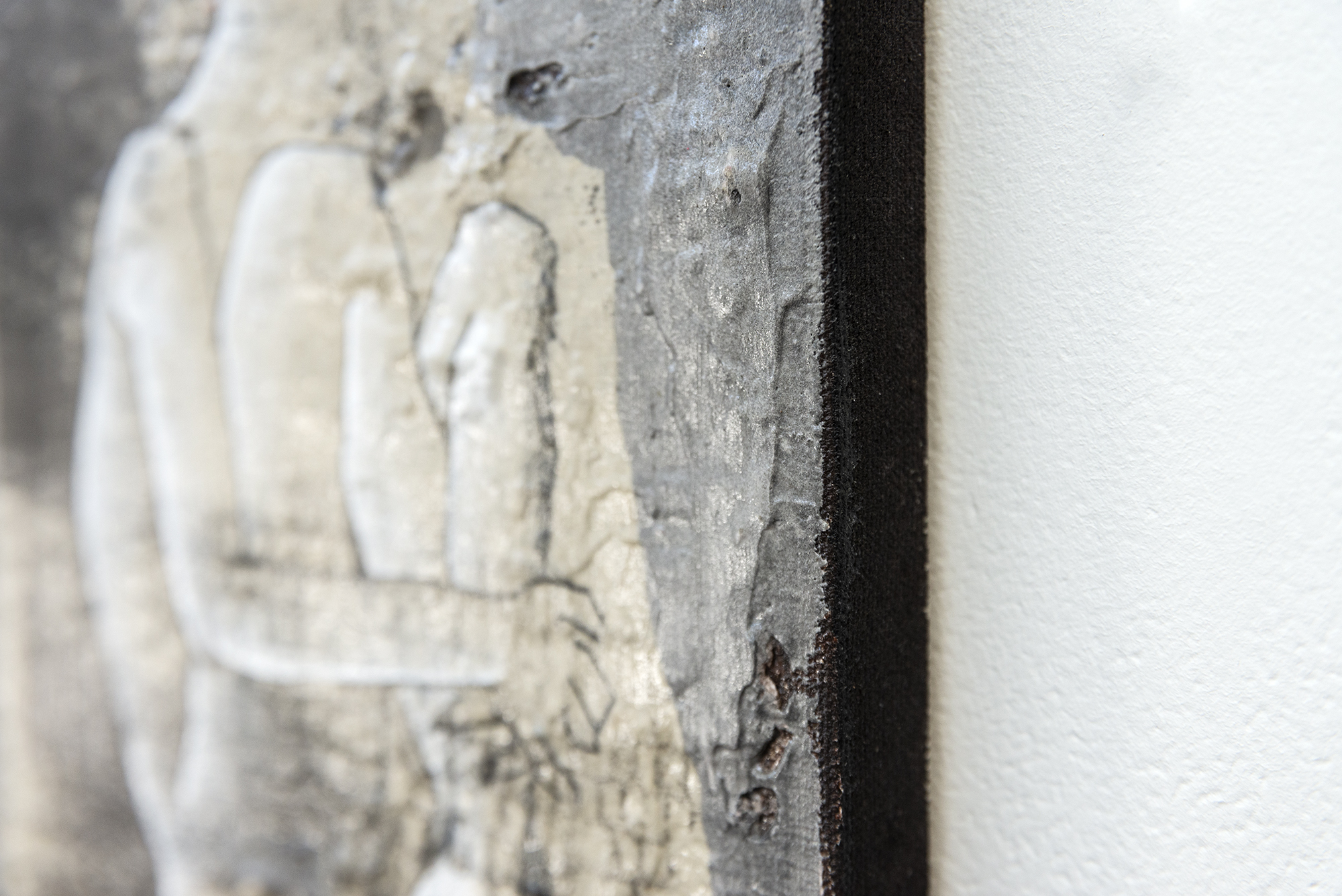 This contemporary figurative nude painting is by an Asian artist.His artwork has been sold at the prestigious 175-year-old Waddington’s Auction house in Toronto. Mafu Jiang’s contemporary compositions are rooted in his rich Chinese heritage. This is one of a series of acrylic paintings that features a naked, faceless male figure sitting cross-legged with his arms wrapped around his knees. Rendered in a neutral palette of creamy whites, gray and black, the surface is visibly textured. The patterned backdrop belies Jiang’s education as a graphic designer.