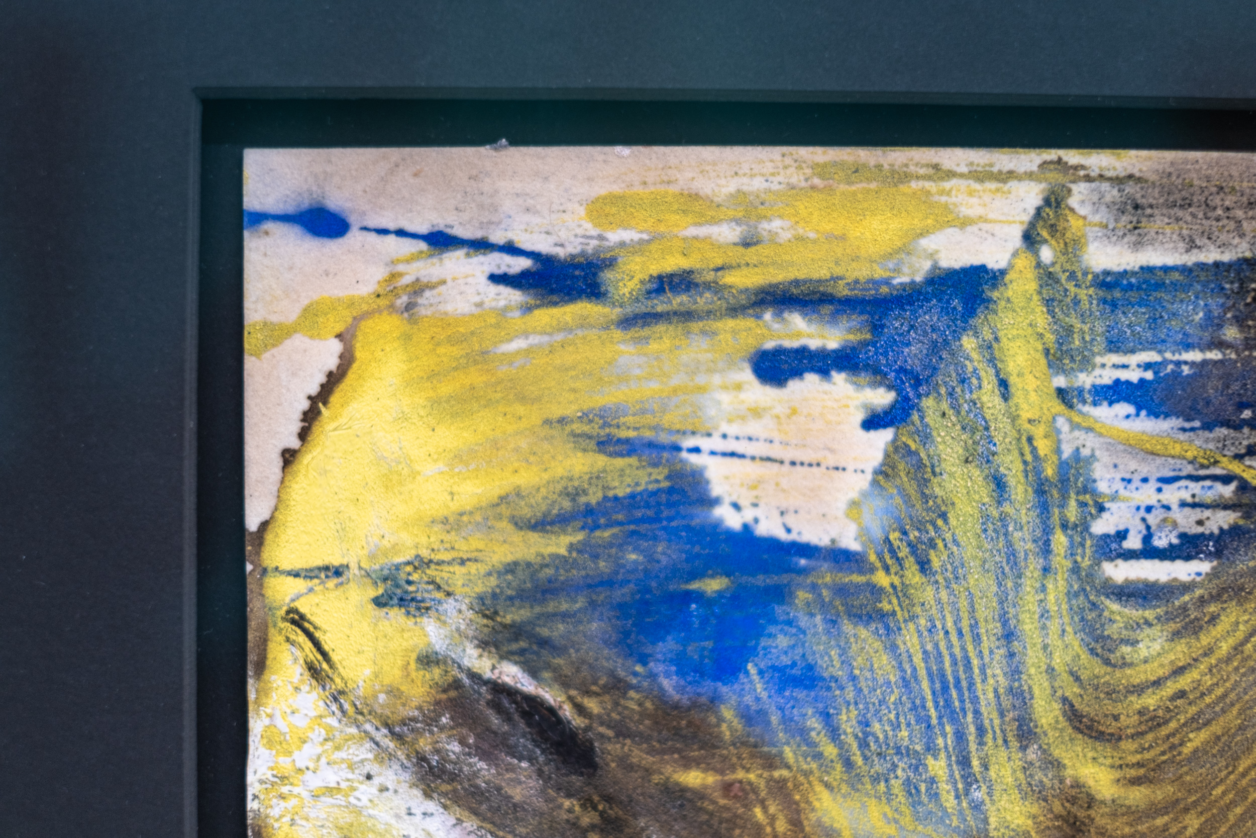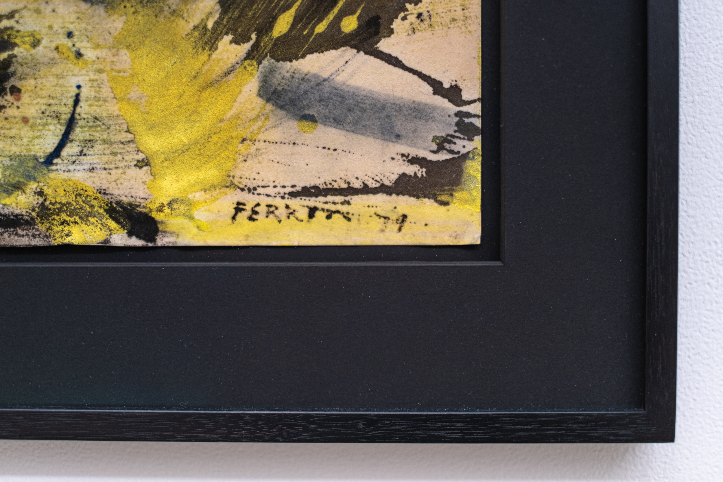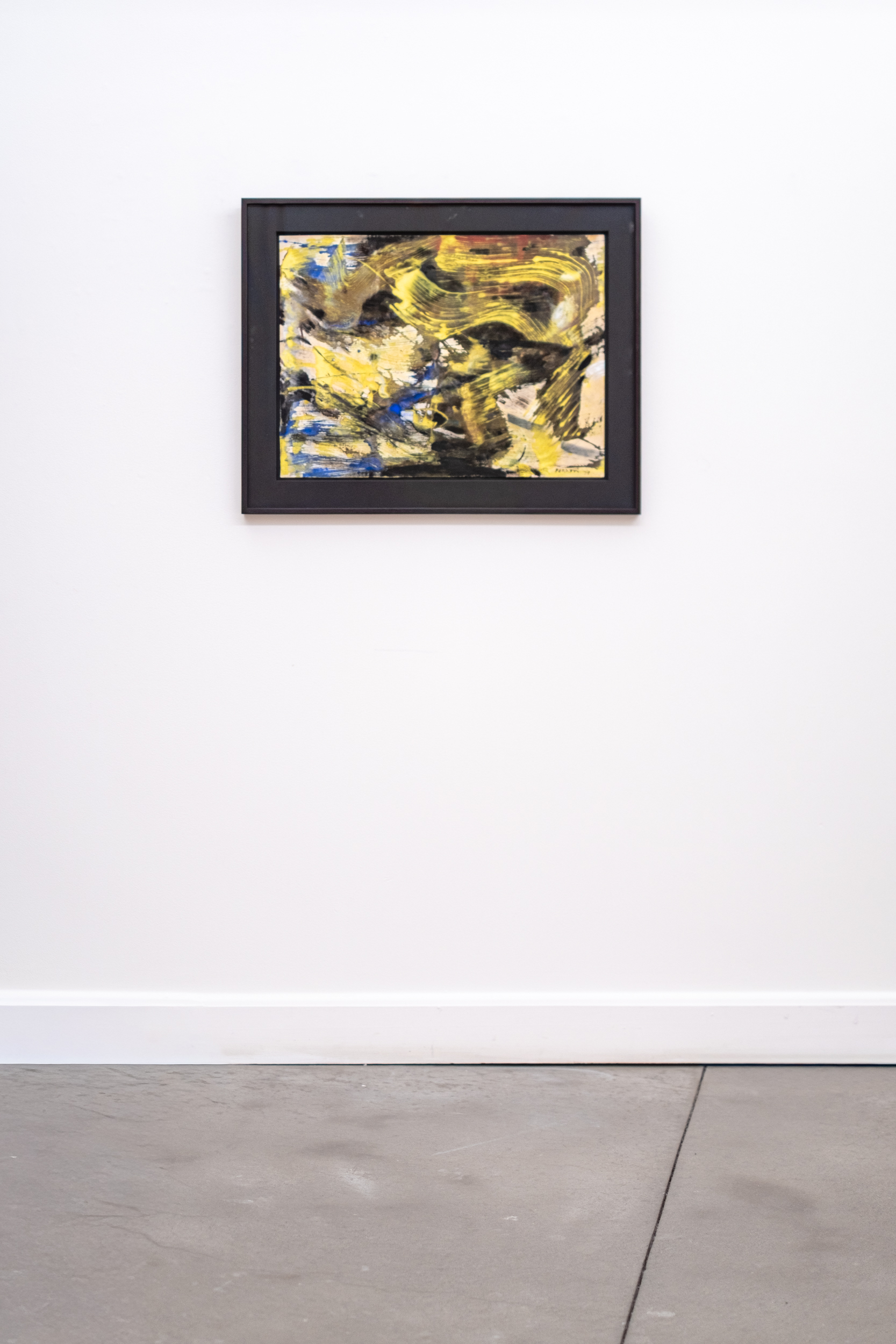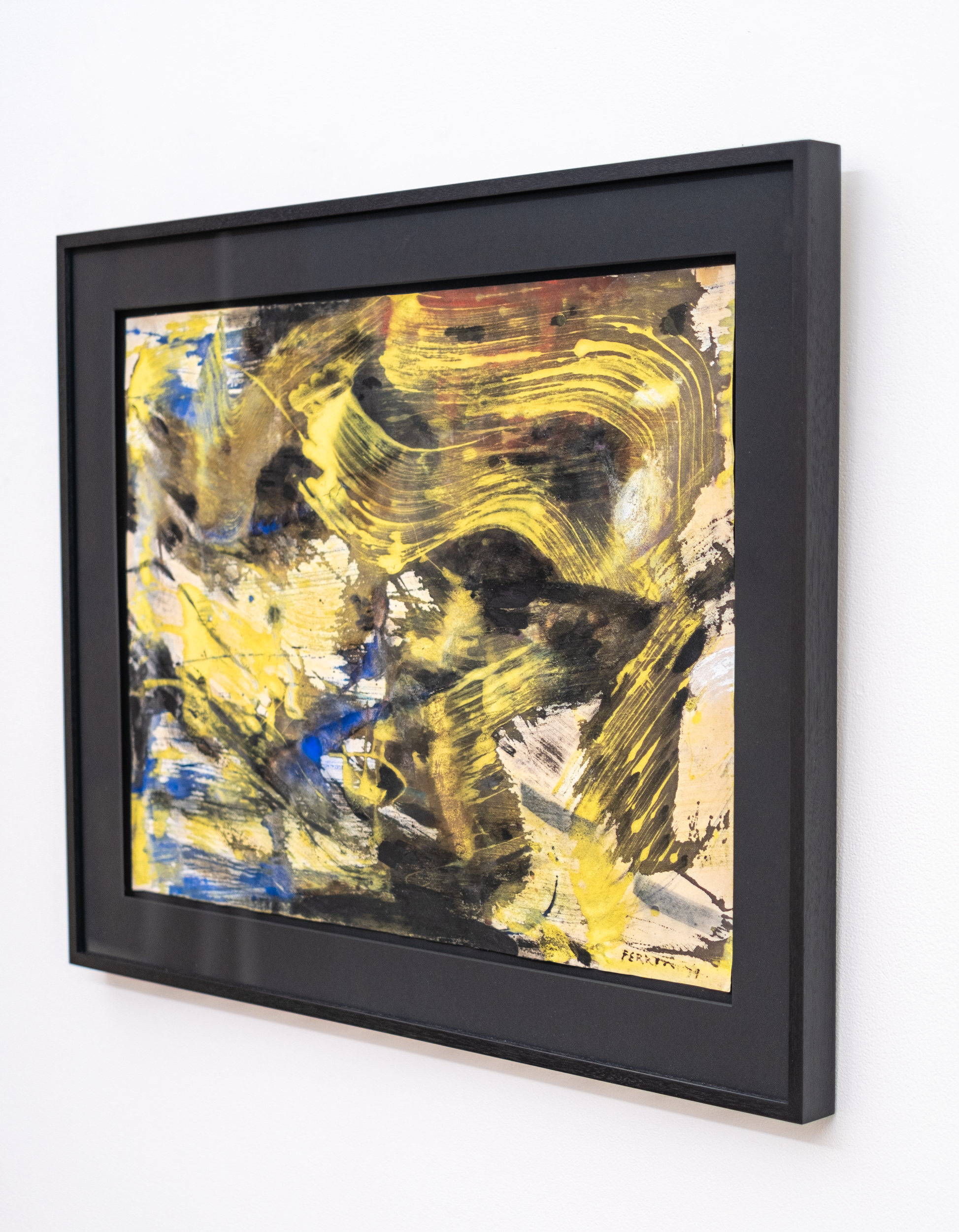 This contemporary abstract painting on paper is from iconic artist Marcelle Ferron.Marcelle Ferron is an important Quebec artist who is perhaps best known both here and internationally for her profoundly beautiful and luminous work in stained glass. A modernist who chose to explore abstraction in both her luminous work in glass and in painting, Sans titre is a fine example of her remarkable sense of gestural form and colour. In this dynamic and elegant piece, passages of bright yellow and deep blue swirl around the paper, grounded by earth tones and flashes of white and red. The energy is palpable.