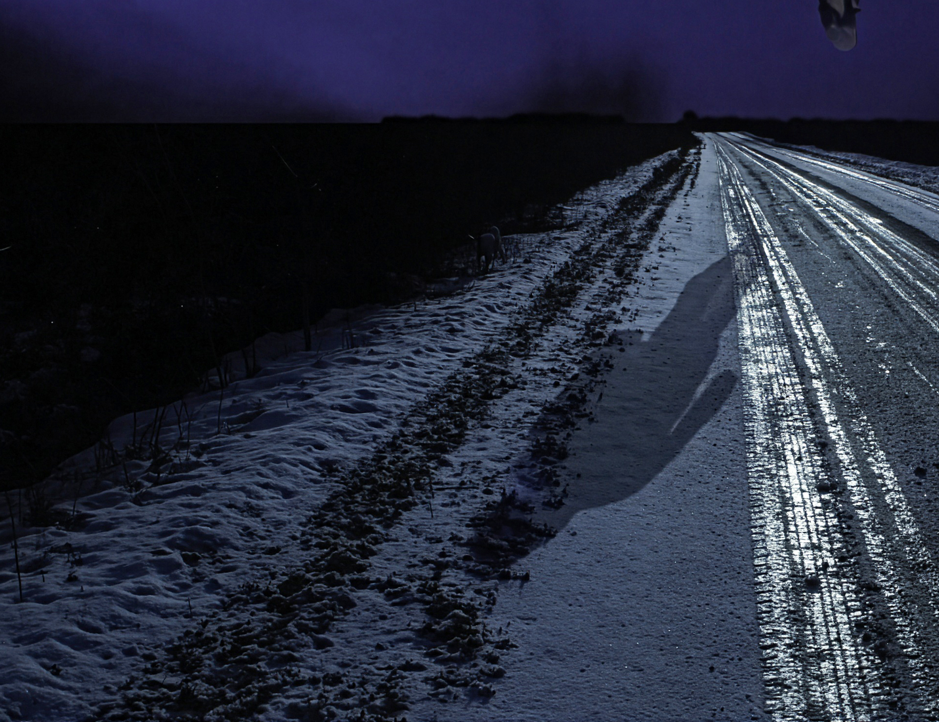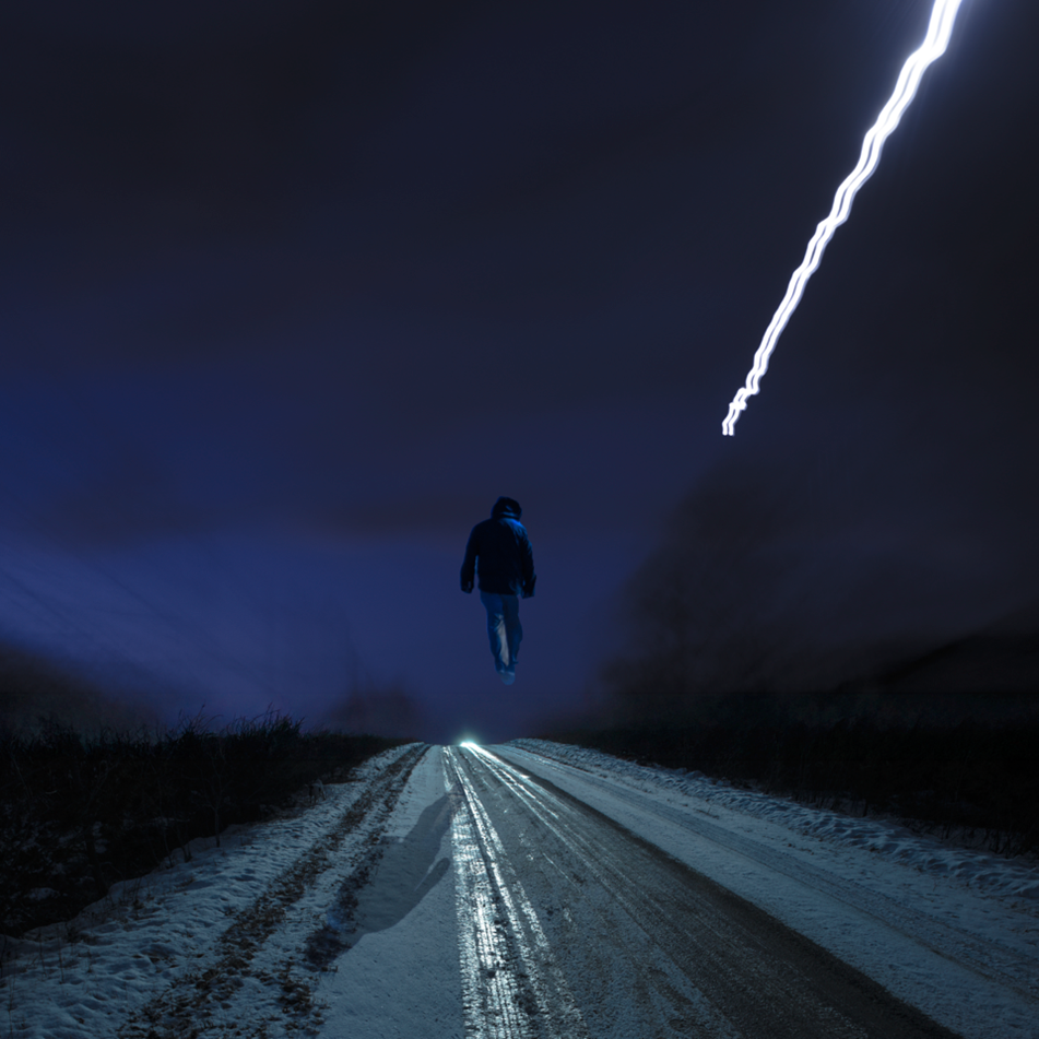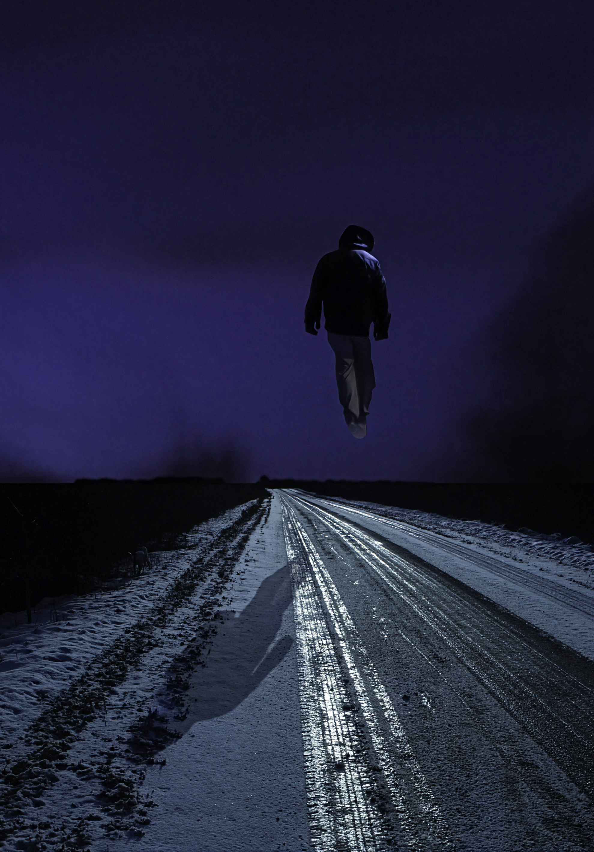 This contemporary photograph by Mark Bartkiw of a figure walking in the countryside in winter is surreal.On a dark snow-covered desolate country road, a lone male figure walking away from the viewer appears to be floating in mid-air. What looks like a double bolt of electricity streaks across the deep blue of the night sky. Bright headlights from an approaching car illuminates the icy white snow and the figure’s shadow appears in the foreground. It’s a fantastical scene, typical of Mark Bartkiw’s incredible dream-like imagery—often surreal—in both content and colour. The Toronto photographer is fascinated with the idea of slightly skewing reality and creating imaginary worlds. He uses a variety of techniques—a collage of images to accomplish this compelling visual effect. One of a series called ‘Uncommonplace.’