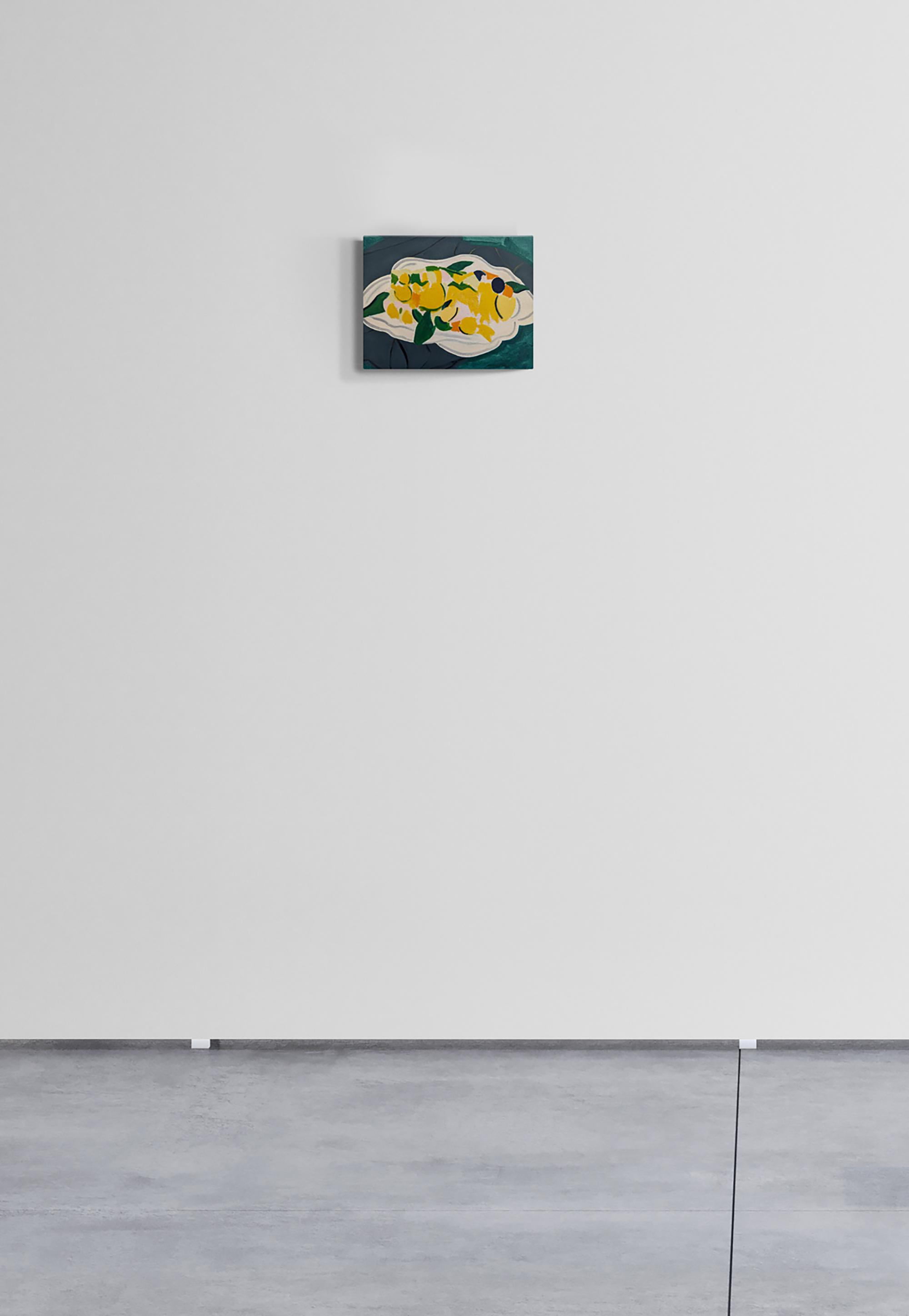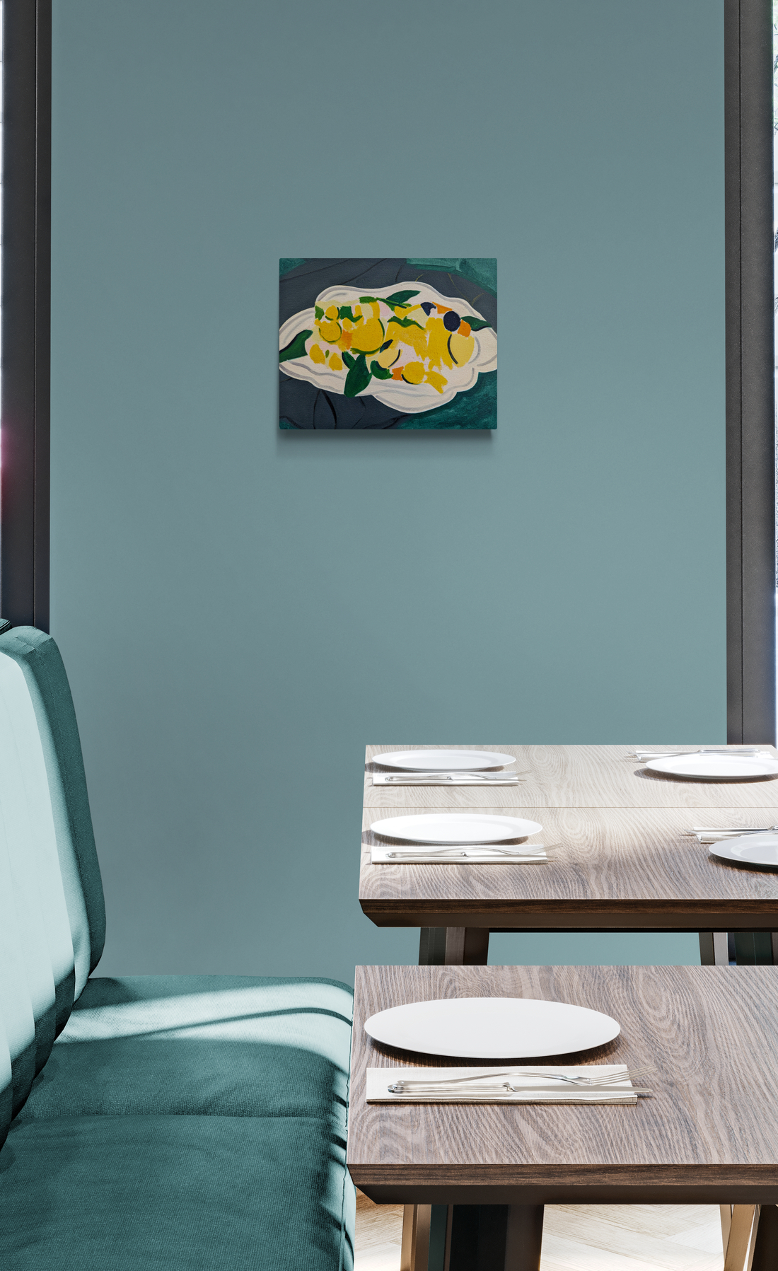 A traditional still life is re-imagined in this delightful painting by Mel Davis. The Montreal-born artist creates abstract artwork that re-imagines traditionally familiar themes in a fresh, contemporary way. The colour palette in bright yellow, orange and green pops against the white, dark gray and teal background. Her work is reminiscent of the fabled French 20th-century artist Matisse known for his colourful and fluid style. Davis uses colour, texture, pattern and form—in her own uniquely engaging work.“I explore the space between what is familiar and what still can be mysterious. My work questions if we can find new and relevant areas of study in what is traditional.” Mel Davis