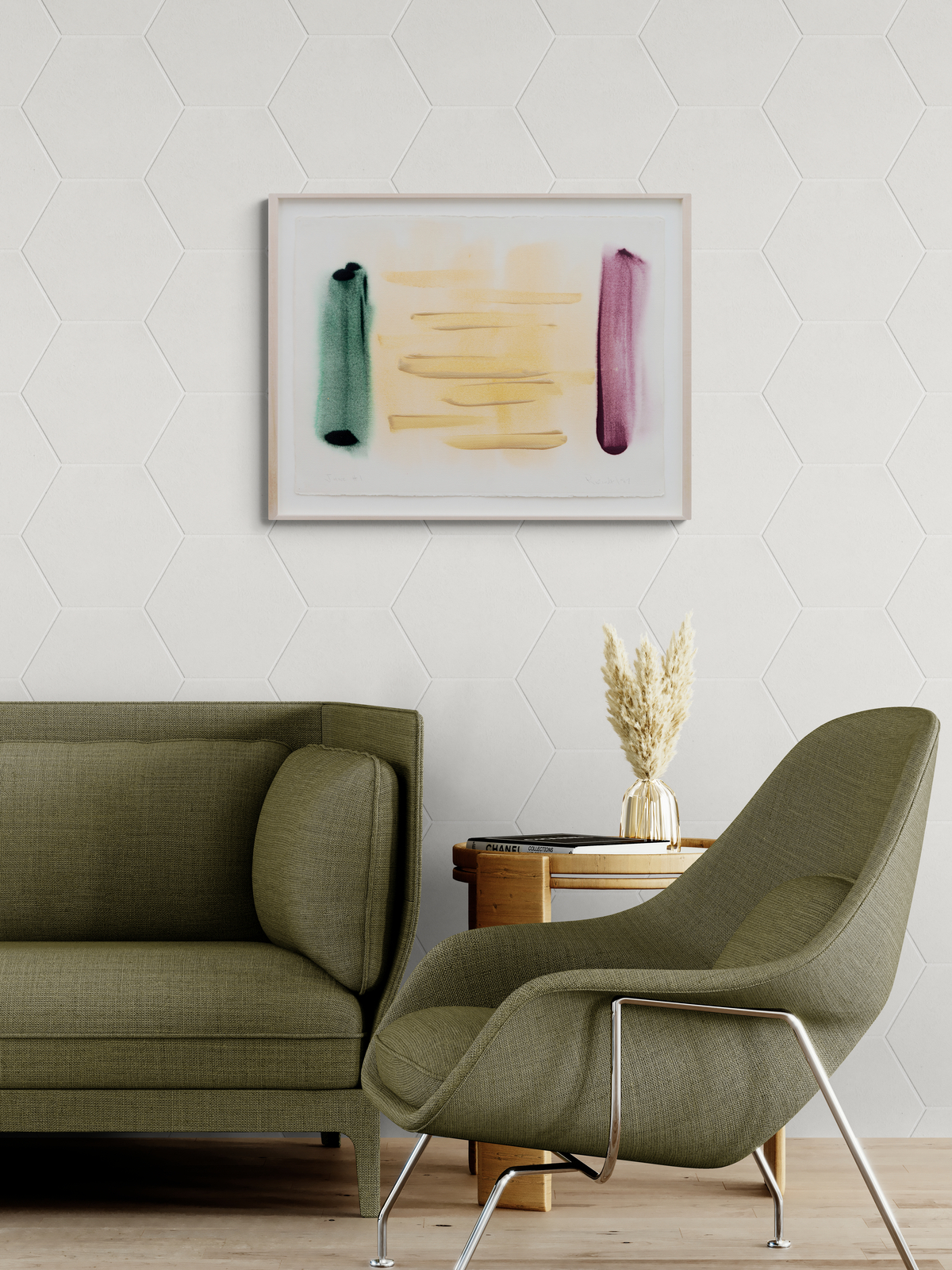 This colourful work on paper heralds from the 1980’s. The influence of the grid as a guide for form is still evident here. And there is an elegant symmetry to the use of expressive brushstrokes…both horizontal and vertical that convey a palpable energy. The summery palette—modern and fresh is rendered in a deep green, burgundy and golden yellow.