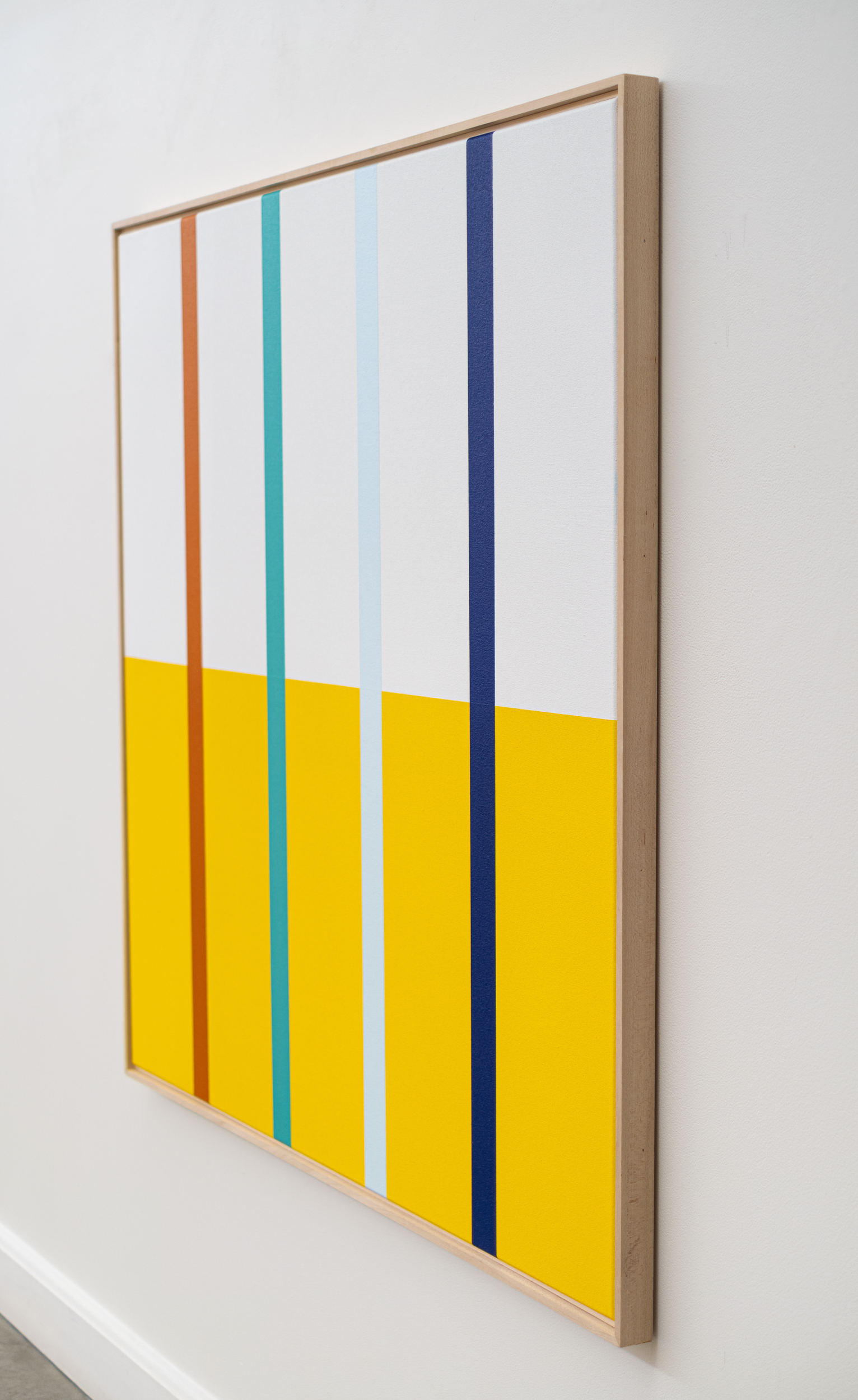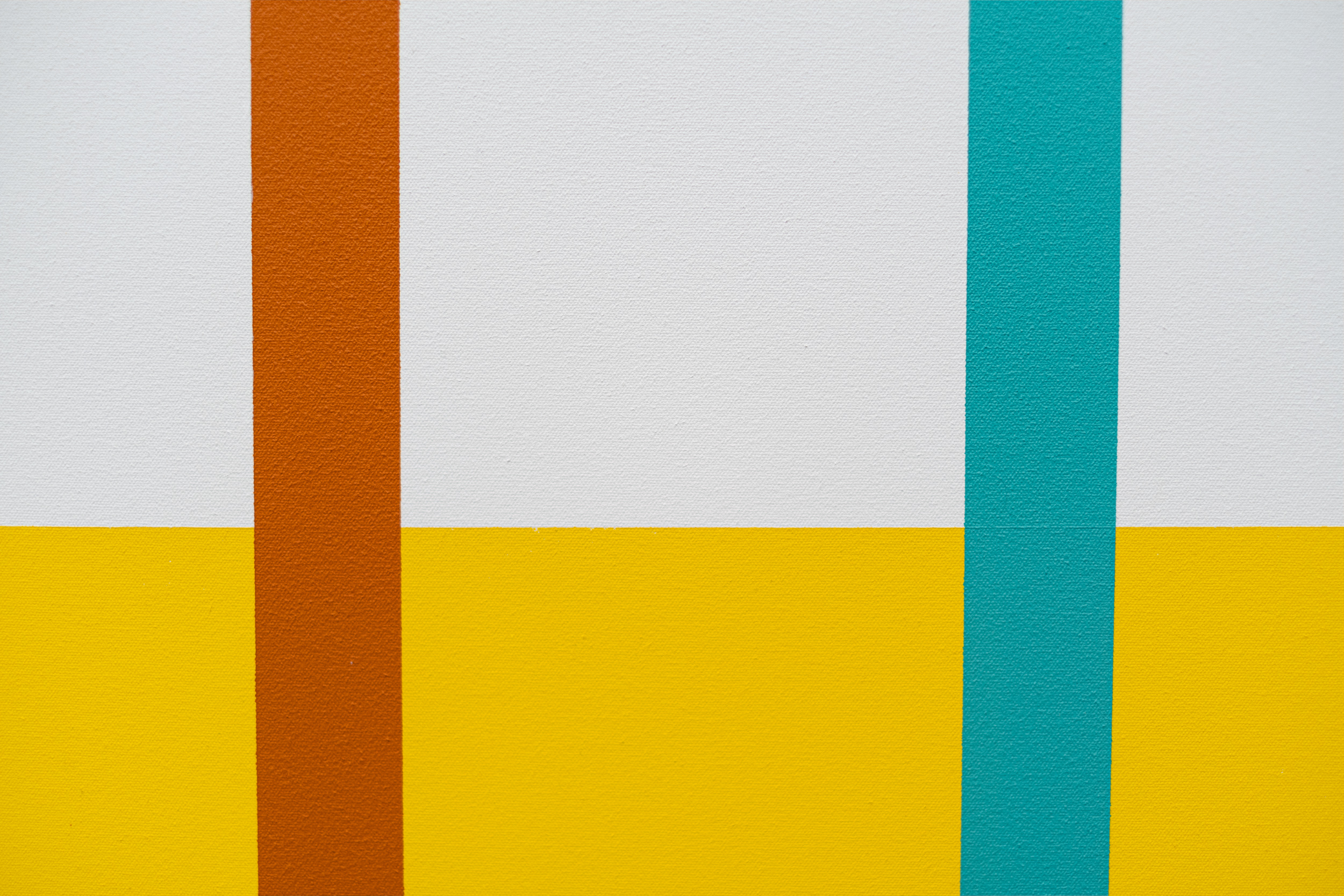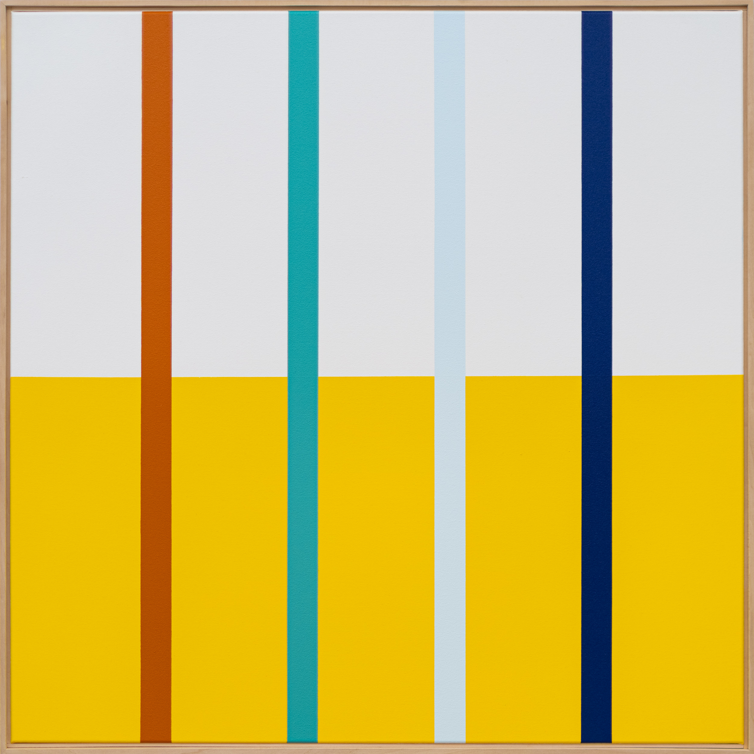 This colourful contemporary abstract landscape painting is by Milly Ristvedt.In this dynamic new work by Milly Ritsvedt, several bold vertical bands of pure colour run the length of the painting, which is divided into two horizontal hemispheres. Ristvedt’s choice of colours in this hard-edged piece is striking—orange, turquoise, white, and navy blue that pop against the bright white and yellow backdrop. The crisp, clean lines of hard-edged paintings emphasize the flatness of the canvas and draw the viewer’s eye to the simple geometric shapes that make a bold statement.