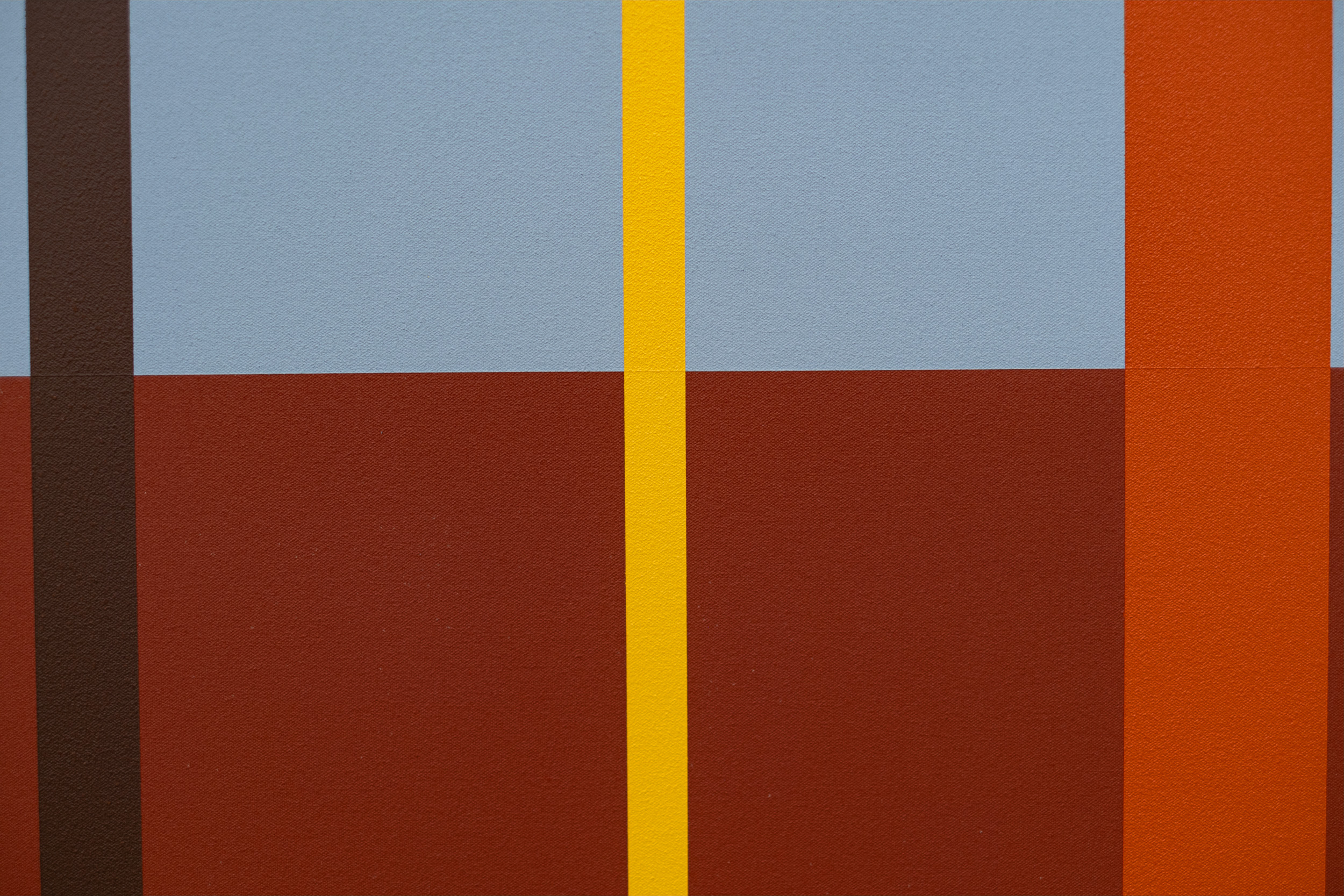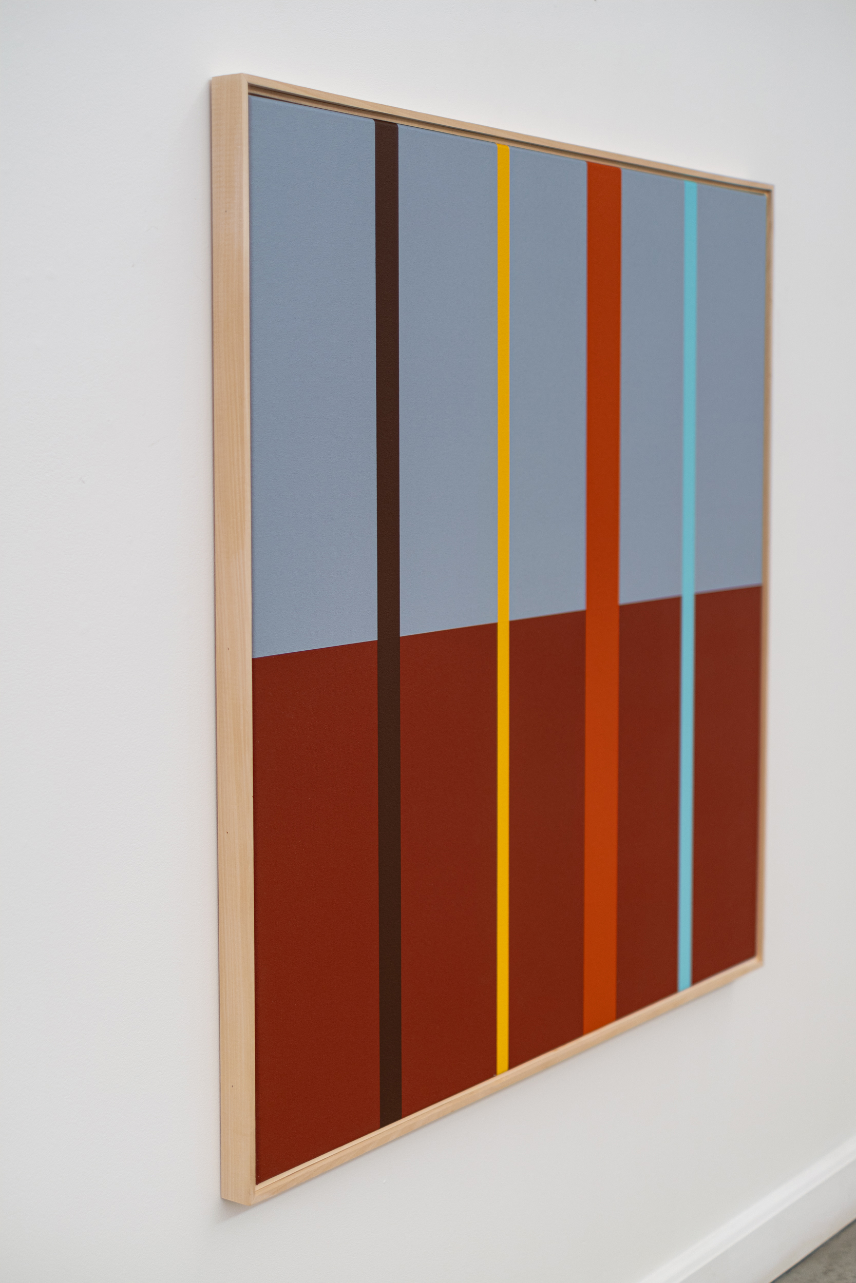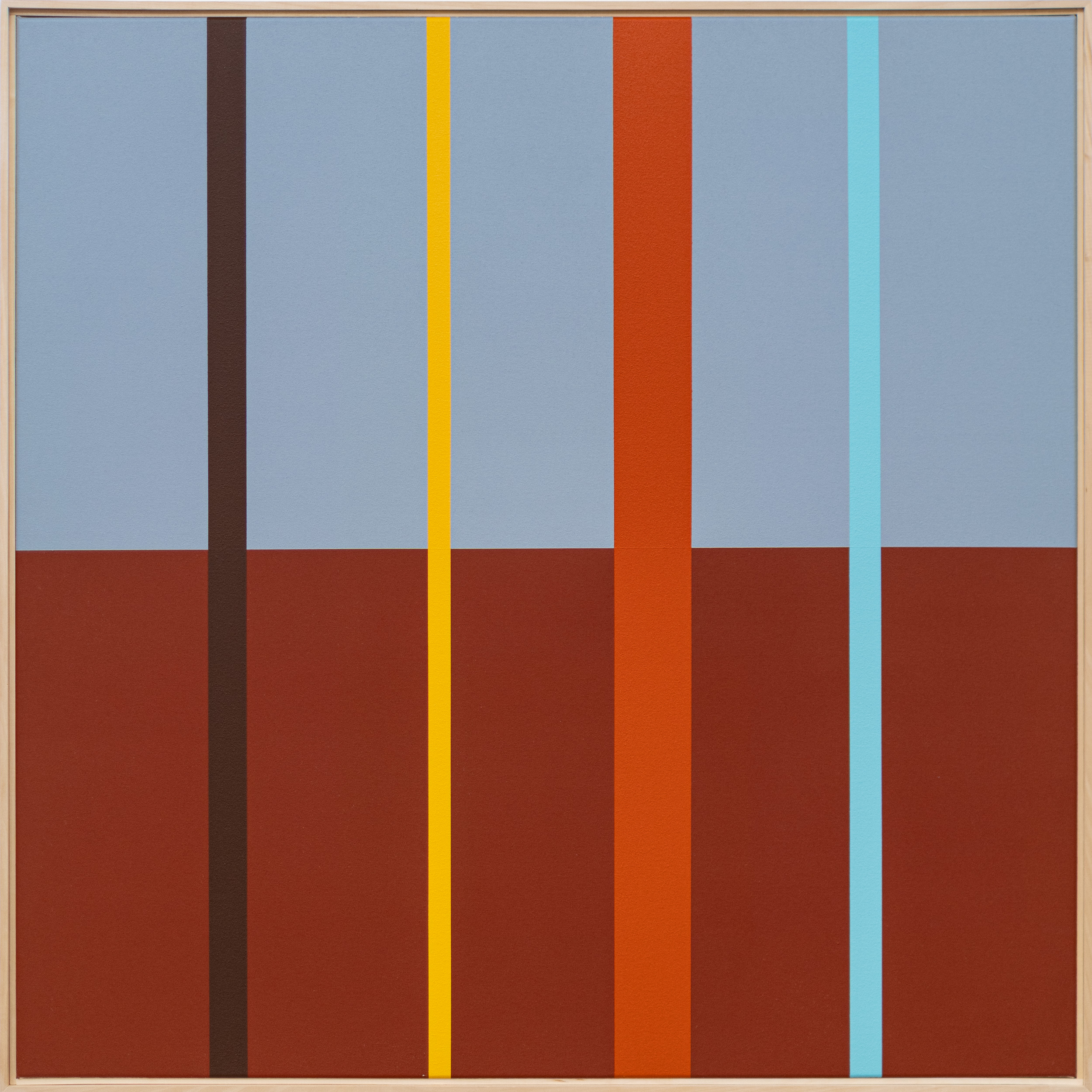 This colourful contemporary abstract landscape painting is by Milly Ristvedt.In this dynamic new work by Milly Ritsvedt, several bold vertical bands of pure colour in various widths run the length of the painting, which is divided into two horizontal hemispheres. Ristvedt’s choice of colours in this hard-edged piece is striking—chocolate brown, orange, sky blue, and bright yellow that pop against the light blue and red brown backdrop. The crisp, clean lines of hard-edged paintings emphasize the flatness of the canvas and draw the viewer’s eye to the simple geometric shapes that make a bold statement.