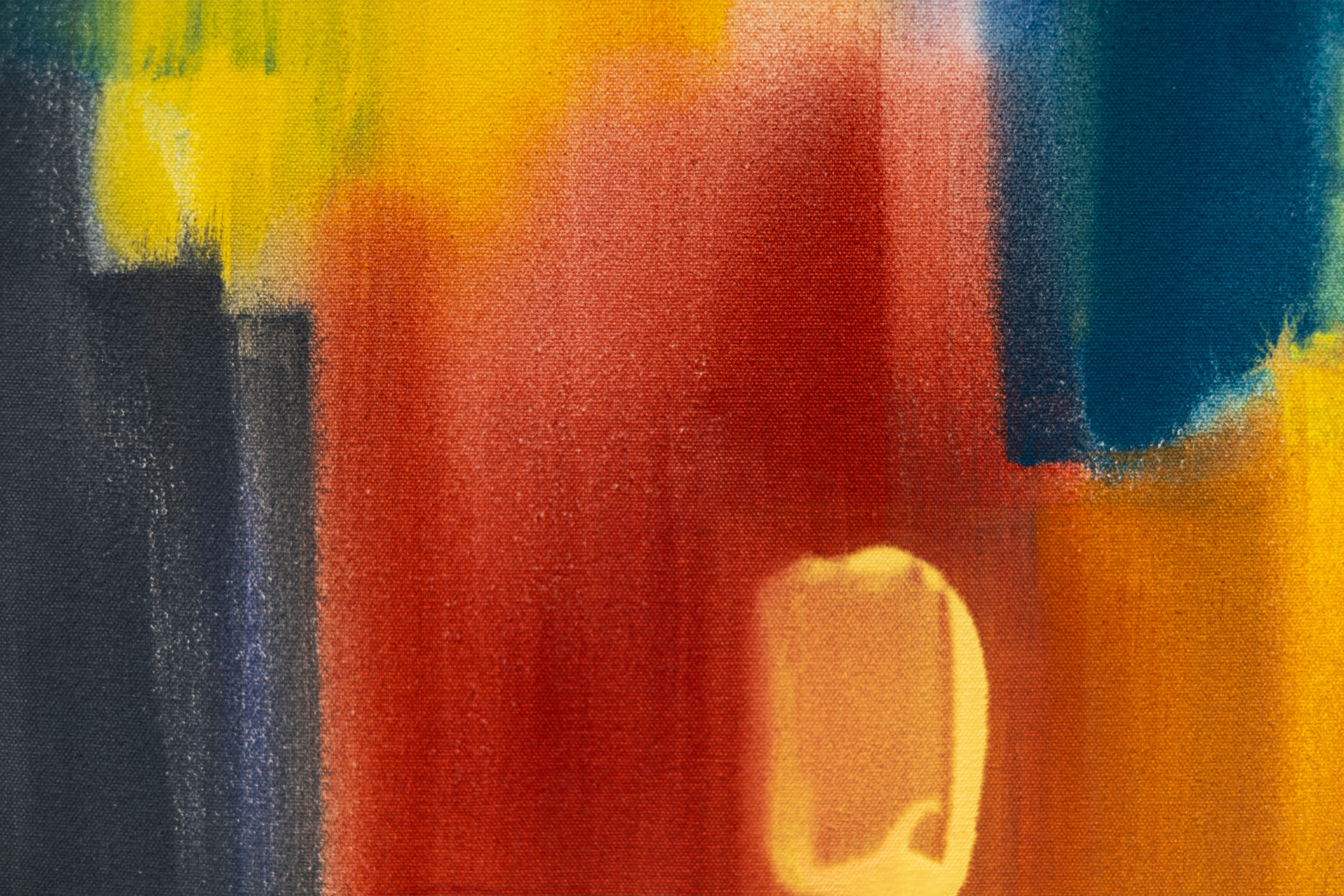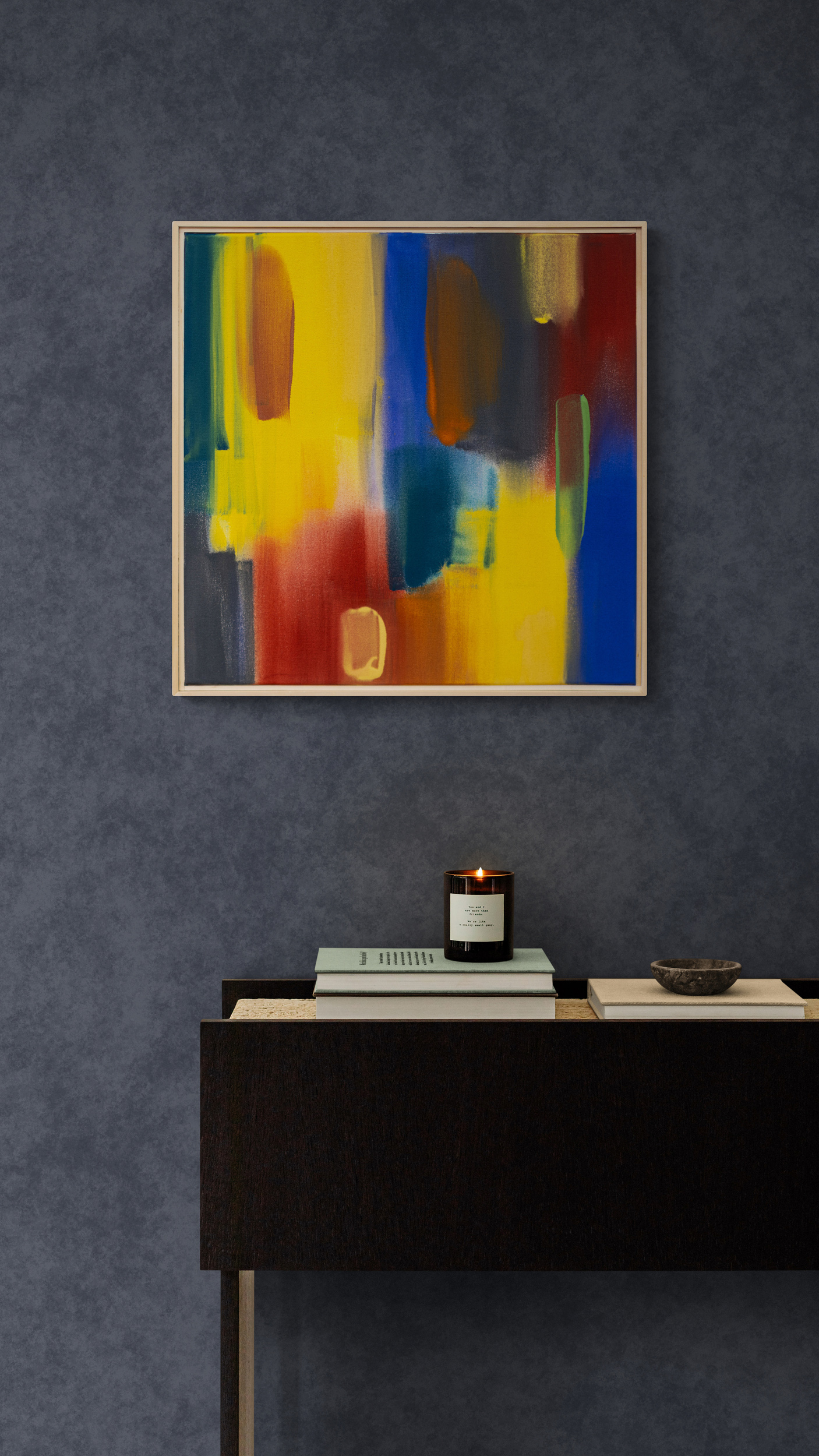 This is one of a series of colourful abstract expression paintings by Milly Ristvedt.For more than six decades, Milly Ristvedt has explored the power of colour as a visual language in her uniquely singular voice. In this new series of works, she exhibits her talent as a master colourist whose fluid gestural form invites an intimate dialogue with the viewer. Here, generous vertical brushstrokes—curtains of colour dance across the canvas. The colour palette is a rich, inspired mix of golden yellow, royal blue, cranberry red, green and contrasting black. One of a series of five.