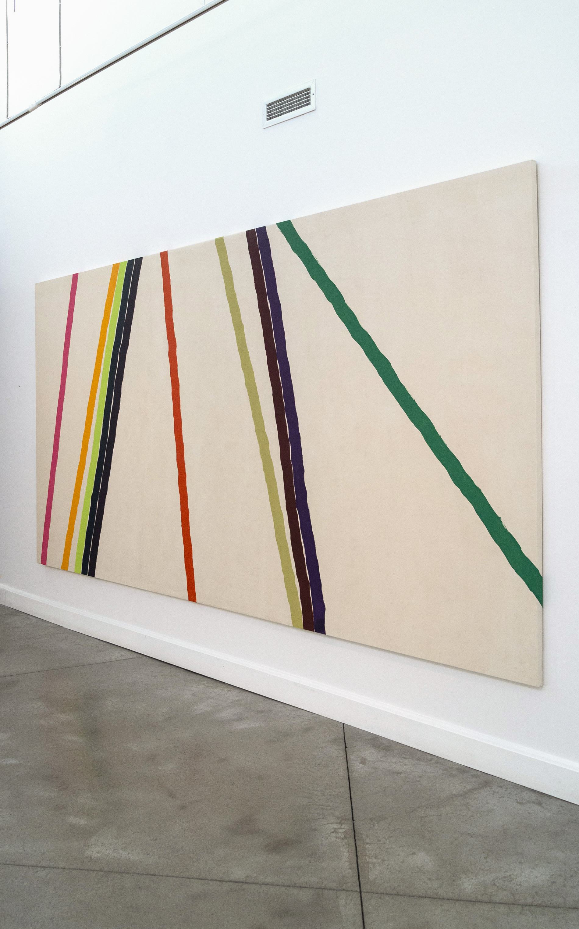 This large contemporary abstract painting by Milly Ristvedt is one of her colourful ribbons series.In the late 1960s, abstract artist Milly Ristvedt had fallen in love with using raw canvas and her abstract form and colourful palette were inspired by the famed Washington Colour School. Line Breed is one of a series of stunning large compositions she created in 1969—the ‘ribbon’ paintings—broad vertical ‘ribbons’ of colour fanning out across the canvas in vivid red, green, black, blue and orange. Ristvedt painted these when she was just 27 and shared a studio with the famed abstract artist Jack Bush. Renowned art historian Barry Lord observed at the time that Ristvedt's paintings were "more insistent than Bush, more consciously structured than Molinari."