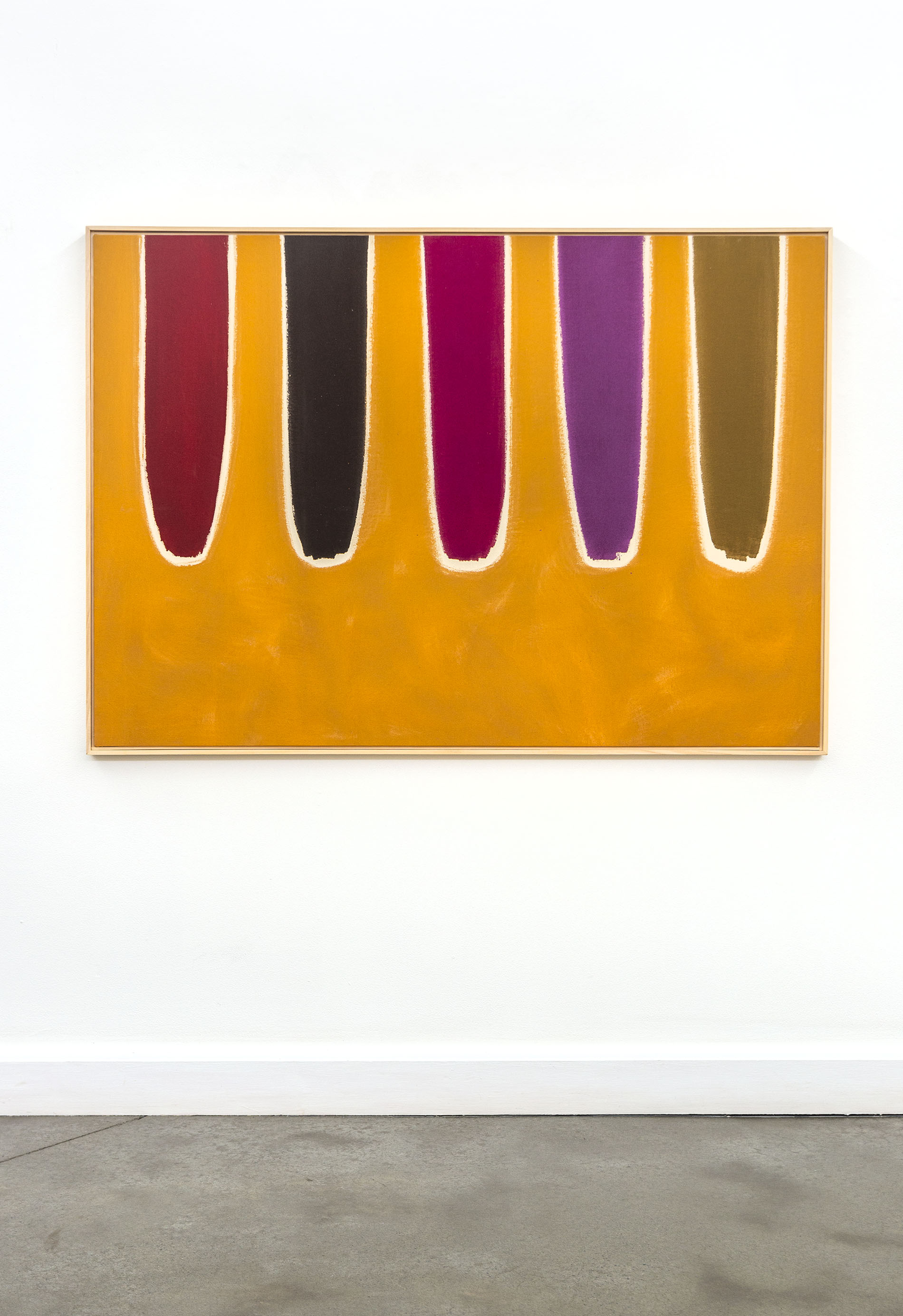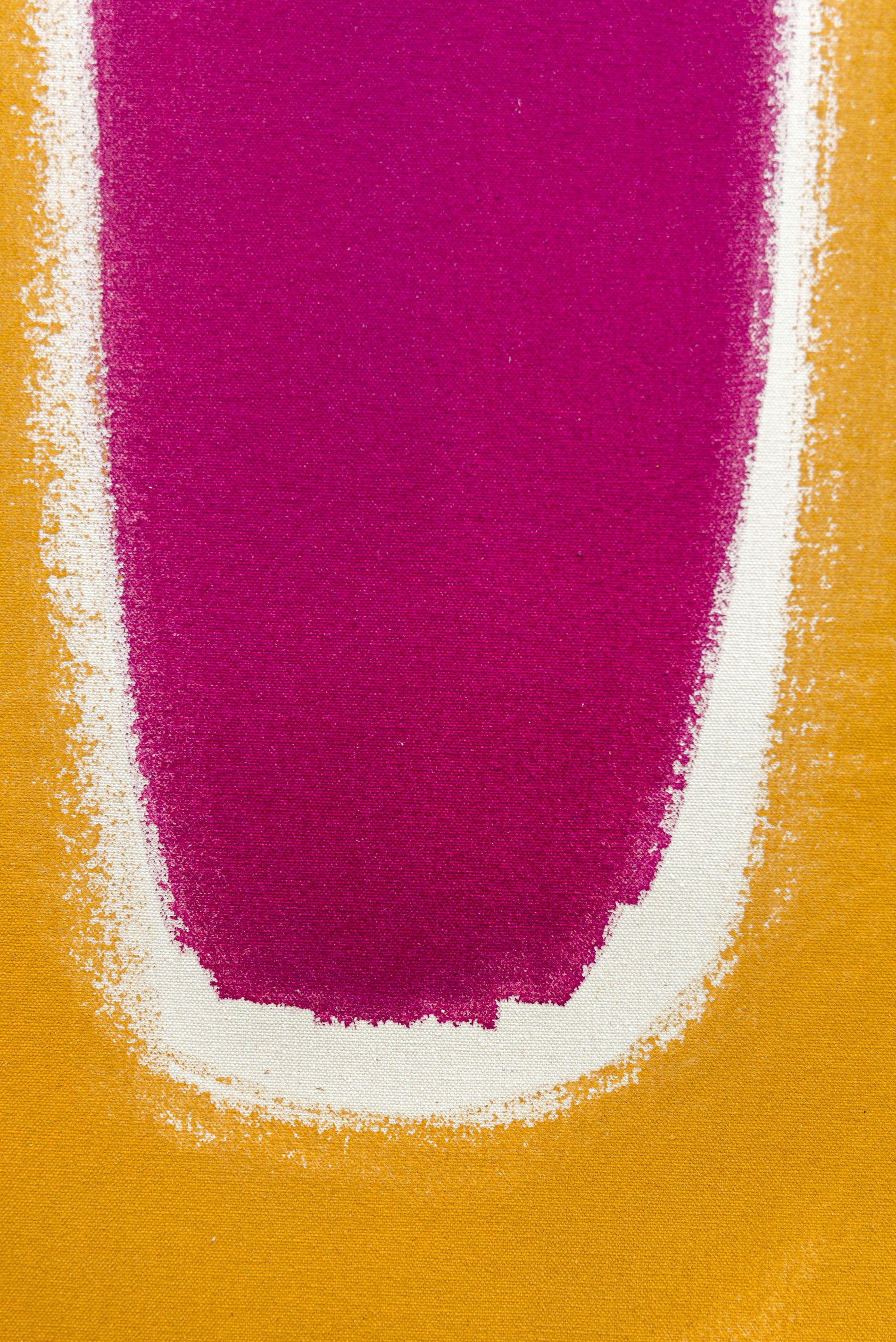 This abstract contemporary painting by Milly Ristvedt is all about colour.Early in her career, Milly Ristvedt had already been singled out as an exceptional artist by Canada’s Jack Bush. Famed art historian Barry Lord observed at the time that Ristvedt's paintings were "more insistent than Bush, more consciously structured than Molinari." During the 1970s, Ristvedt lived in Montreal, where her experimentation and exploration of colour continued. She already intuitively knew that colour had the power to evoke emotion and was on a path to create her own distinctive visual language. This is one of a series of colour field paintings she created that displayed her masterful use of colour and simple form. Against a tangerine background, strokes of colour drop down from the top of the canvas in a bold mix of cranberry, slate gray, hot pink, lilac and putty. Outlined in white, the colour's simple shape is clearly defined.