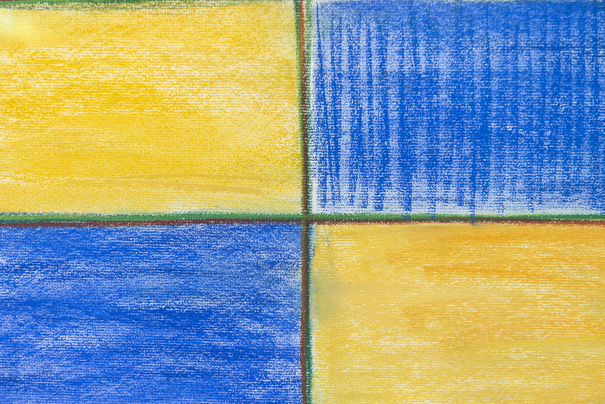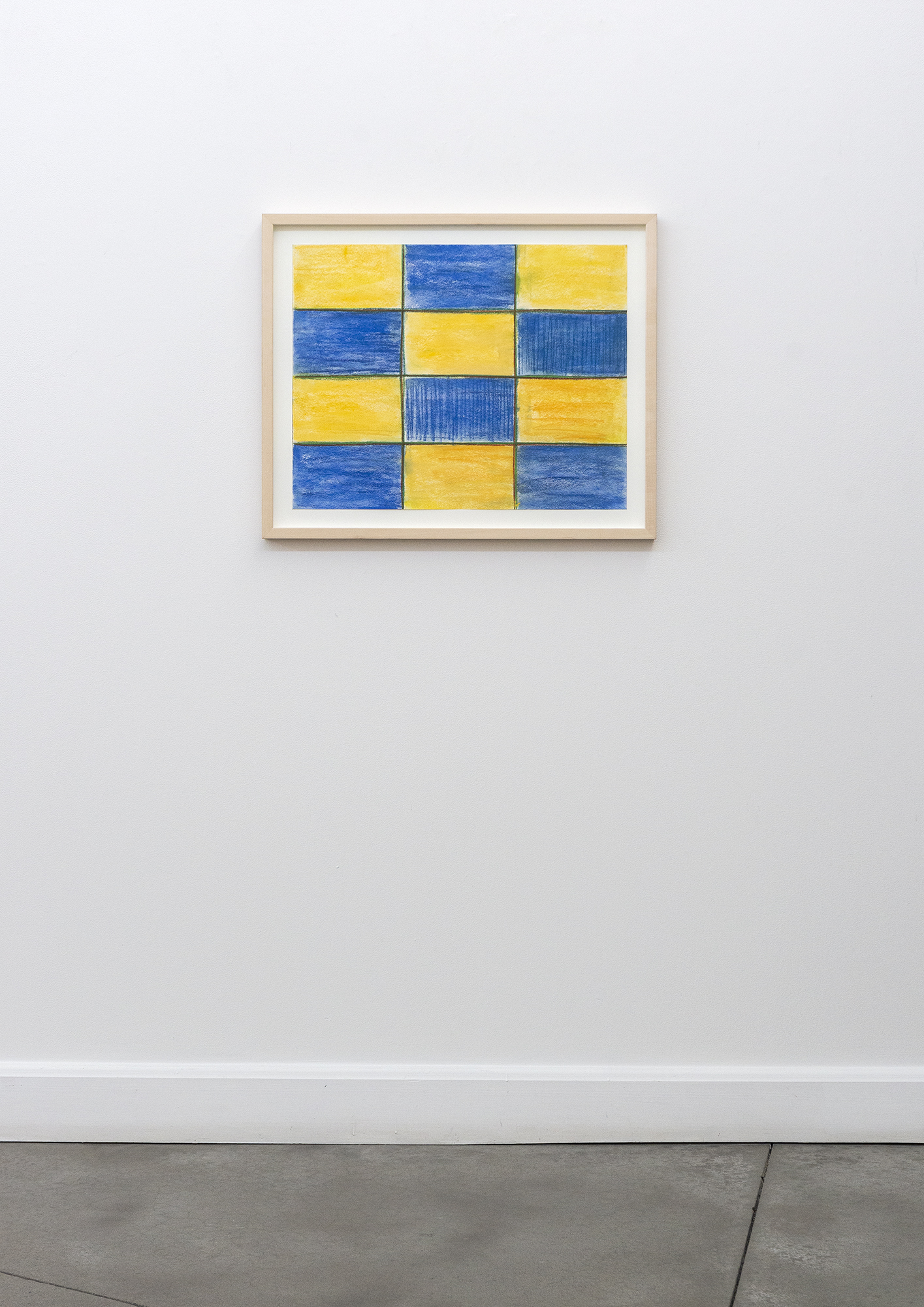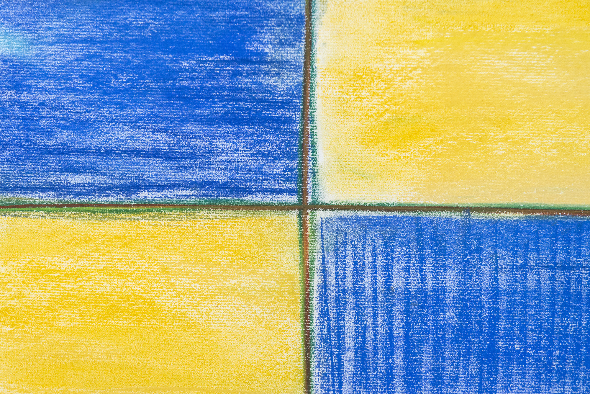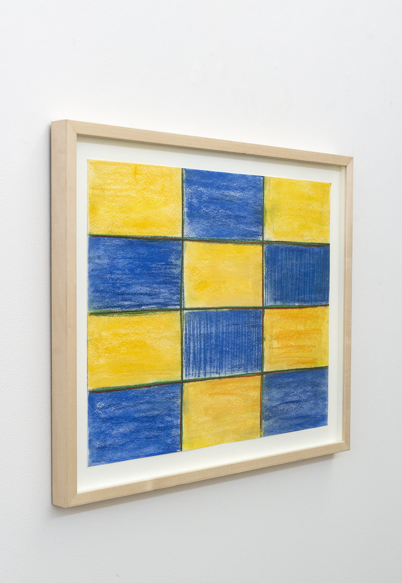 This contemporary pastel on paper of a grid in blue and yellow is by Milly Ristvedt.The classic grid pattern becomes more than a ‘container’ for colour in the hands of master colourist Milly Ristvedt. Hailed by critics and collectors as one of Canada’s finest abstract artists, in the 1990s Ristvedt used the geometric form of the grid to express a dynamic visual narrative. The palette for the 12 squares in this piece is a striking deep blue and bright yellow. Each square in the grid is defined by a fine line of bright green and brown. The pastel is applied with visible strokes vertically in some squares, horizontally in others, adding to the energy of the piece.