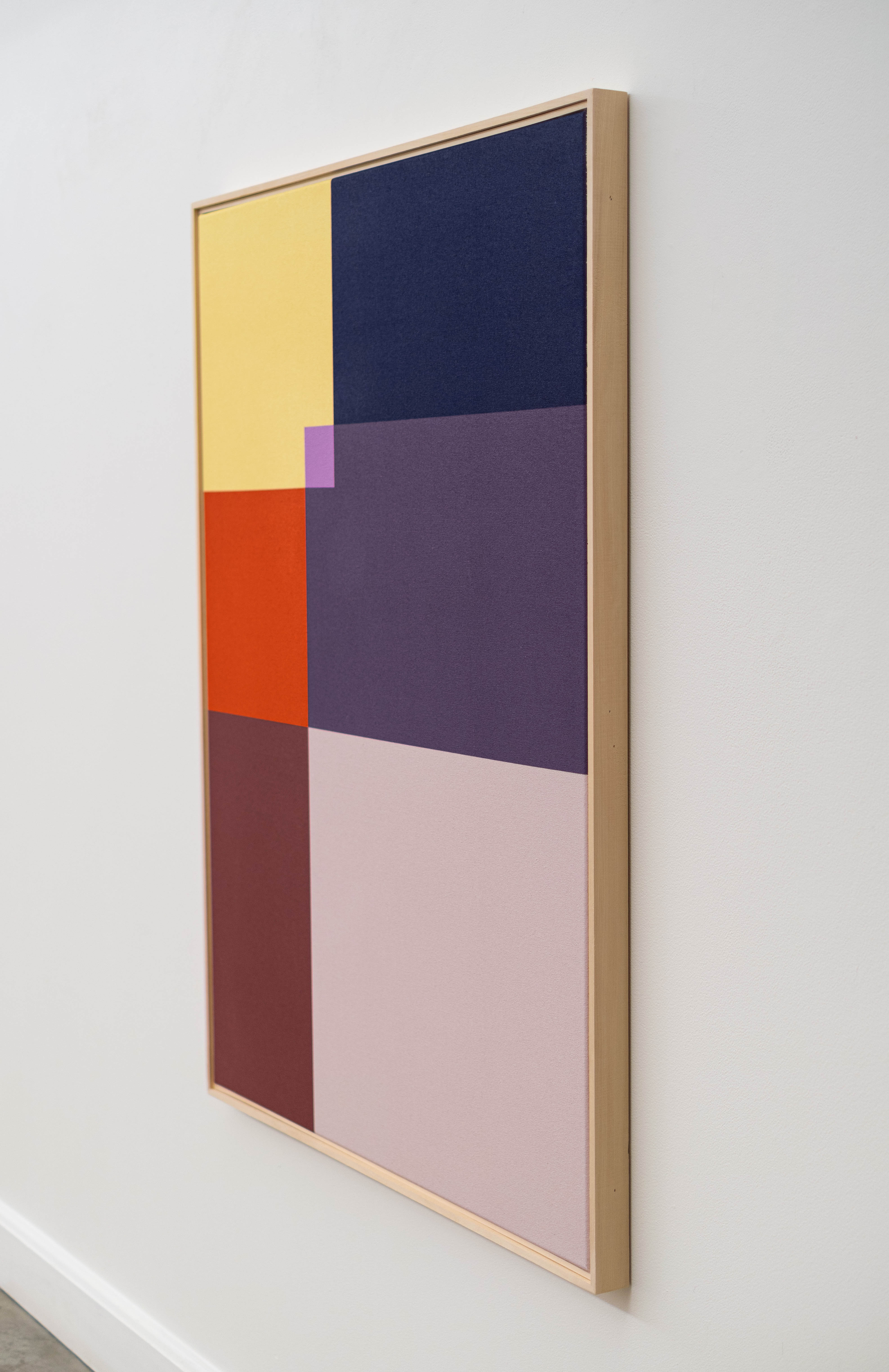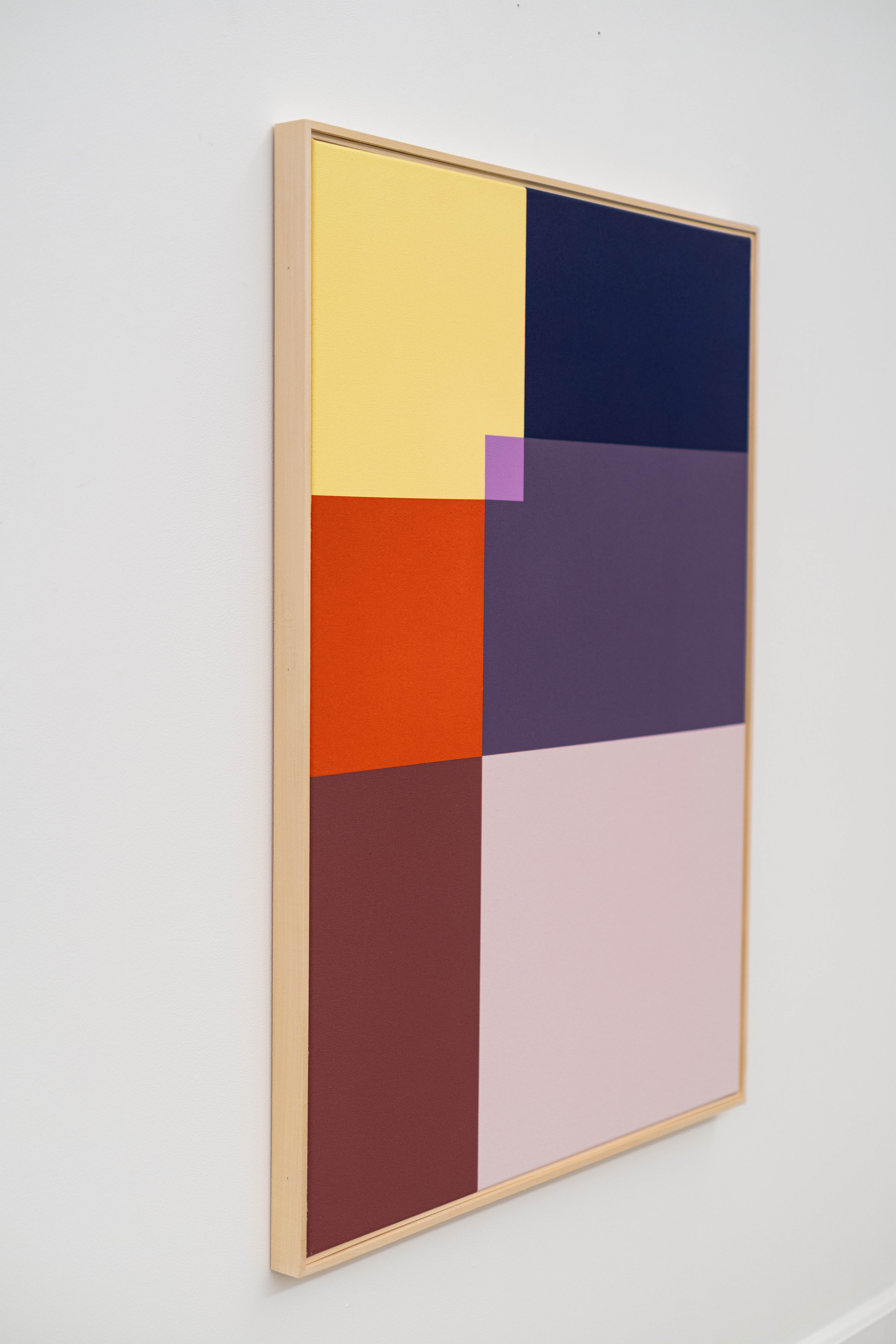 In this dynamic composition, overlapping geometric shapes of various sizes are rendered in striking colours. The palette is bright and modern—purple, pale pink, mulberry, bright red, lavender, yellow, and navy blue.