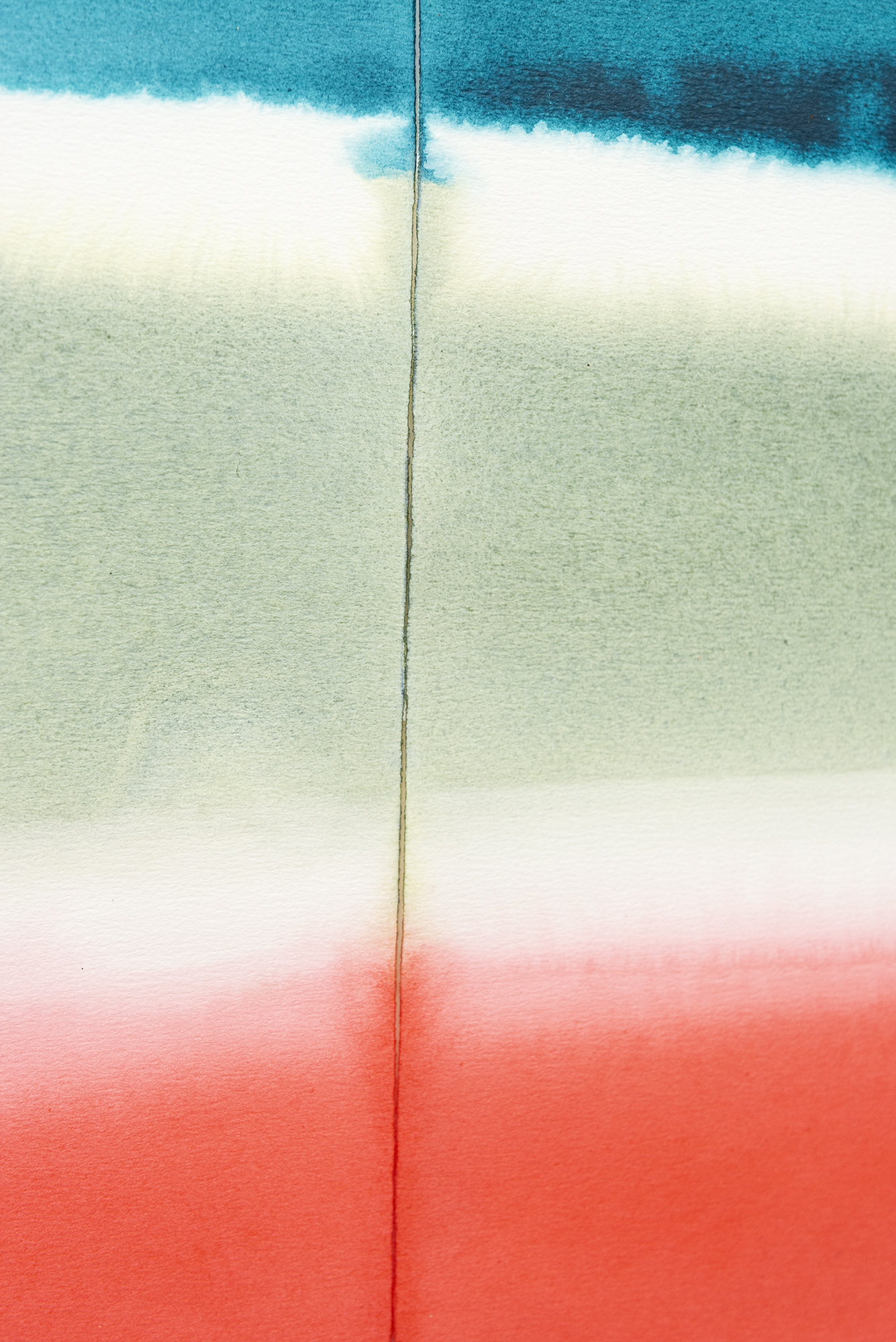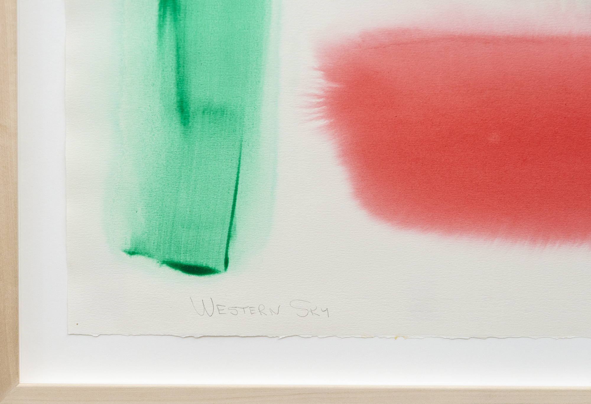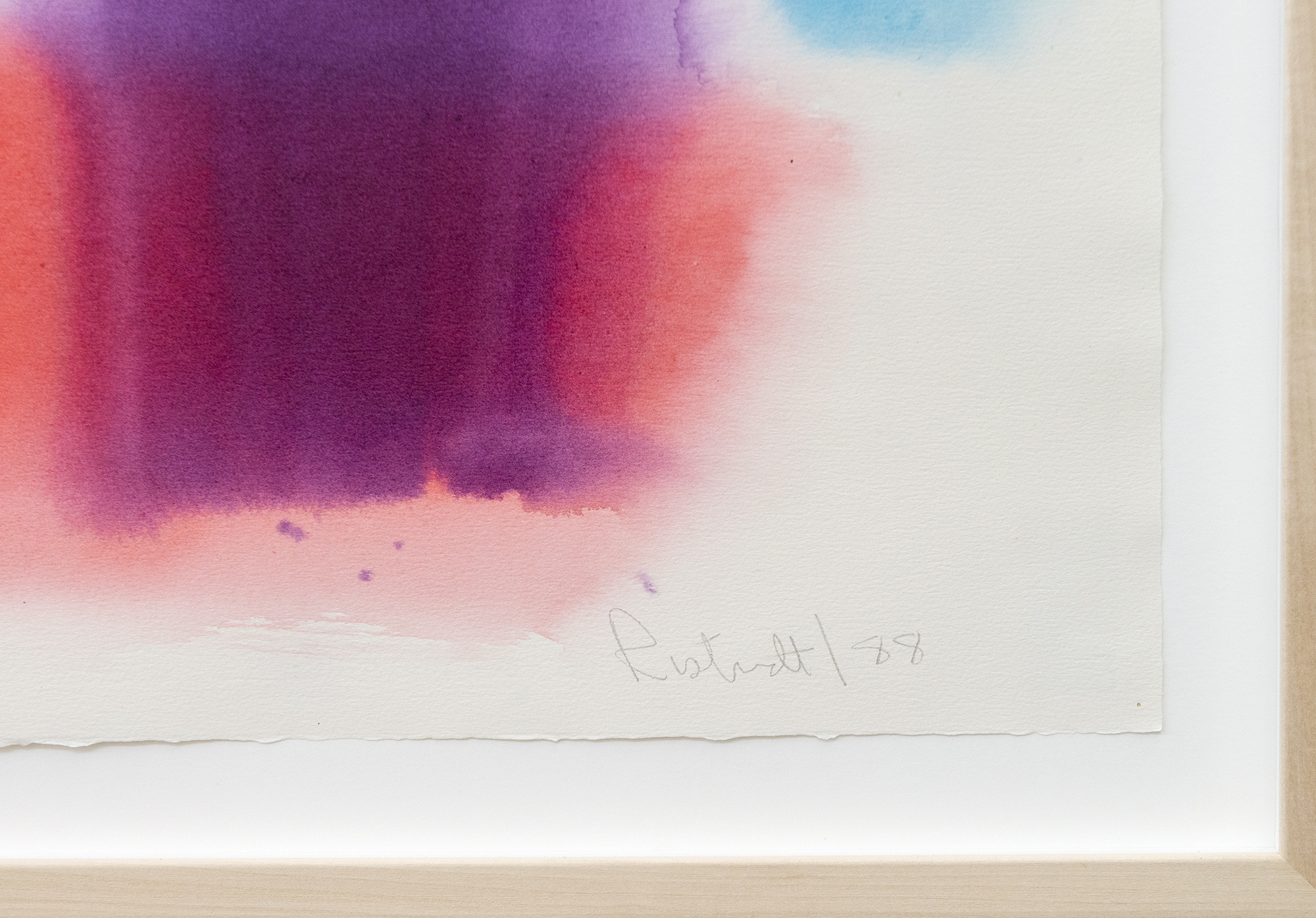 The palette for this joyful piece on paper is a vivid mix of greens, yellows, blues, purples and oranges. Early in her career, Ristvedt recognized the tantalizing potential of colour to define form and evoke a mood. Here, colour joins the two works together in one large, impressive horizontal piece.