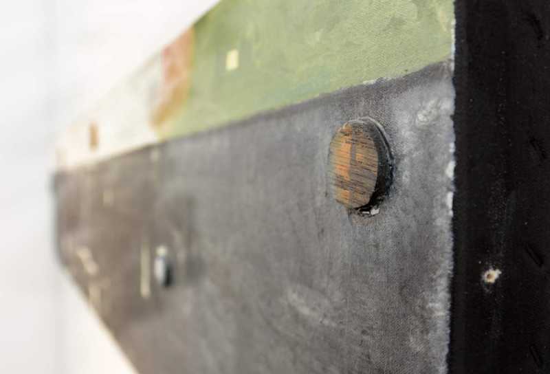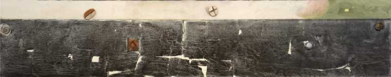 The textured surface of water, still and dark, meets a strip of cream coloured sky in this long horizontal canvas. A cloud of green and pink on the far horizon balances the attention given to the small wooden shapes, like bright buttons, curated across the picture plane. The work is a master class in composition by an established Canadian painter.Rogers' work, rooted in a cubist-constructivist tradition, was recognized by art critic Clement Greenberg in 1963 as having a "fullness of inspiration". In keeping with this sentiment, Rogers' tonal expression in this piece is contemplative, spiritual and uplifting.
