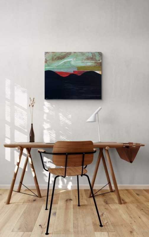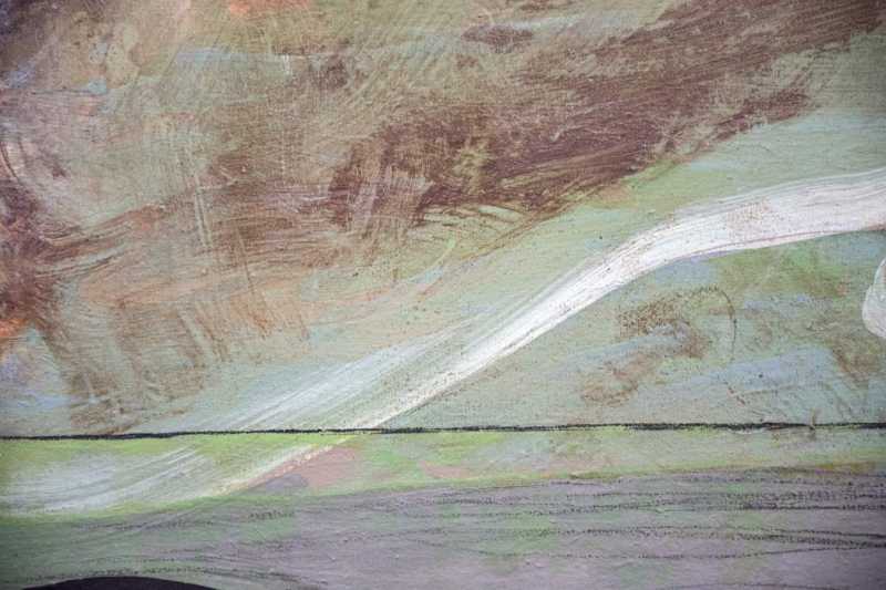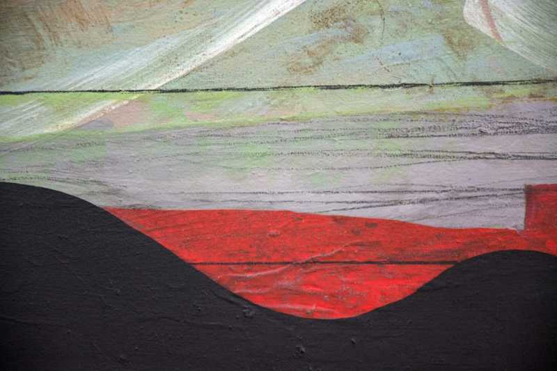A rich black ground undulates at the horizon where it meets geometric passages of crimson, ochre, grey, white, and peach below a moss green and teal sky in this acrylic painting on canvas. A calligraphic swoop of brushed white, a passing cloud, completes this powerful composition.Rogers' work, rooted in a cubist-constructivist tradition, was recognized by art critic Clement Greenberg in 1963 as having a "fullness of inspiration".
