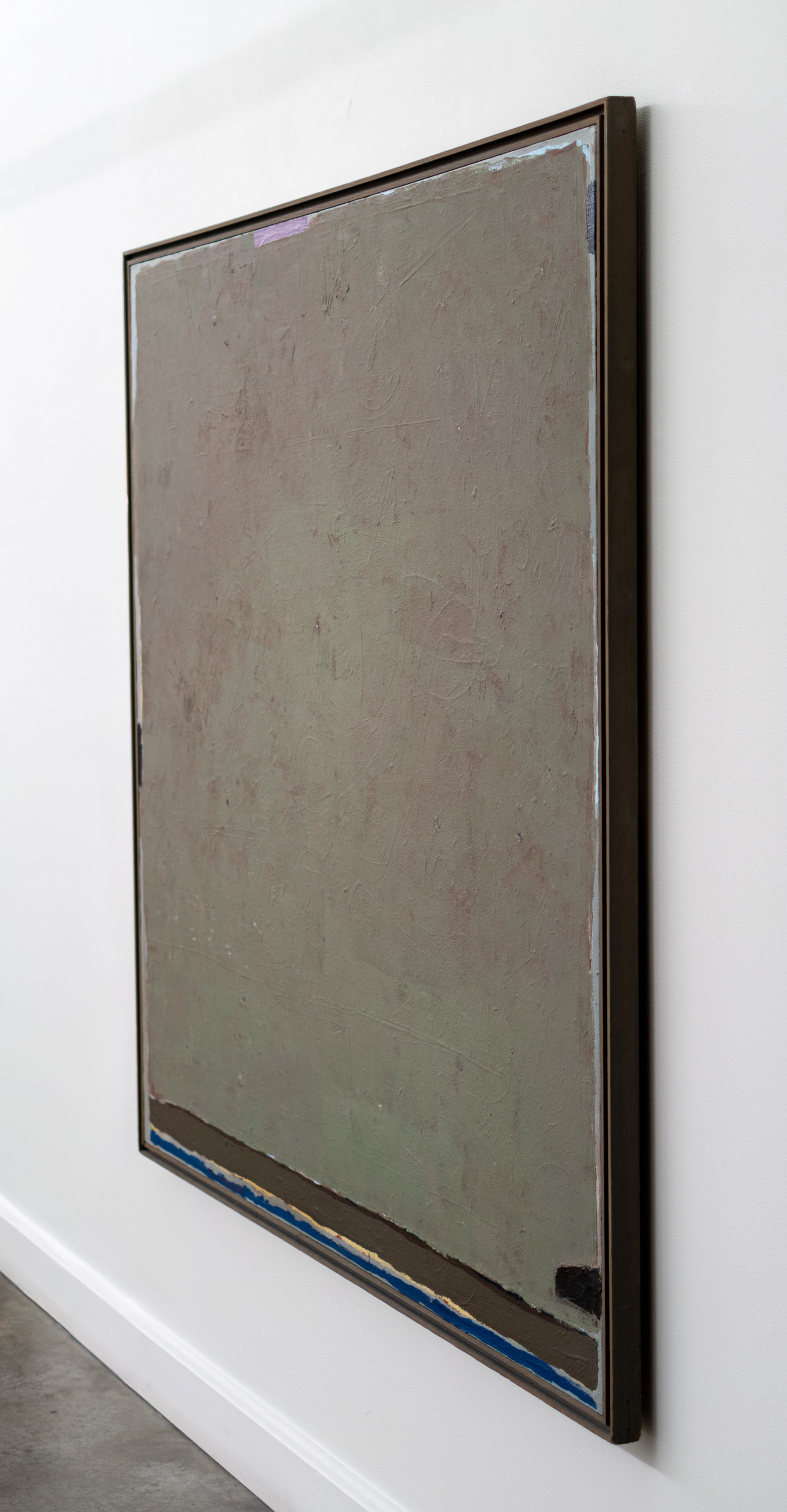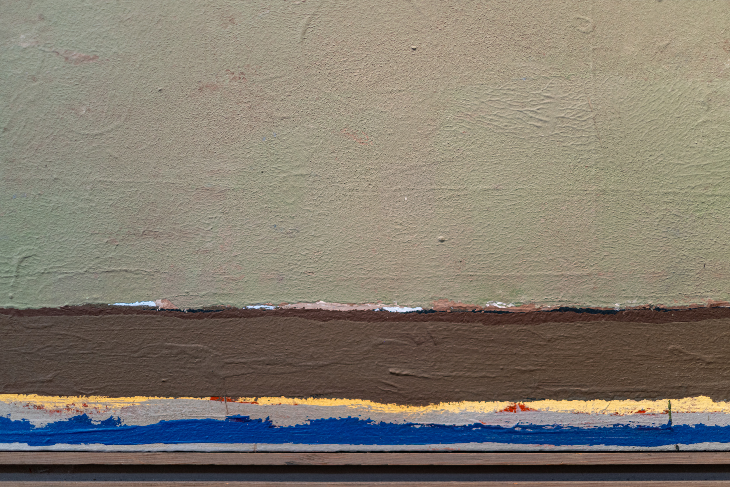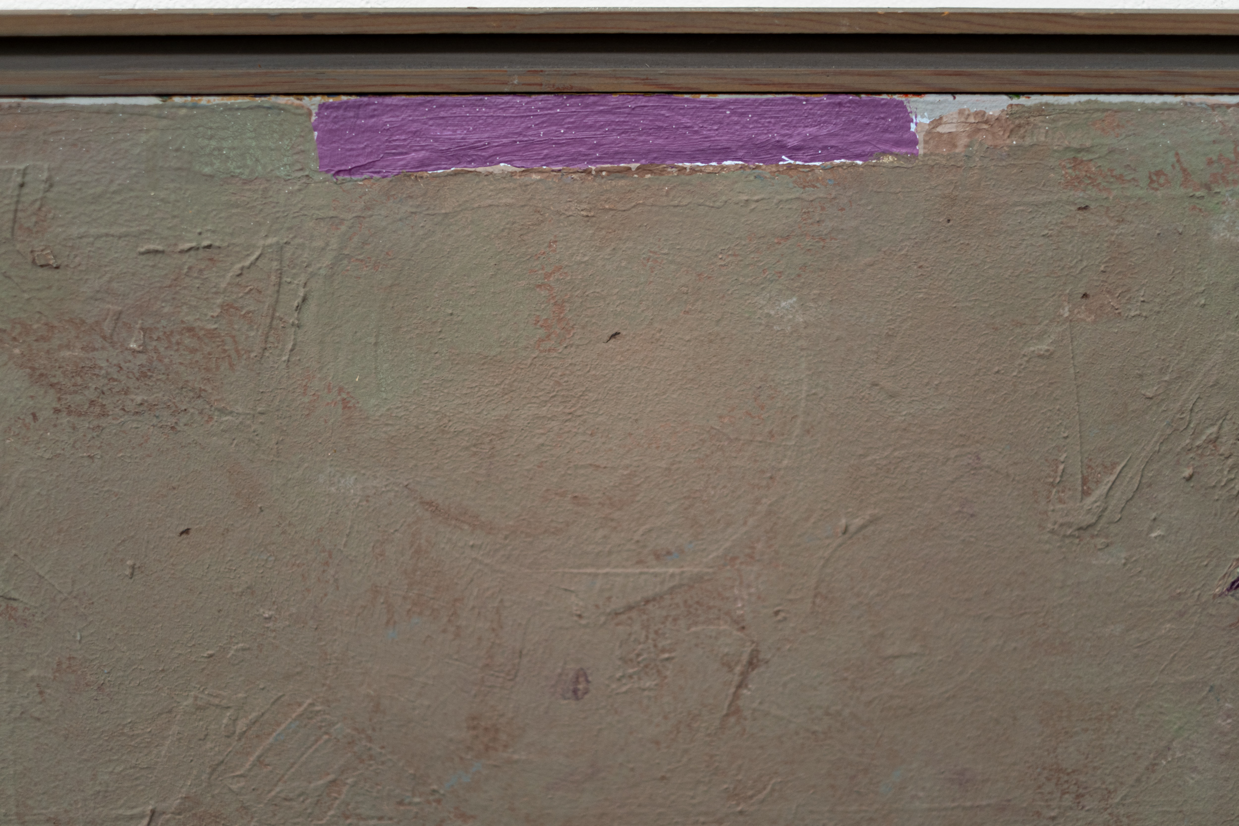 Rogers liked painting in fine layers and often diluted his paints to achieve a flat milky colour with visible texture. This is one of his earlier works that illustrates that effect. The warm, moody palette—a subtle mix of earthy and rosy hues suggests darkening lake waters as it appears when the sun is going down before night falls. A narrow soft gray border punctuated by strokes of deep blue, soft yellow, red, and lilac frames the expansive colour field of the canvas.