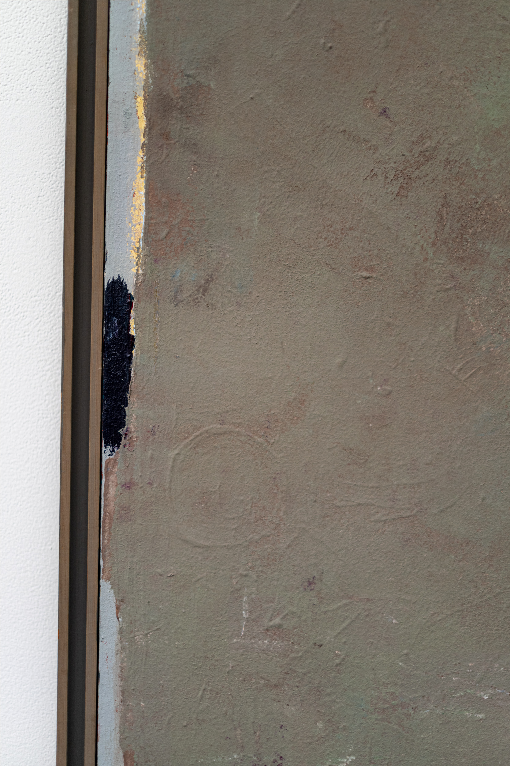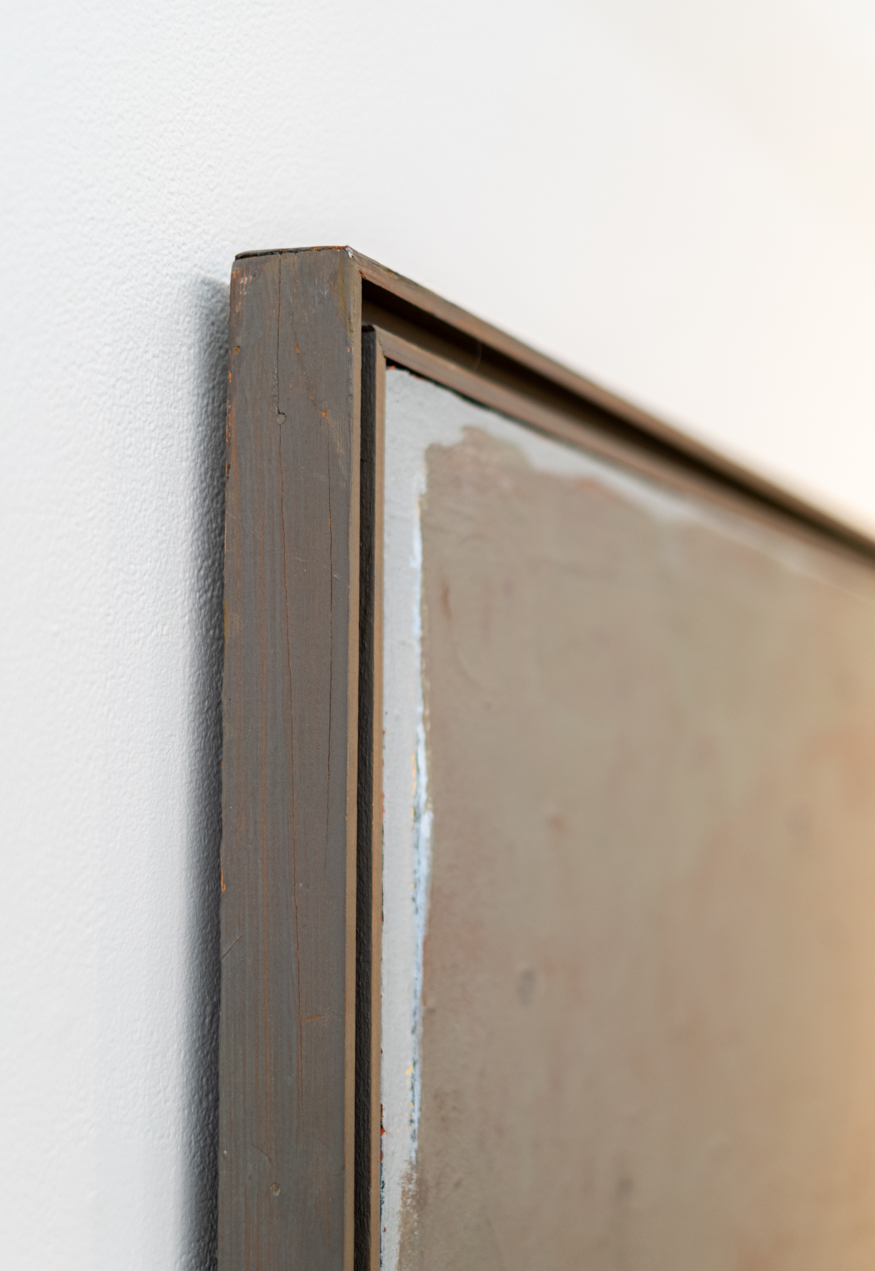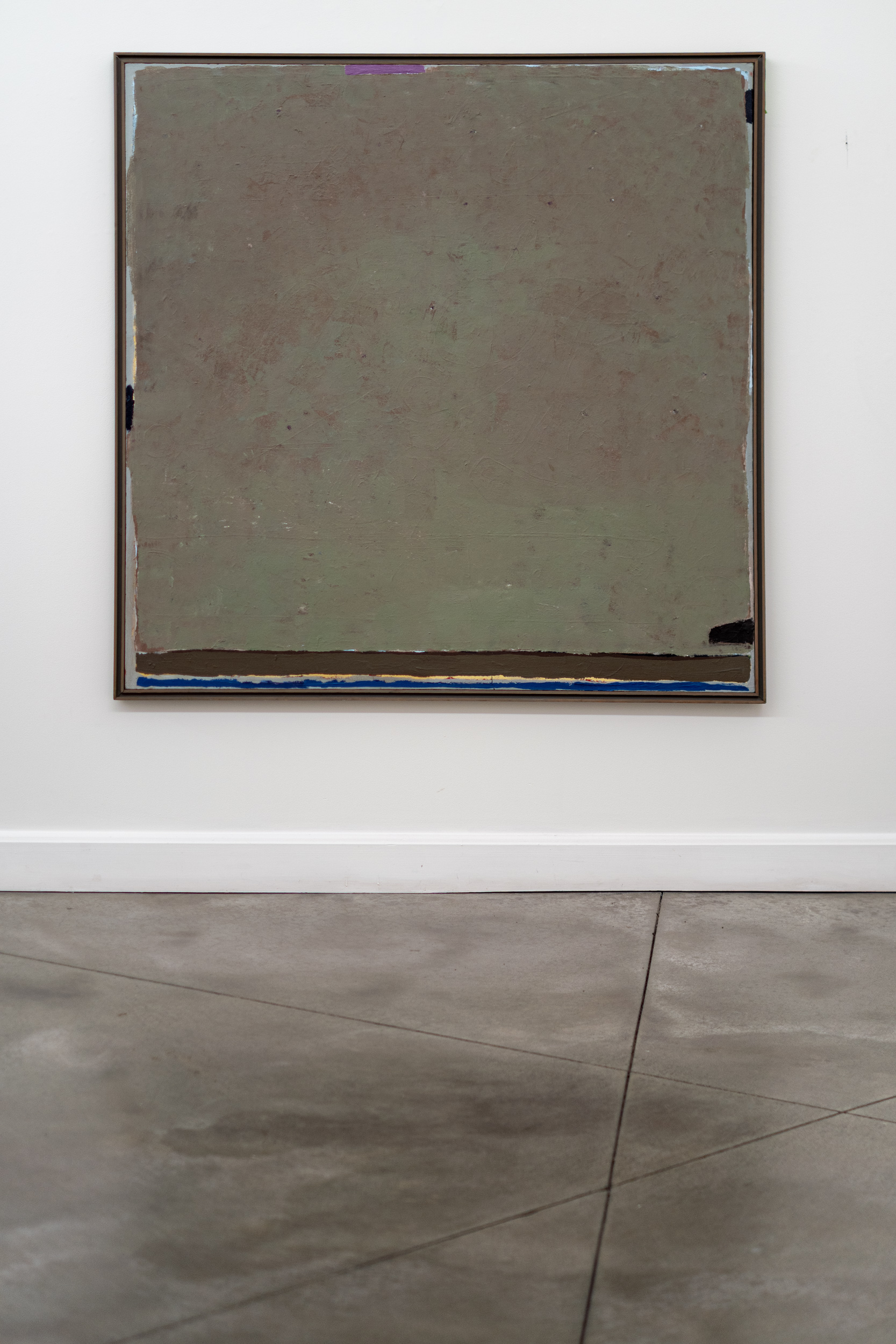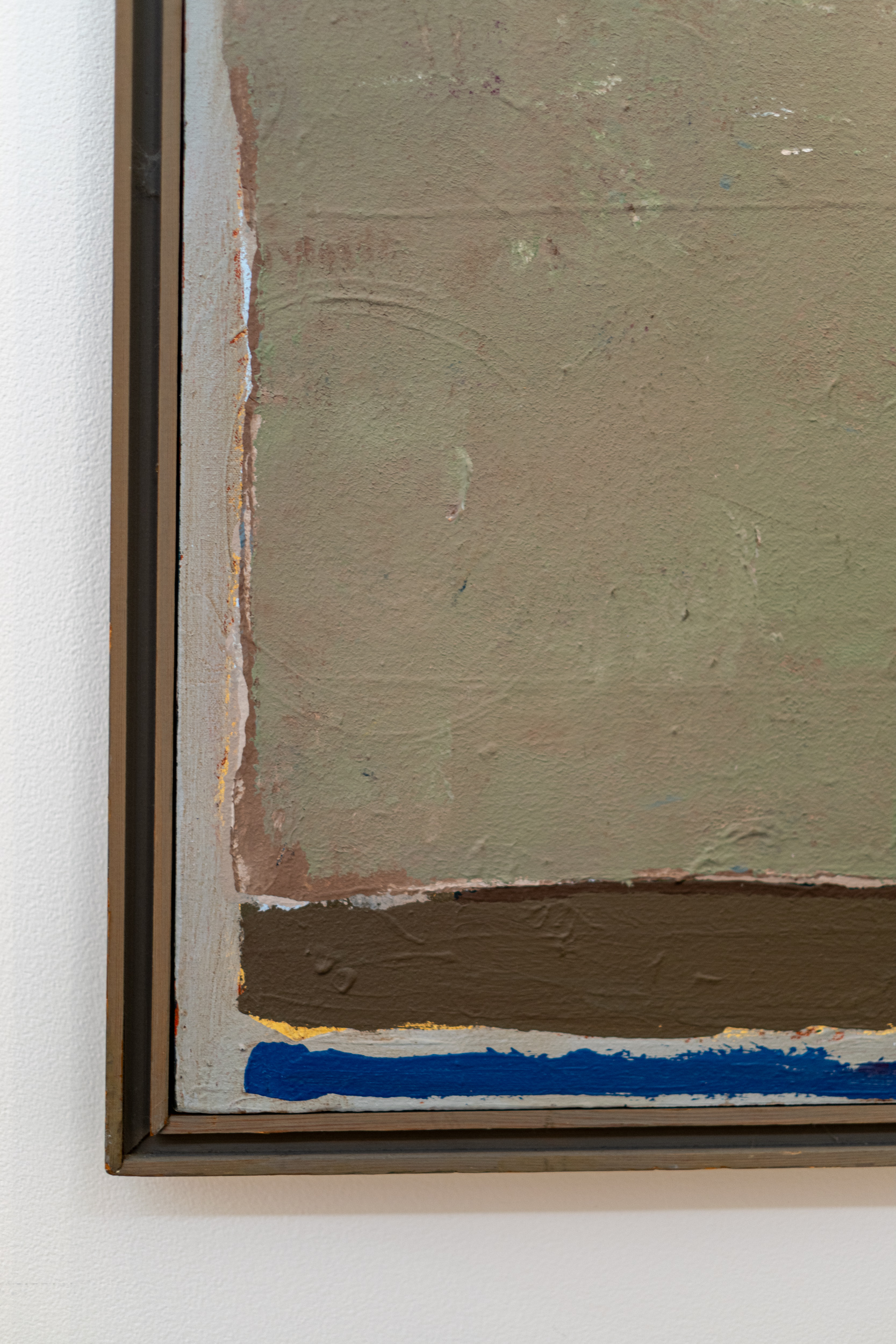Rogers liked painting in fine layers and often diluted his paints to achieve a flat milky colour with visible texture. This is one of his earlier works that illustrates that effect. The warm, moody palette—a subtle mix of earthy and rosy hues suggests darkening lake waters as it appears when the sun is going down before night falls. A narrow soft gray border punctuated by strokes of deep blue, soft yellow, red, and lilac frames the expansive colour field of the canvas.