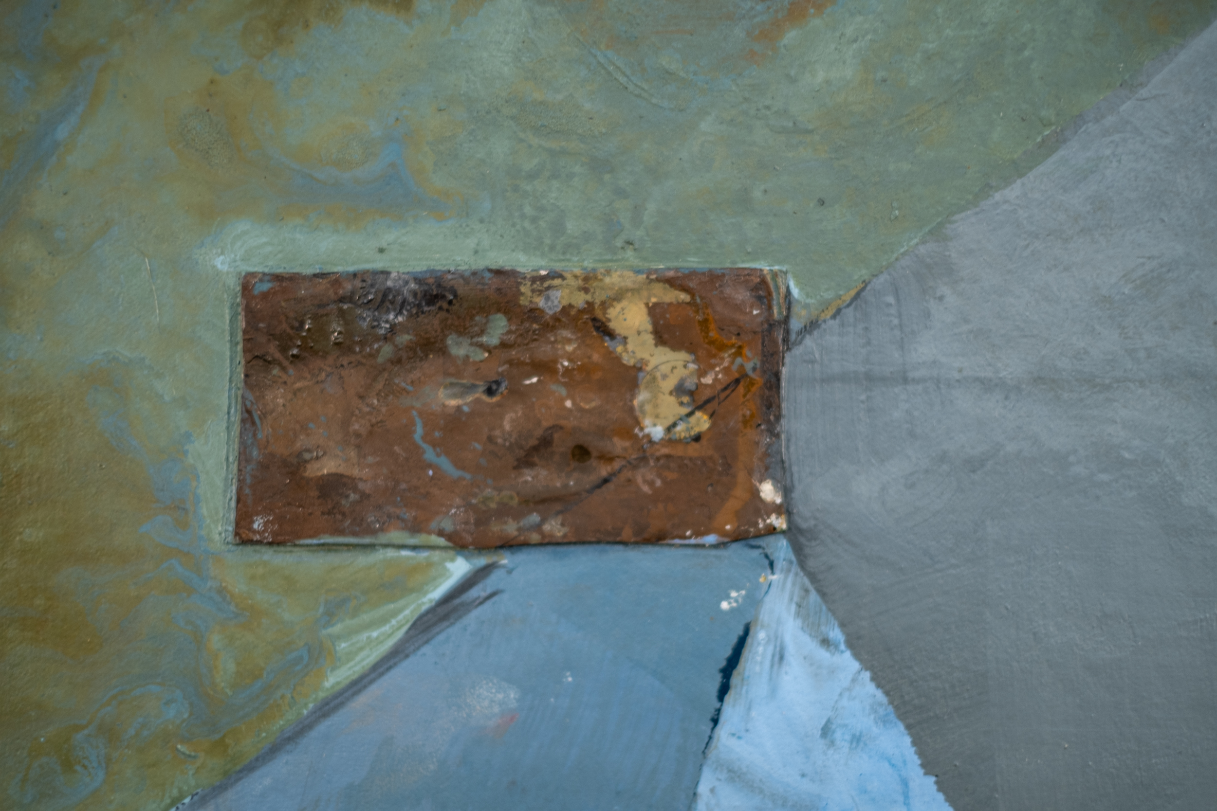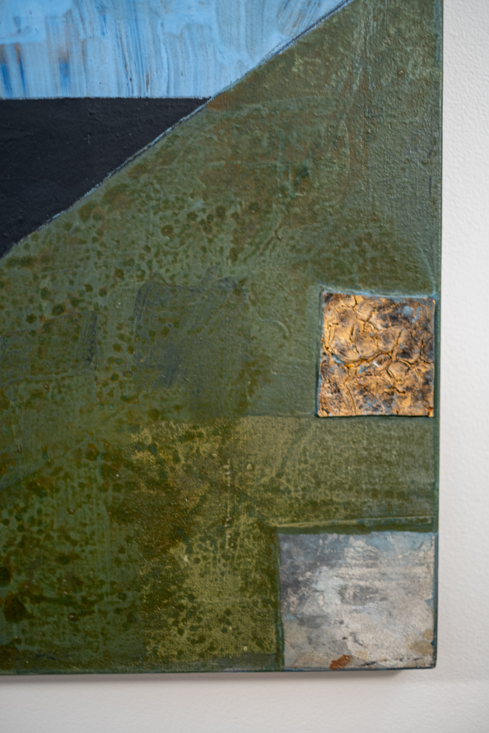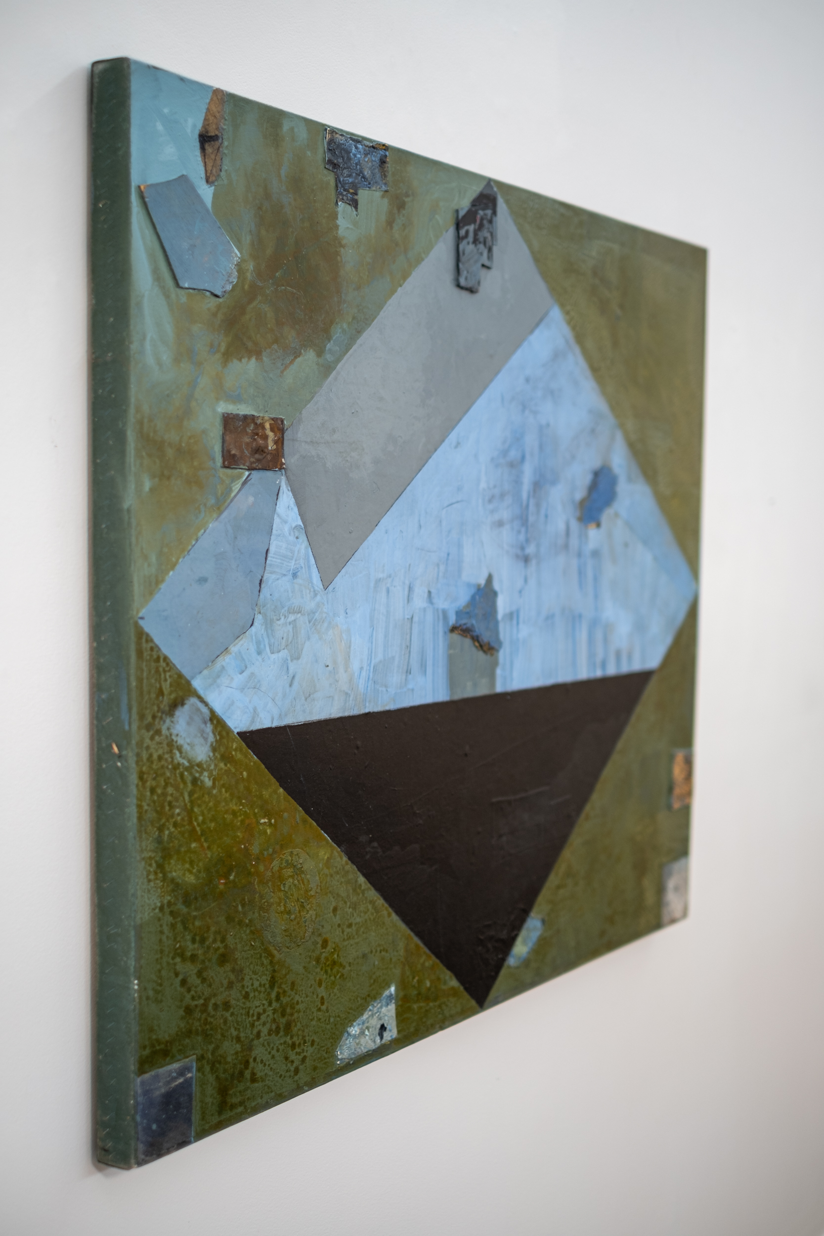 He painted in layers, and with each layer added subtle texture. This mixed media piece is rendered in a rich tapestry of earthy colours—a central bold diamond shape in sky blue, gray and dark brown plays against a neutral backdrop. Gestural brushstrokes, curated markings and several shapes appear to dance around the canvas enlivening the composition.