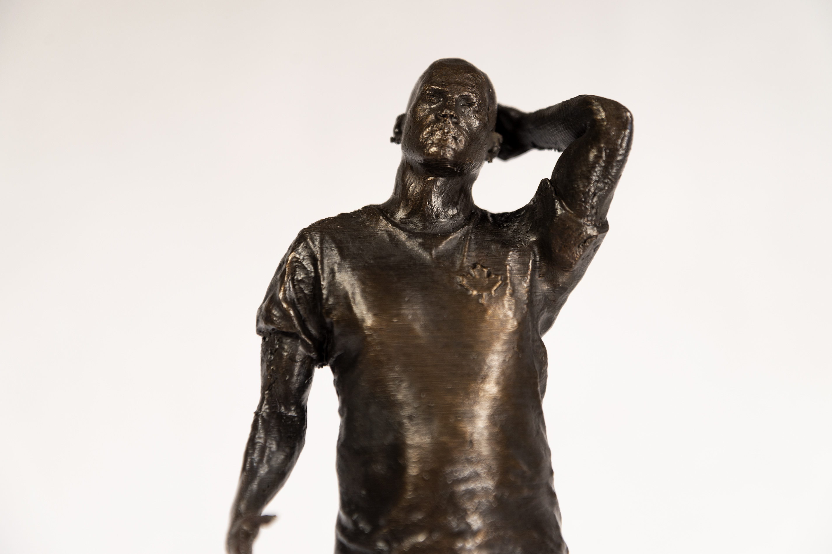 Smith’s dark bronze sculpture depicts a casually dressed male figure standing on a wooden base, looking upwards as if in contemplation, one arm raised behind his head. The figure is wearing jeans and a t-shirt which features a national symbol—the maple leaf, an homage to Canada. Edition of 3.