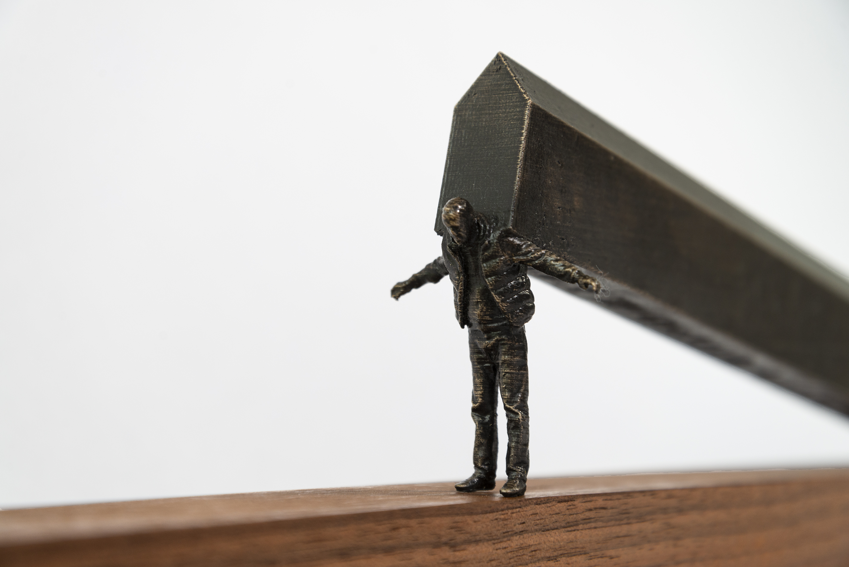 Roch Smith’s engaging and creative contemporary sculptures have been exhibited and collected in both Canada and the U.S. The Canadian sculptor is known for his fascination with scale and his new works continue that exploration. The tabletop bronze sculpture Underpinning features a casually dressed male standing on a wooden base, his arms outstretched to assist in balancing the long house-shaped form that rests on his back. Edition two of two.“At the outset, I found there was something very stoic about the figure just silently acting to prop up the form. It fits into my larger narrative about the honour of doing work and of being of service in some way.” Roch Smith