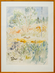 Service attended the University of British Columbia where she acquired her Bachelor of Arts degree. Her husband’s career took her to Scotland where she attended classes at the Glasgow School of Art. Her early influences were the Scottish artists whose brushwork and colour choices were reminiscent of the popular Post-Impressionist French painters. Service also lived in Eastern Canada and Venezuela but in 1972, the family moved back to Vancouver, B.C. She continued to paint and attended several artist’s workshops in the U.S. and Canada. Following numerous experiences at the renowned Emma Lake Professional Artist Workshops in Saskatchewan, (where she met a community of abstract painters including Milly Ristvedt), Service began to change her approach to her work. Traditional landscapes gave way to a more liberated, abstract style in colour and form.