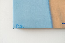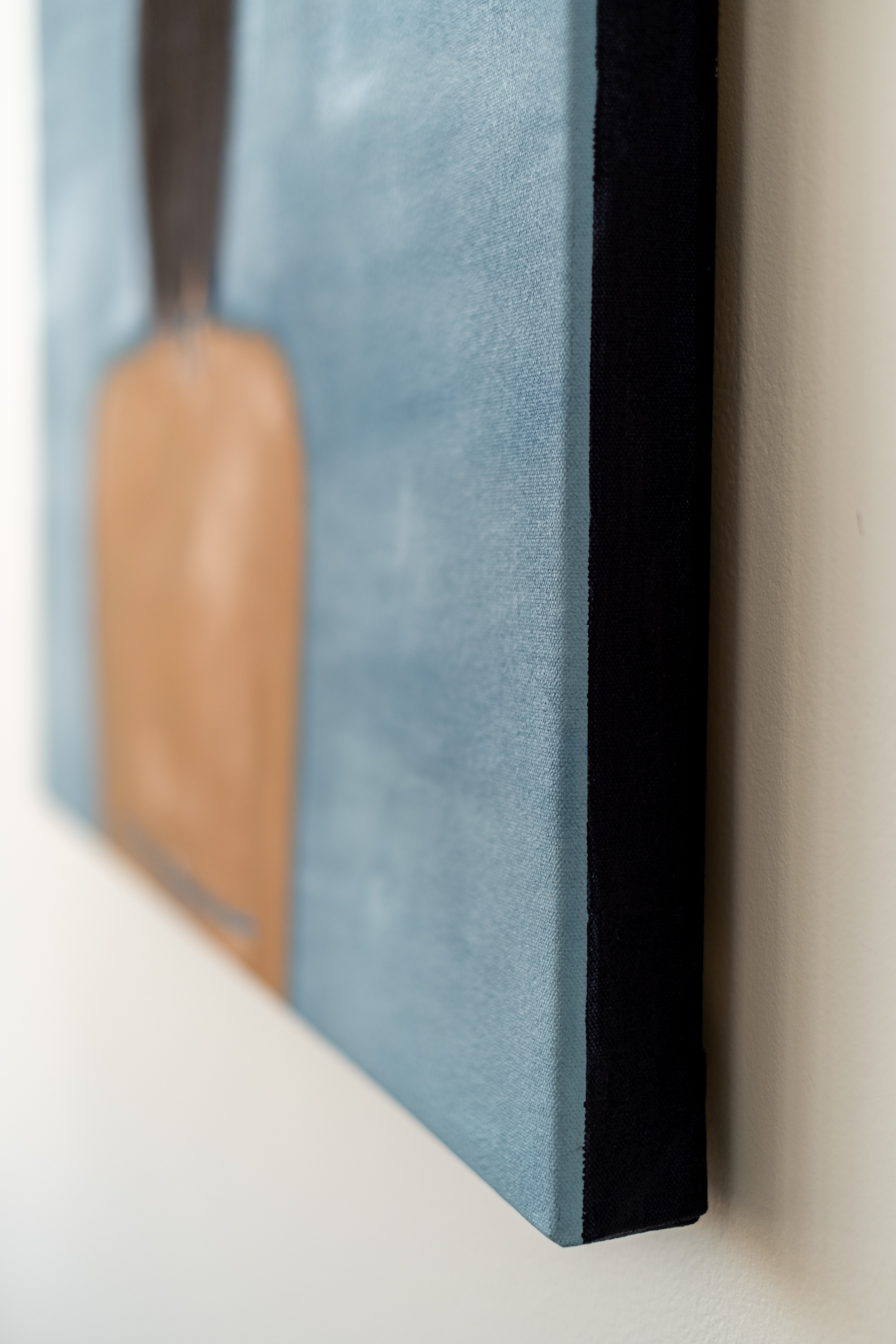 This contemporary minimalist painting of a swimmer is by Pat Service.Highly regarded as one of Canada’s finest landscape artists, in her decades long career Pat Service has also explored other genres and subjects. This series of paintings are part of a group she called ‘Bathers’ inspired by witnessing the swimming lessons of her baby grandson. Service is experimenting with simple form and colour here. The perspective—showing us only the back of each person feels intimate and immediately engages the viewer.