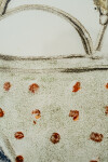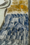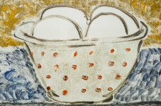 This charming little watercolour of a bowl with eggs may be a homage to the work of Canadian artist Mary Pratt, whose work in the 1970s celebrated images of the domestic lives of women. In this piece, a white ceramic bowl decorated with orange polka dots sits in the center frame with four white eggs inside it. The backdrop in blue and a rich golden colour allows the bowl to take precedence.