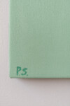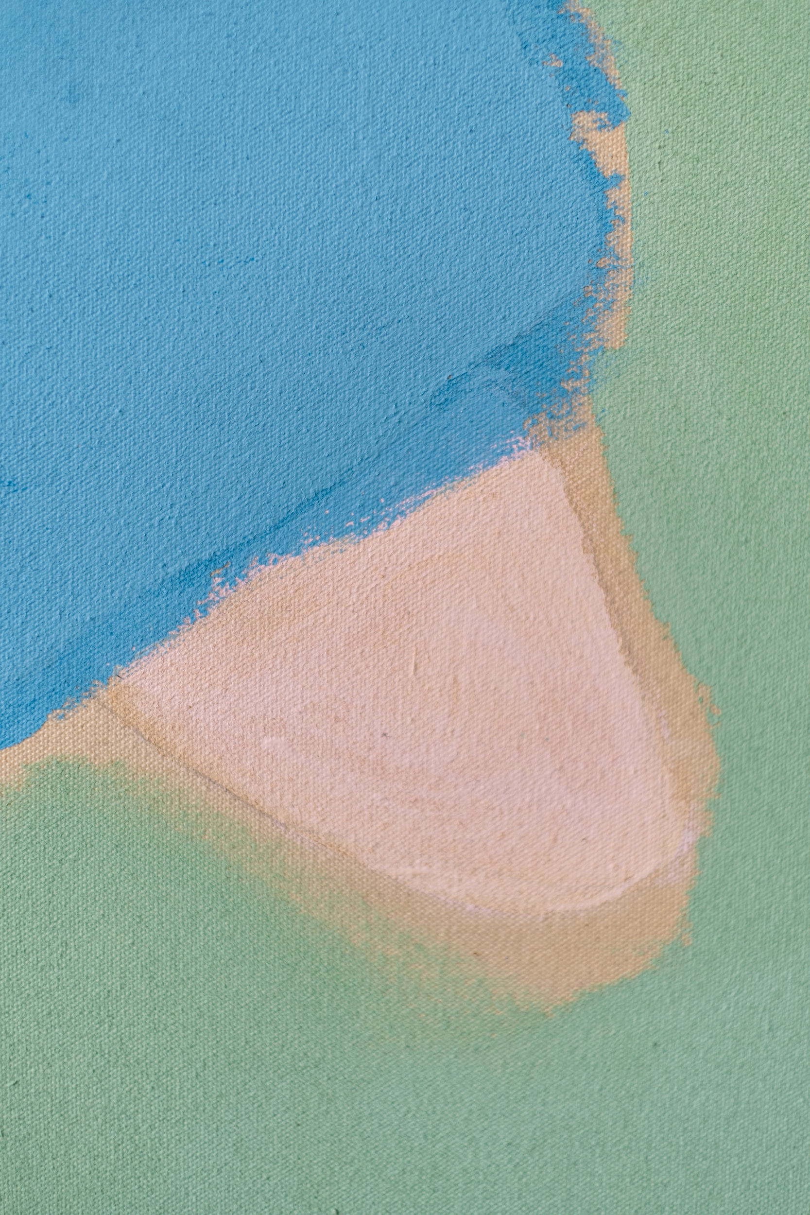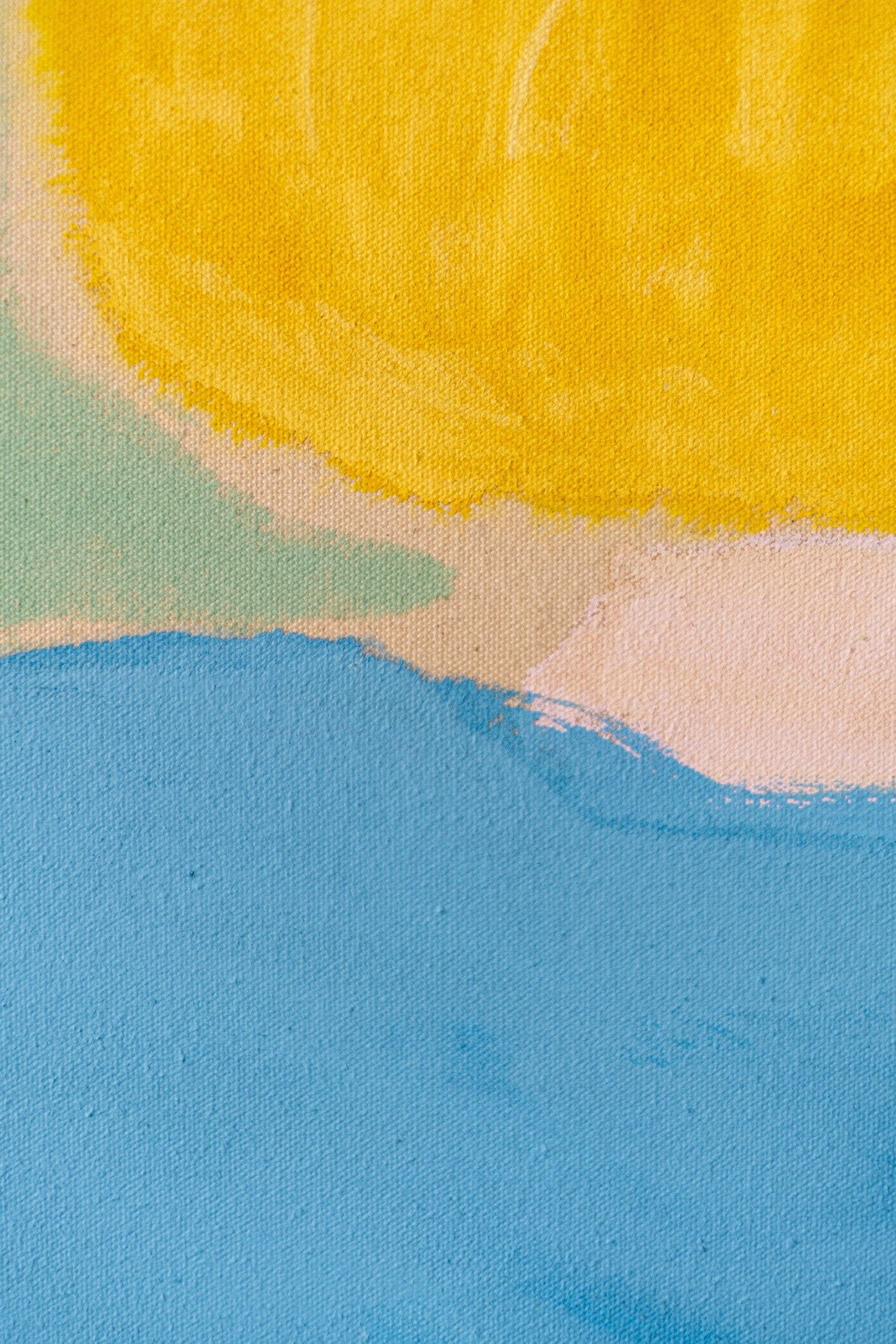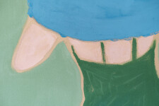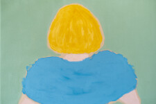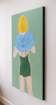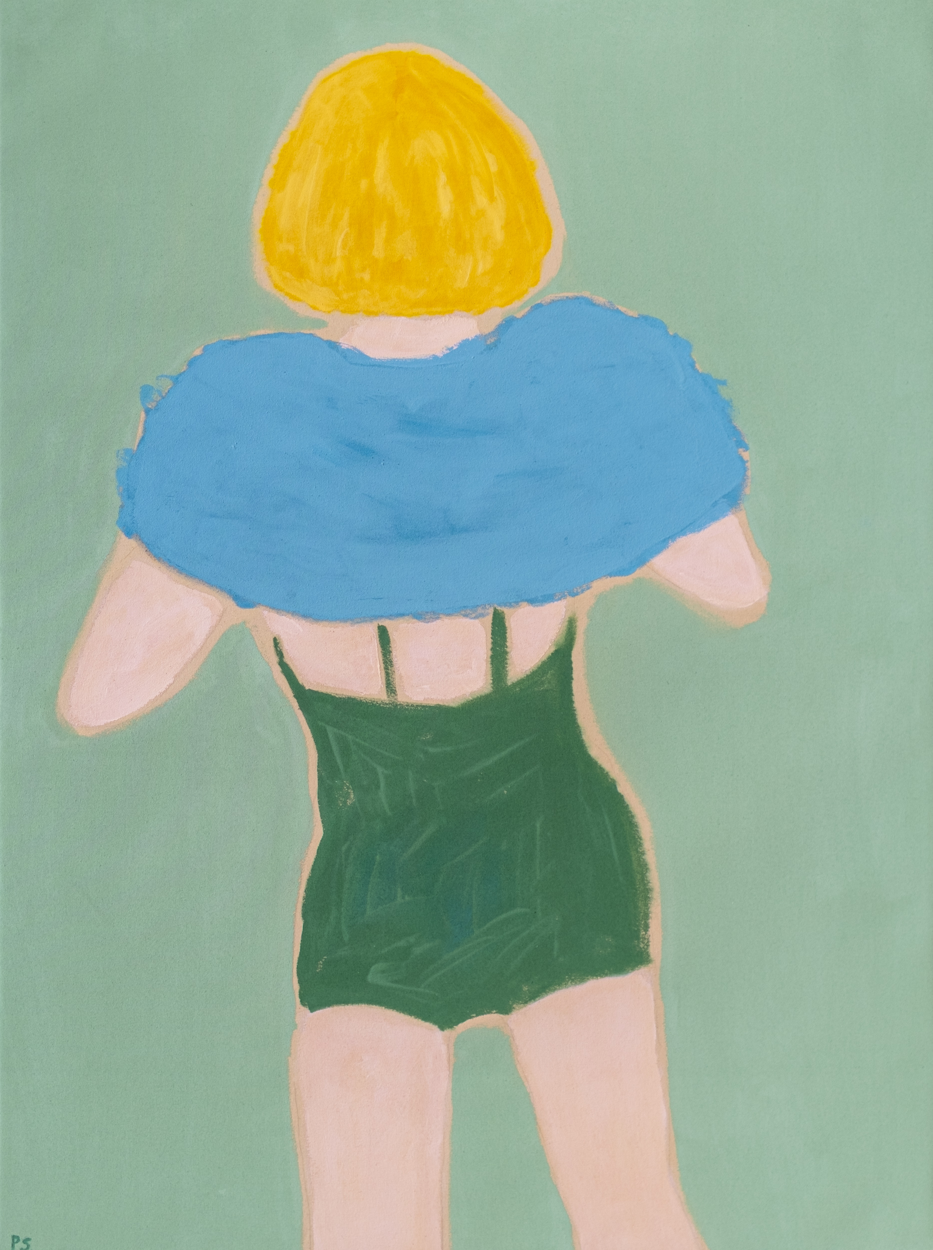 This contemporary figurative painting of a swimmer is by Pat Service.In her decades-long and storied career, Canada’s Pat Service has explored a variety of genres, moving from traditional landscapes to a more minimalist aesthetic. This is one of several paintings she created of swimmers. The palette is bright, fresh and contemporary. The form is simple. The perspective—a young blond-haired girl in a dark green bathing suit viewed from the back. A vivid sky blue towel hangs around her shoulders. The soft green backdrop says ‘summer’ and offers a gentle contrast.