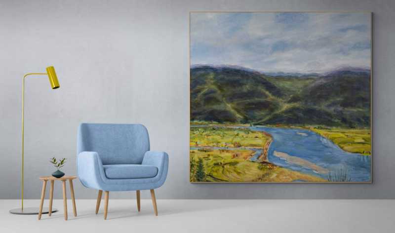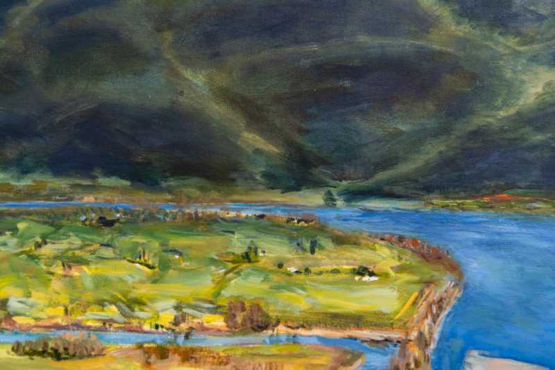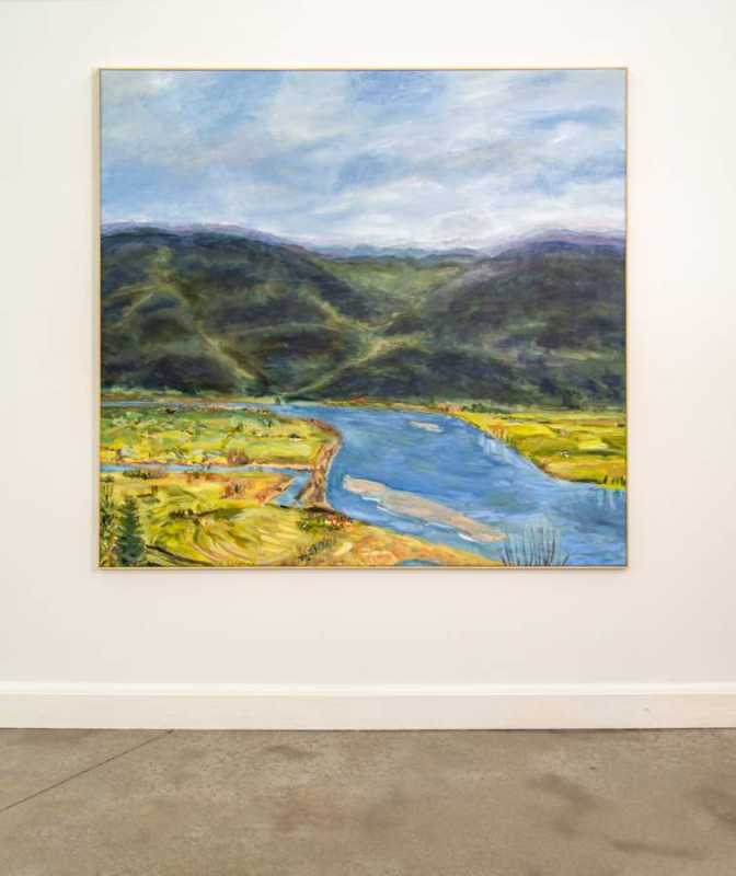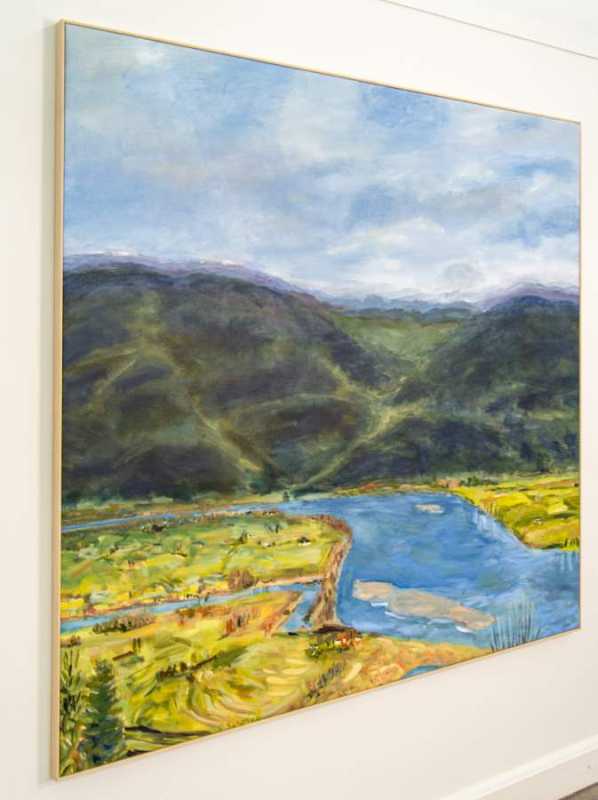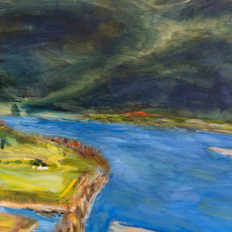 This lovely landscape rendered in a tapestry of rich colours was painted by Canada’s Pat Service. The town of Mission sits on the north shore of B.C.’s Fraser River which winds its way through a valley. Dark green and black depict the mountains looming in the distance—the valley floor a mix of golden yellow, green, and brown earth—the river a deep sky blue.“Living close to nature for the first 12 years of my life indelibly imprinted on me an identity with trees, fields, creeks, lakes, dirt, rocks, the sun, the sky, gardens, plants, flowers, roads, and so on. Every time I start a new painting I am attempting to honour and seal that connection. “Pat Service