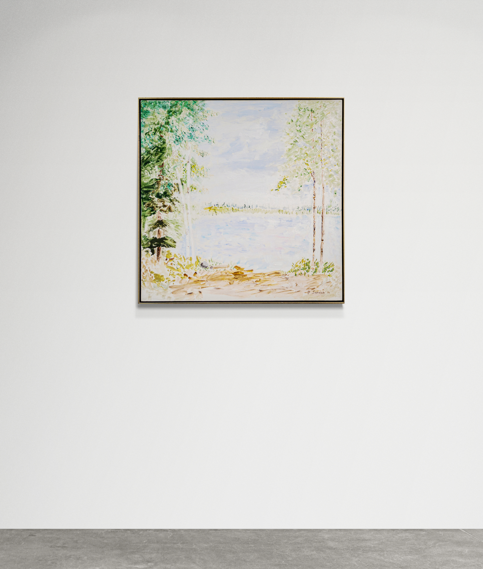 This acrylic landscape by Pat Service captures a lakeside view in summer.Nature has always inspired the artwork of Canadian artist Pat Service. In a career that has spanned more than six decades, she first established her reputation as a superb landscape artist. This is one of her earlier paintings, whose style is reminiscent of the artist David Milne and the impressionists she loved.