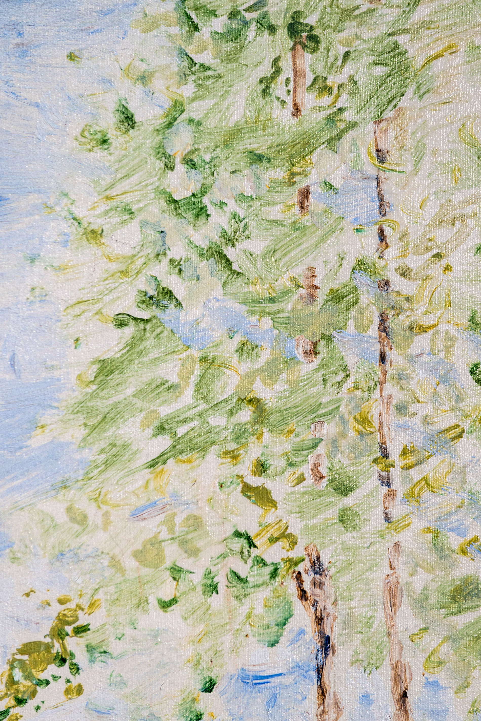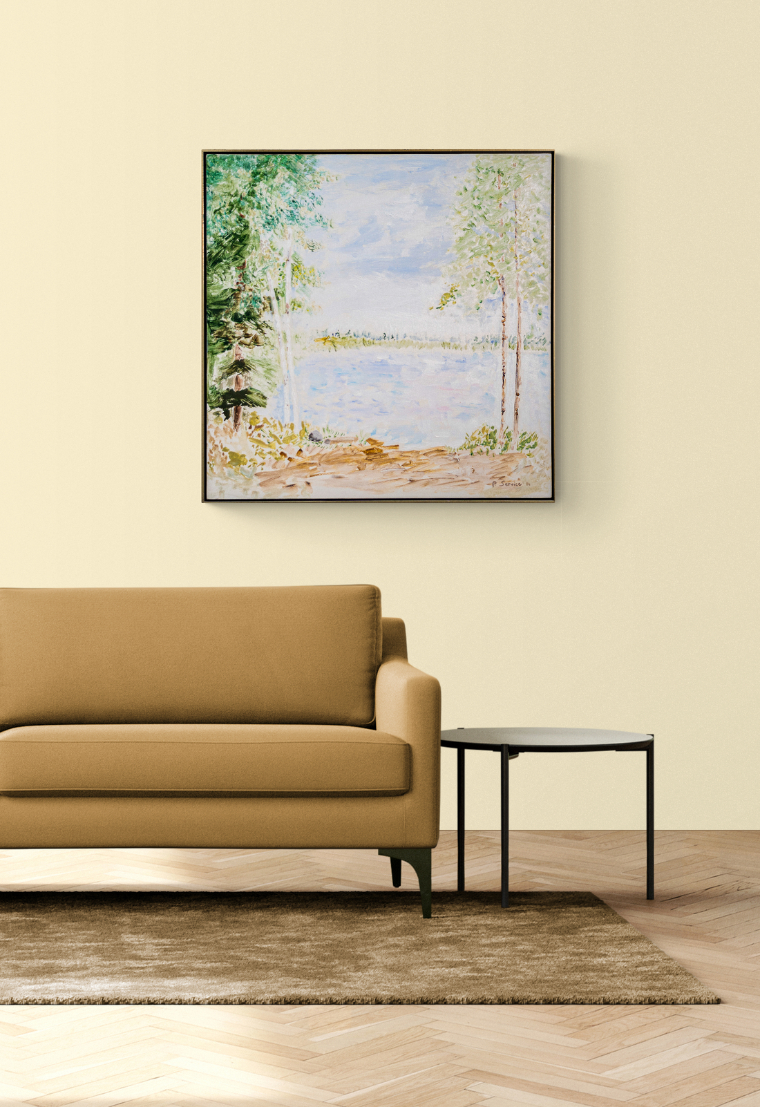 Here, a view of a lake is captured from the shore, framed by trees, the blue of the sky and water dominating the scene. It is a peaceful composition in an earthy colour palette of blues, greens, brown and white.