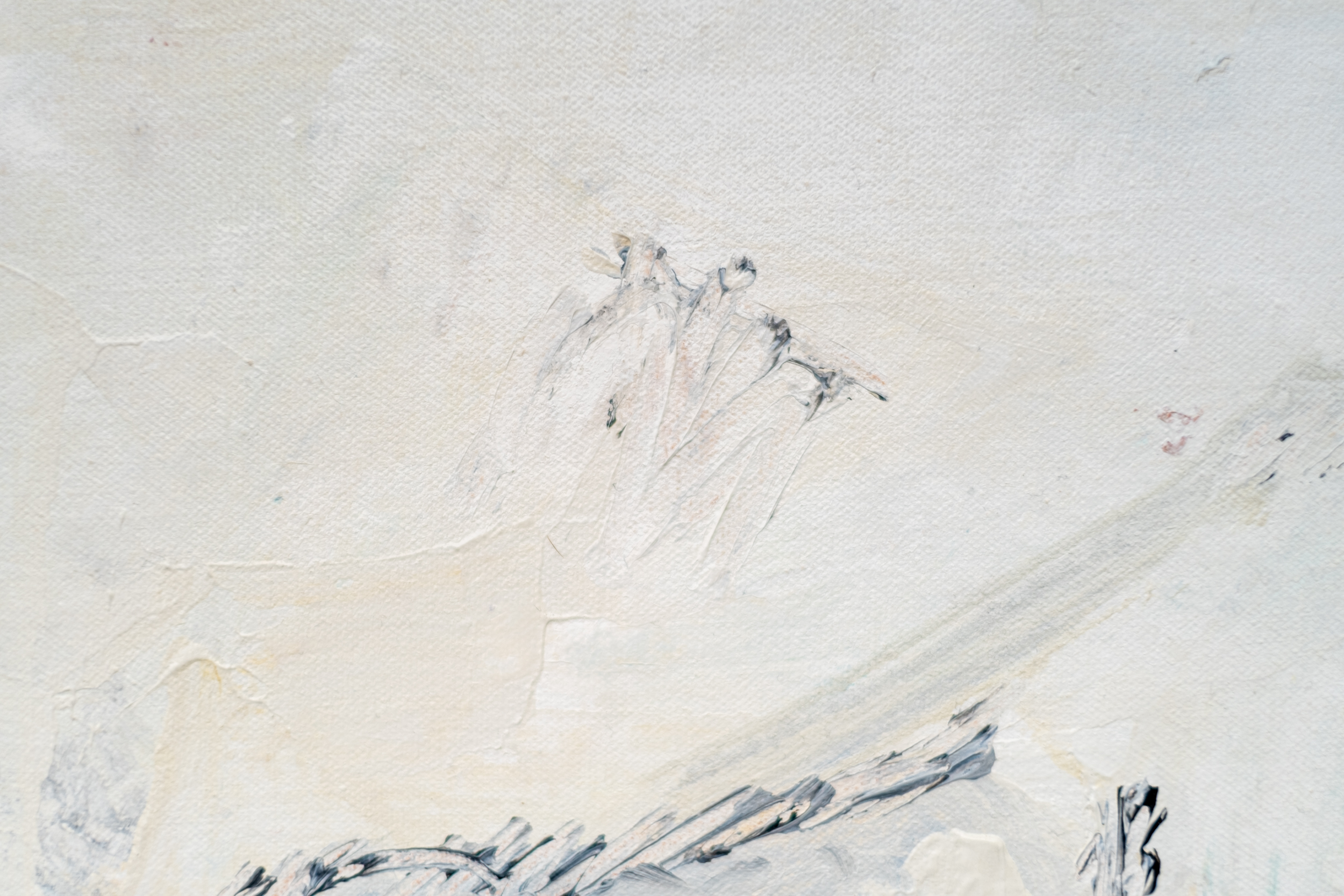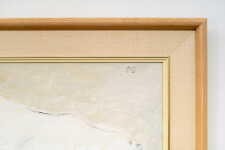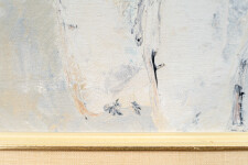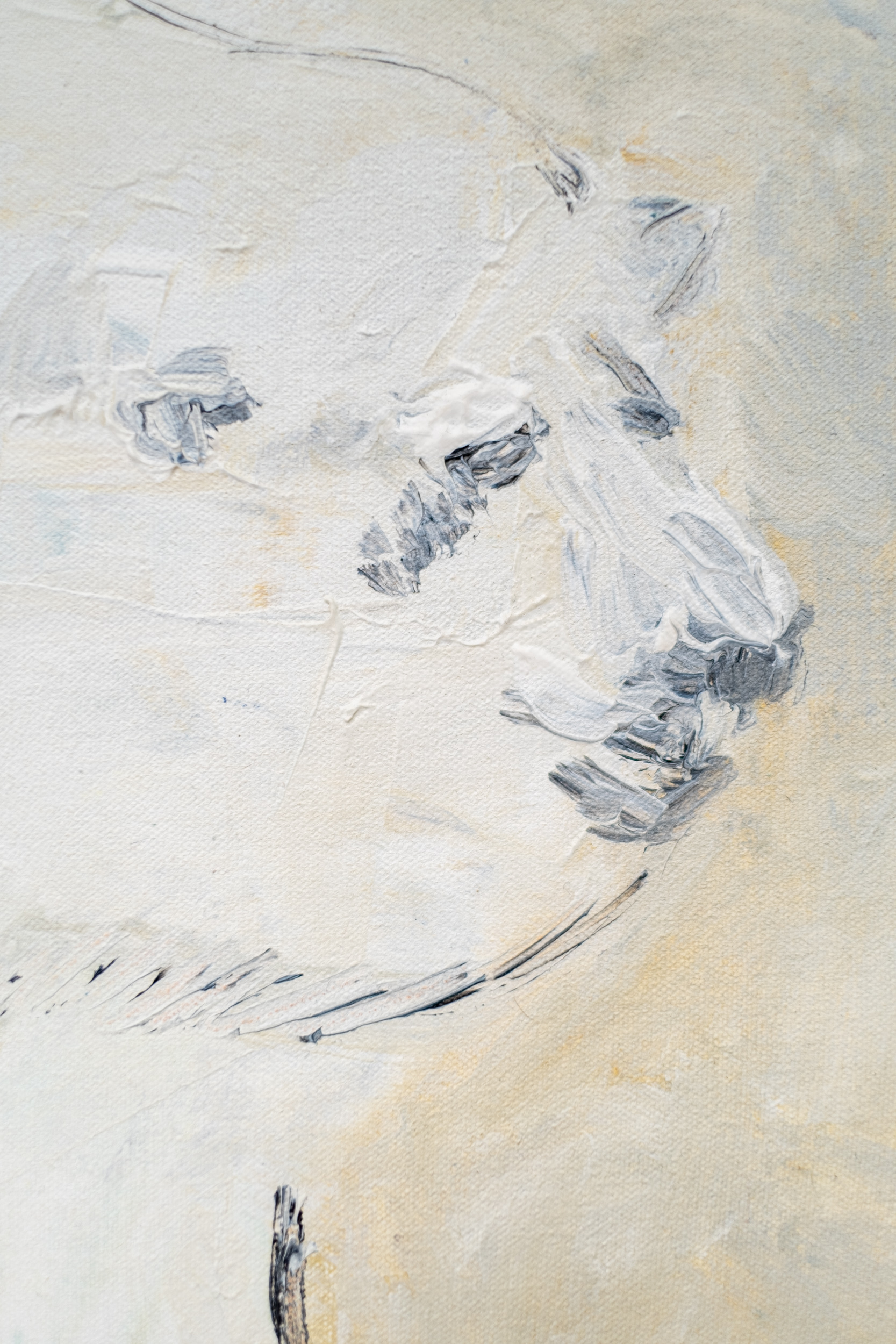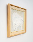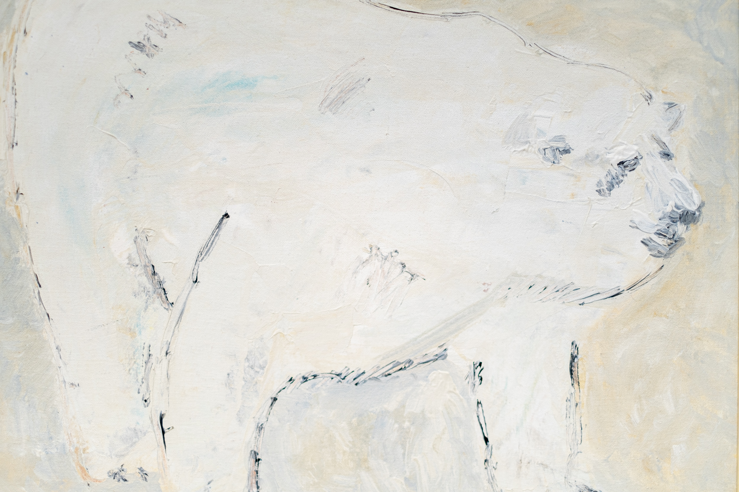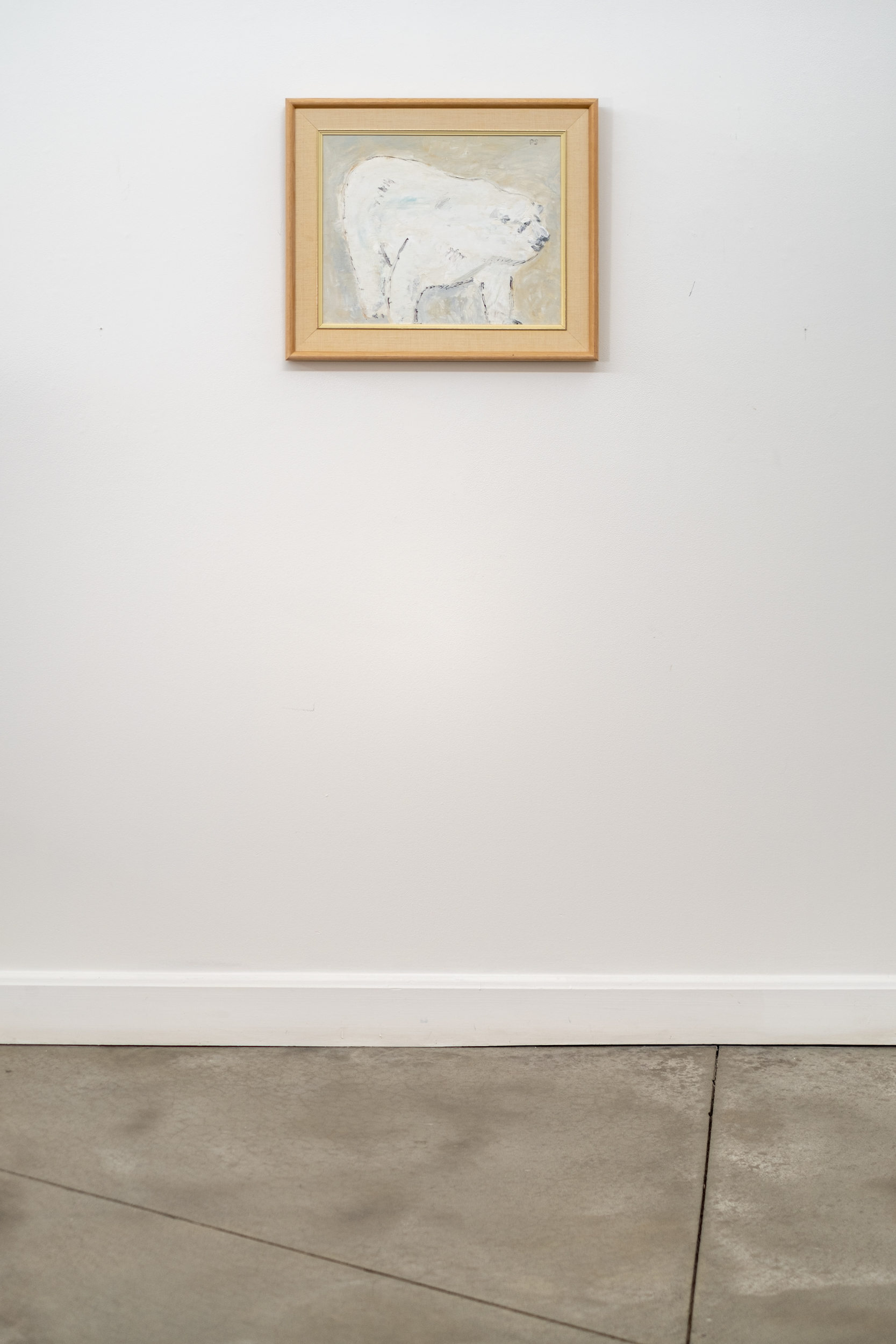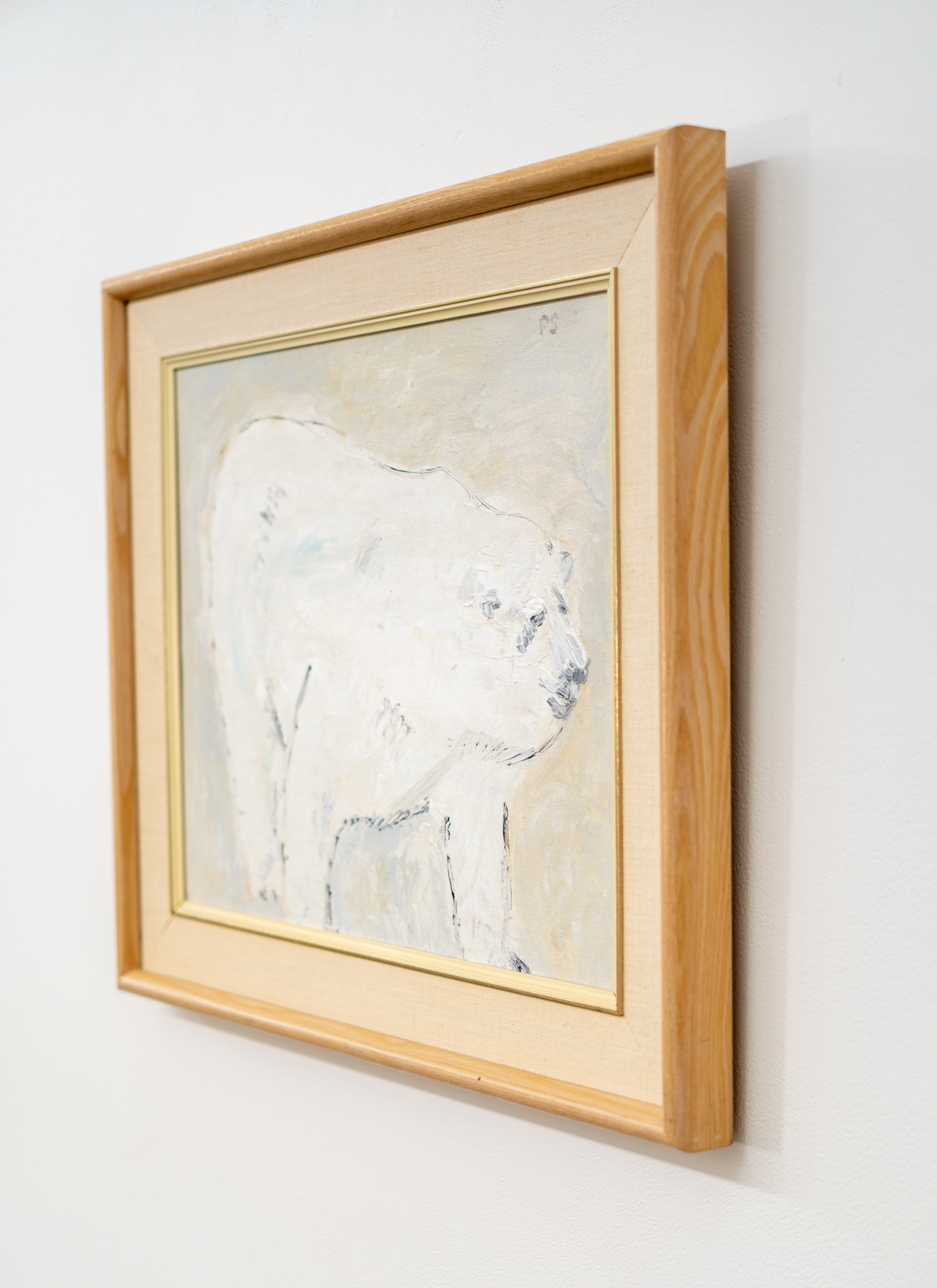 This acrylic figurative painting of a polar bear is by Pat Service.This Canadian artist is known best for her bucolic landscapes, but her extensive oeuvre also includes figurative work… both people and animals. Here, the impressive size of a white polar bear caught in mid-stride fills the canvas. A neutral backdrop allows the faithful rendering of the bear to dominate.