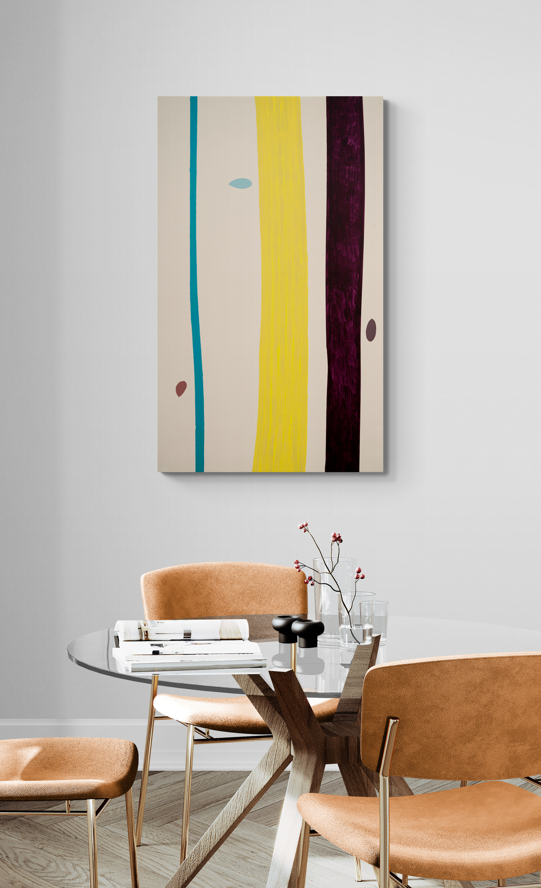 Her chosen subjects remain rooted in nature; a habit honed from her early days of painting en plein air in the majestic forests that blanket her home province of British Columbia. Trees have been a much loved and familiar image. This minimalist portrait of three trees pared down to an essential linear form pop from the canvas in a teal blue, golden yellow and ink black. Leaf-like forms drift beside them.