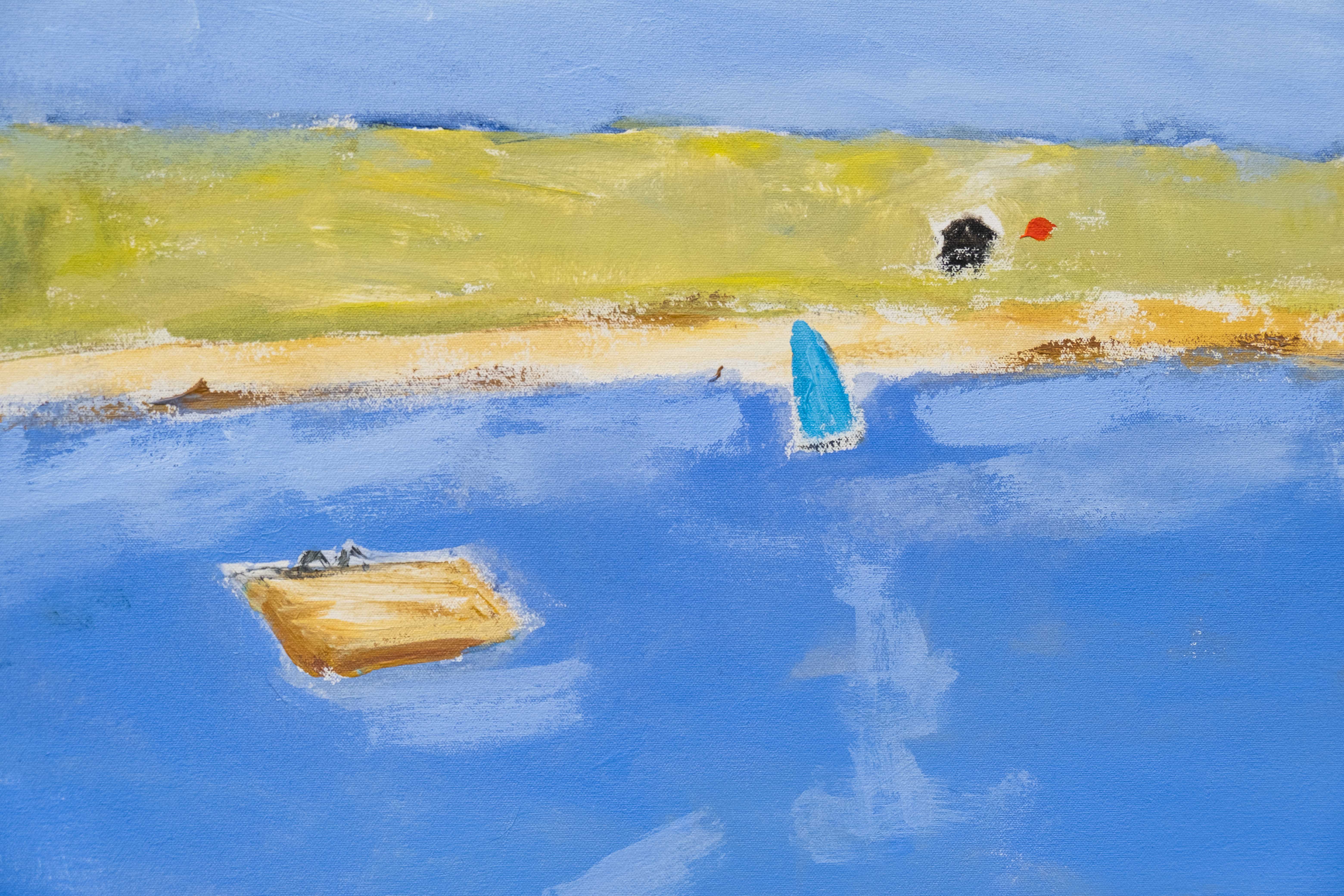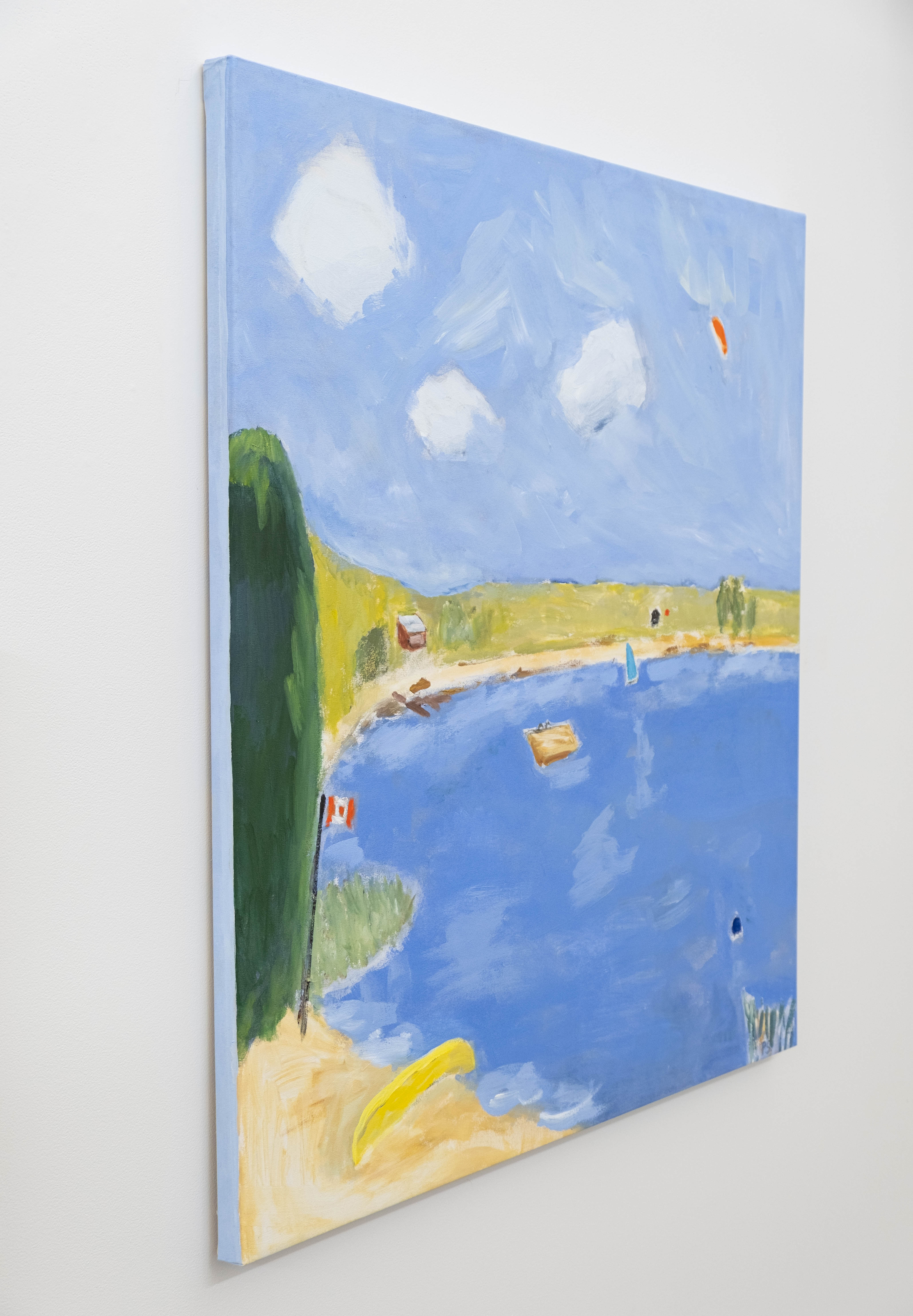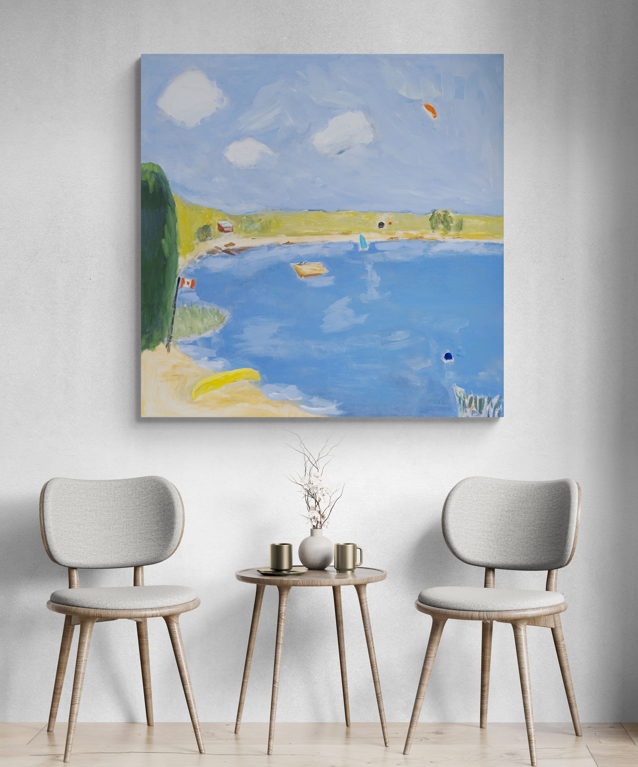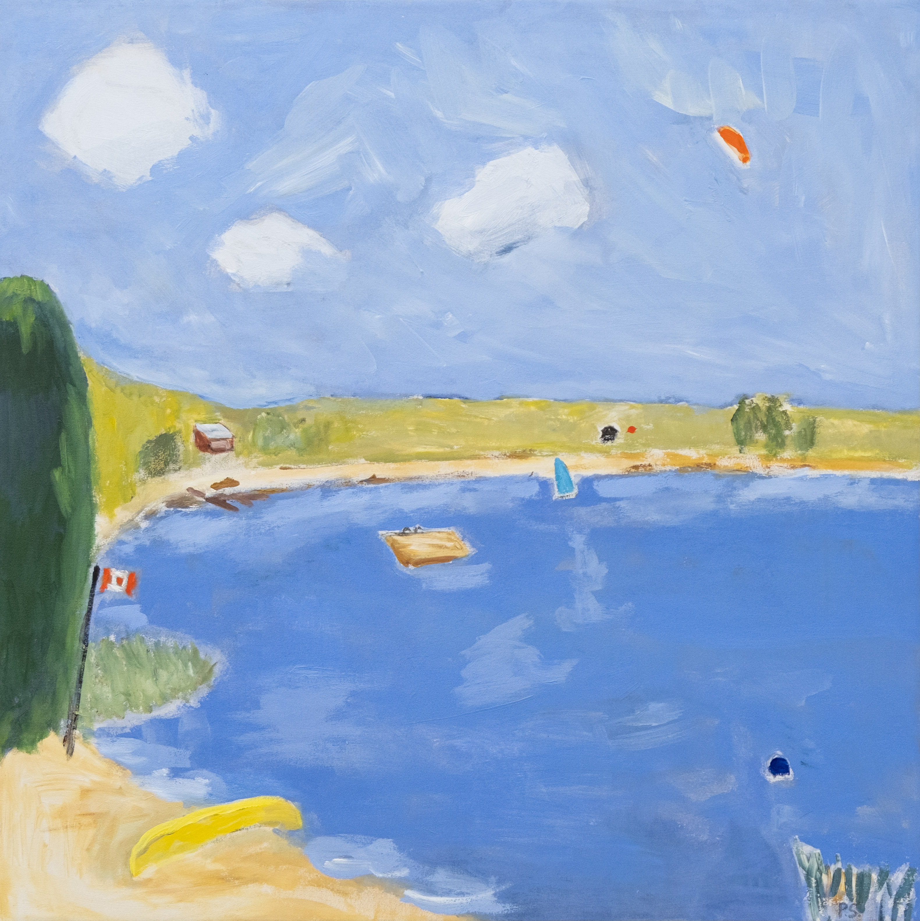 The colours of summer by the lake are celebrated in this pastoral painting by Pat Service. The Canadian artist is known for her landscapes—this minimalist piece illustrates a classic lake and beach view—the deep blues of the cloud-filled sky and lake, green fields, a red cabin, the Canadian Flag, turquoise and yellow canoes and a floating dock. It’s a serene scene many of us return to year after year.“I seek a new way to see what I have seen before, with playfulness, remainders of memories, and expansive space.” Pat Service