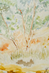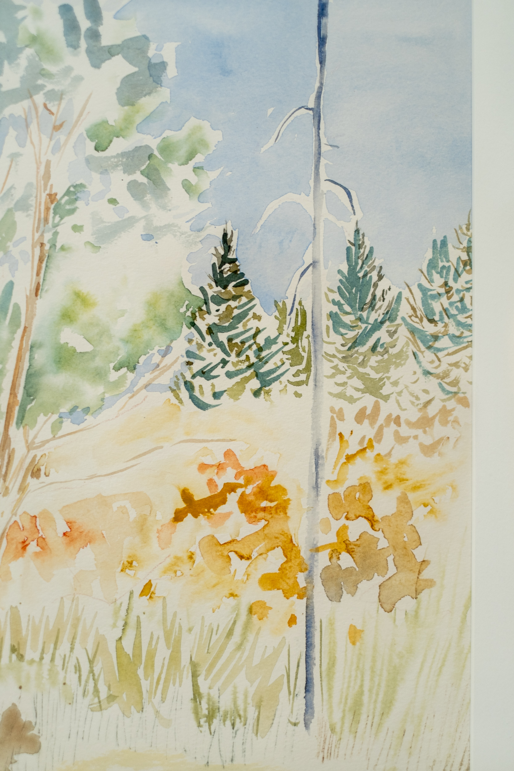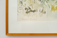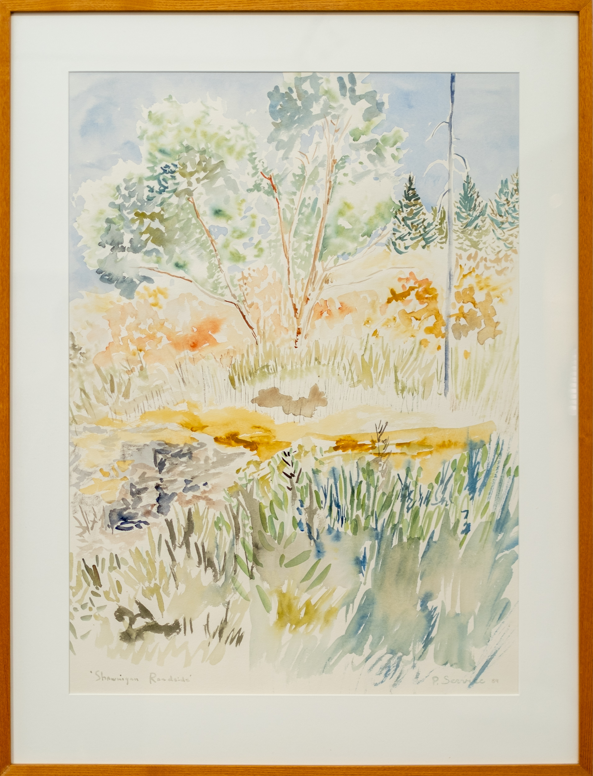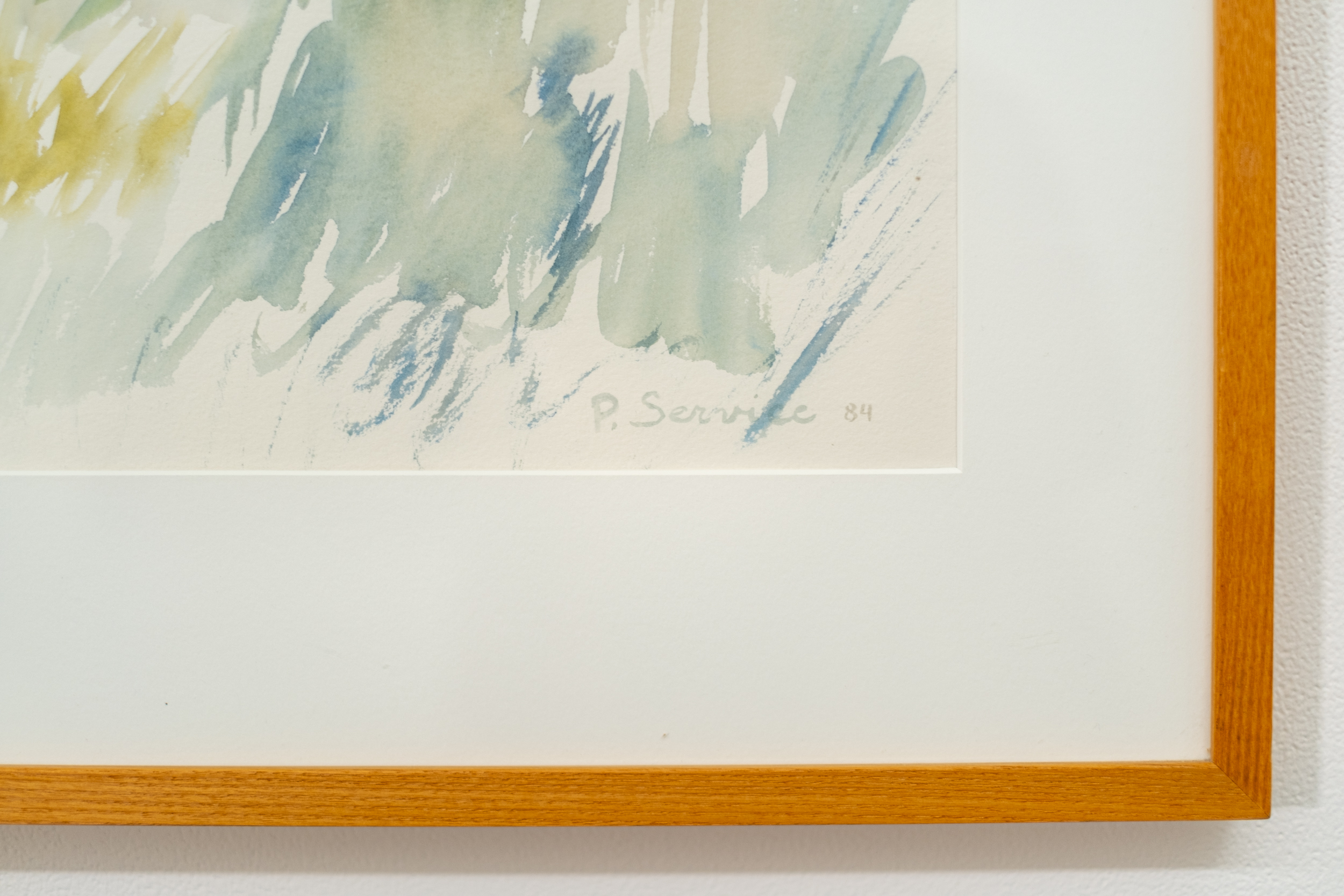 This watercolour landscape by Pat Service captures a countryside view from the road in summer.Highly regarded as one of Canada’s finest landscape artists, Pat Service’s earliest works reveal her love of impressionism. Finely detailed brushwork and a pastel-coloured palette are displayed in this peaceful painting of the countryside.