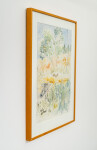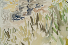 Colours in soft blues, greens, orange, yellow and green are further softened by Service’s practice of thinning paint, rendering it almost translucent in appearance. Shawinigan is a village on Vancouver Island in British Columbia. This is one of two paintings called Shawnigan Roadside—the other is an acrylic painting.