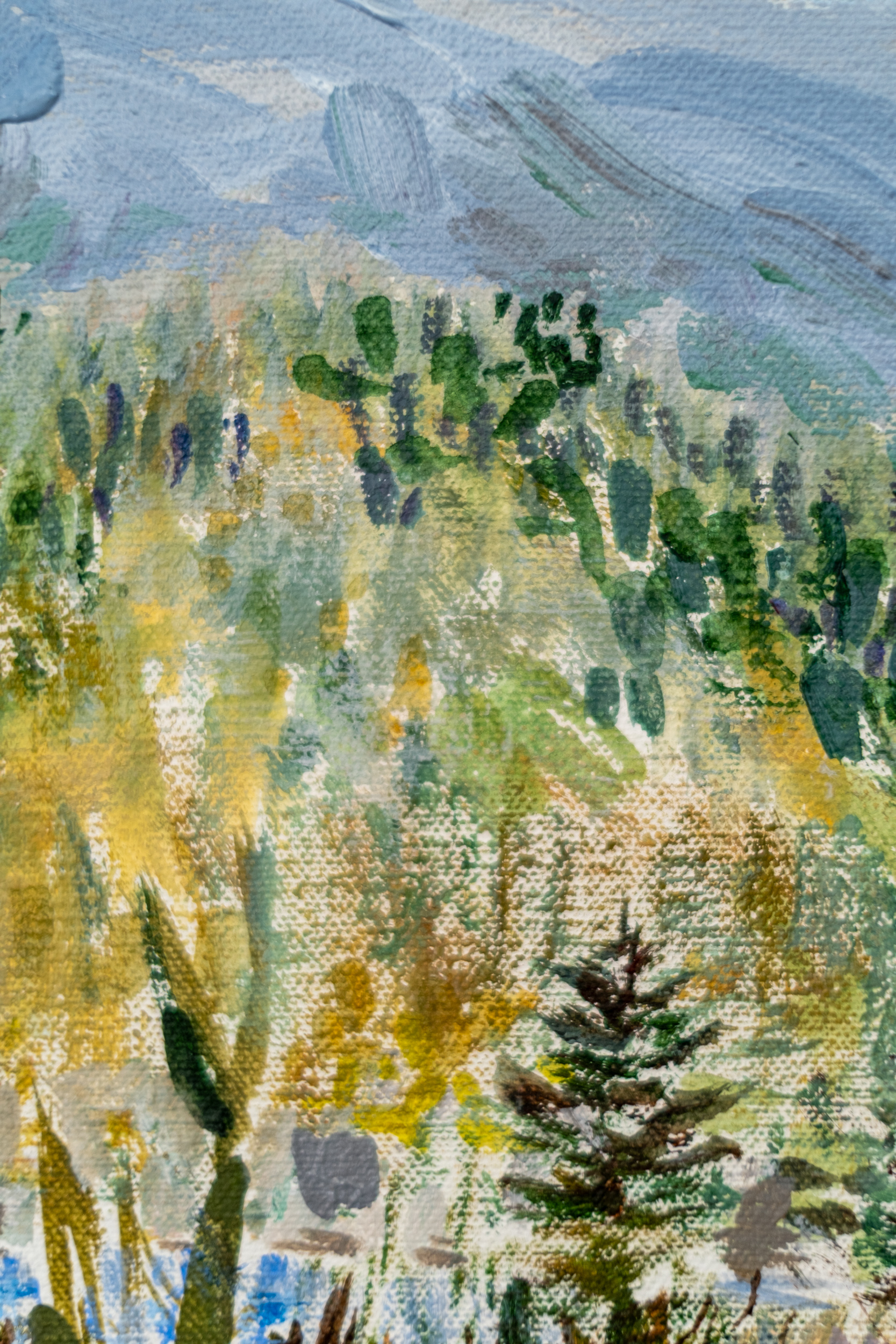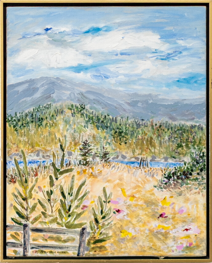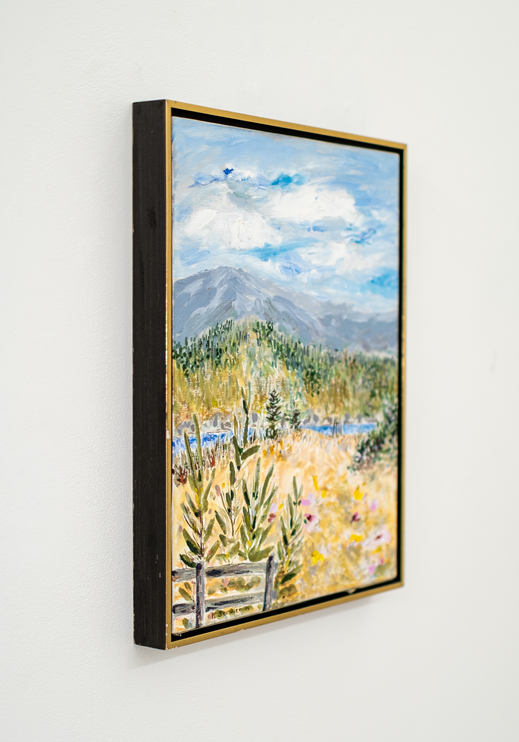 Her impressive oeuvre began documenting the mountains, forests and water she grew up near on the coast of British Columbia. Her style in this earlier piece is noticeably influenced by a love of the Impressionists. Delicate brushstrokes define a cloud-filled blue sky above a looming mountain —the lush green forests, a river winding through the center of the canvas, anchored by a section of fence and dabs of pink wildflowers. It is a serene scene rendered in pastoral colours.