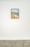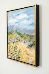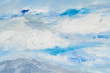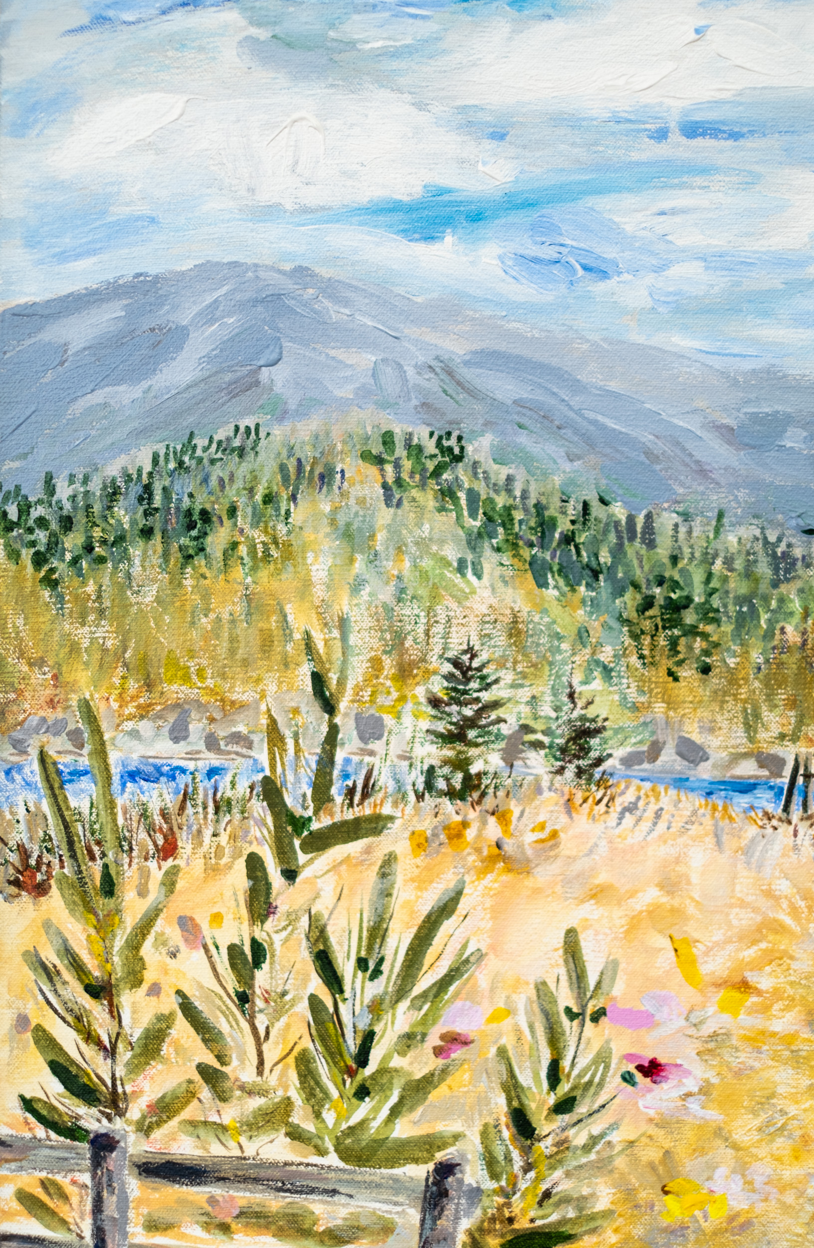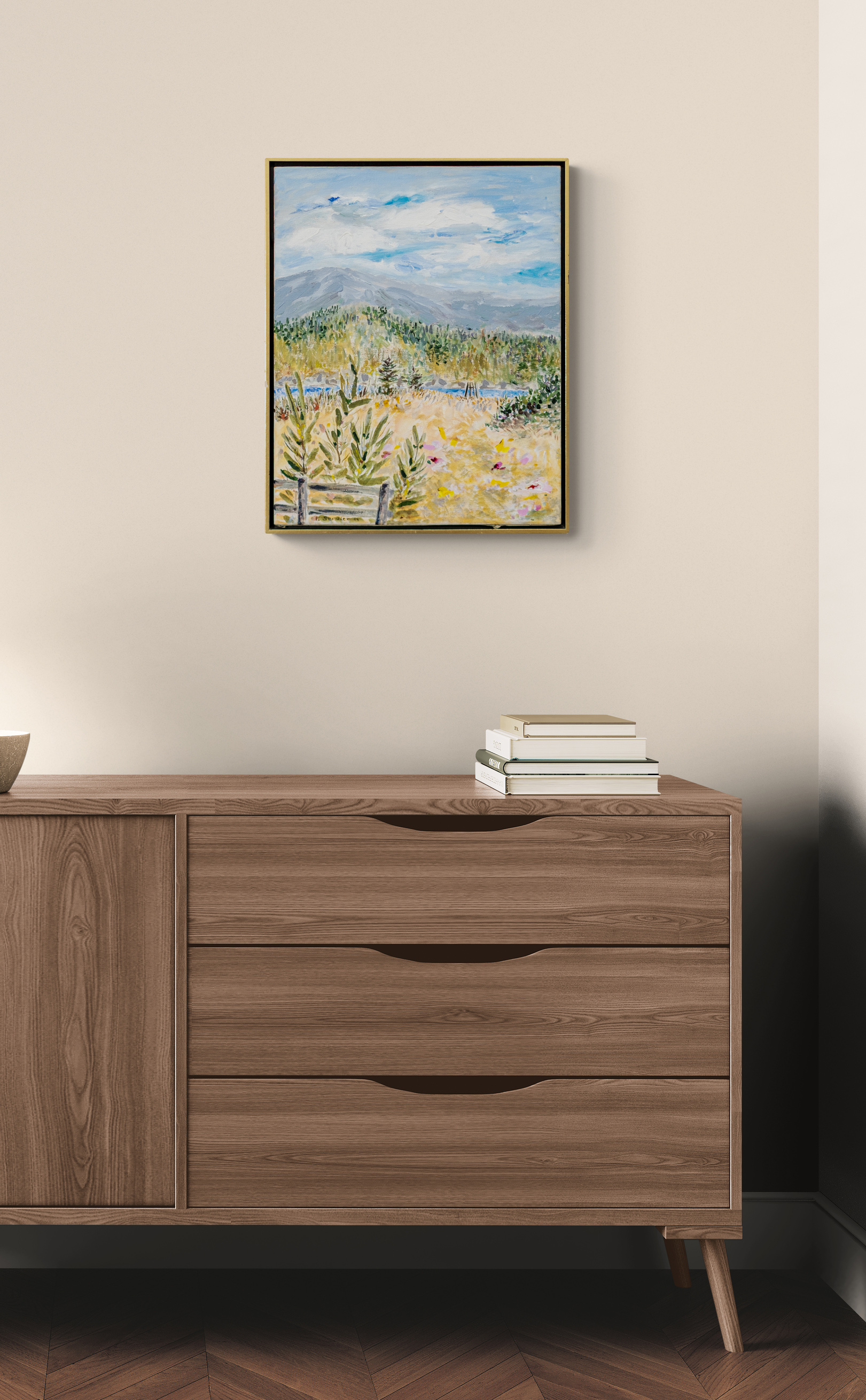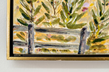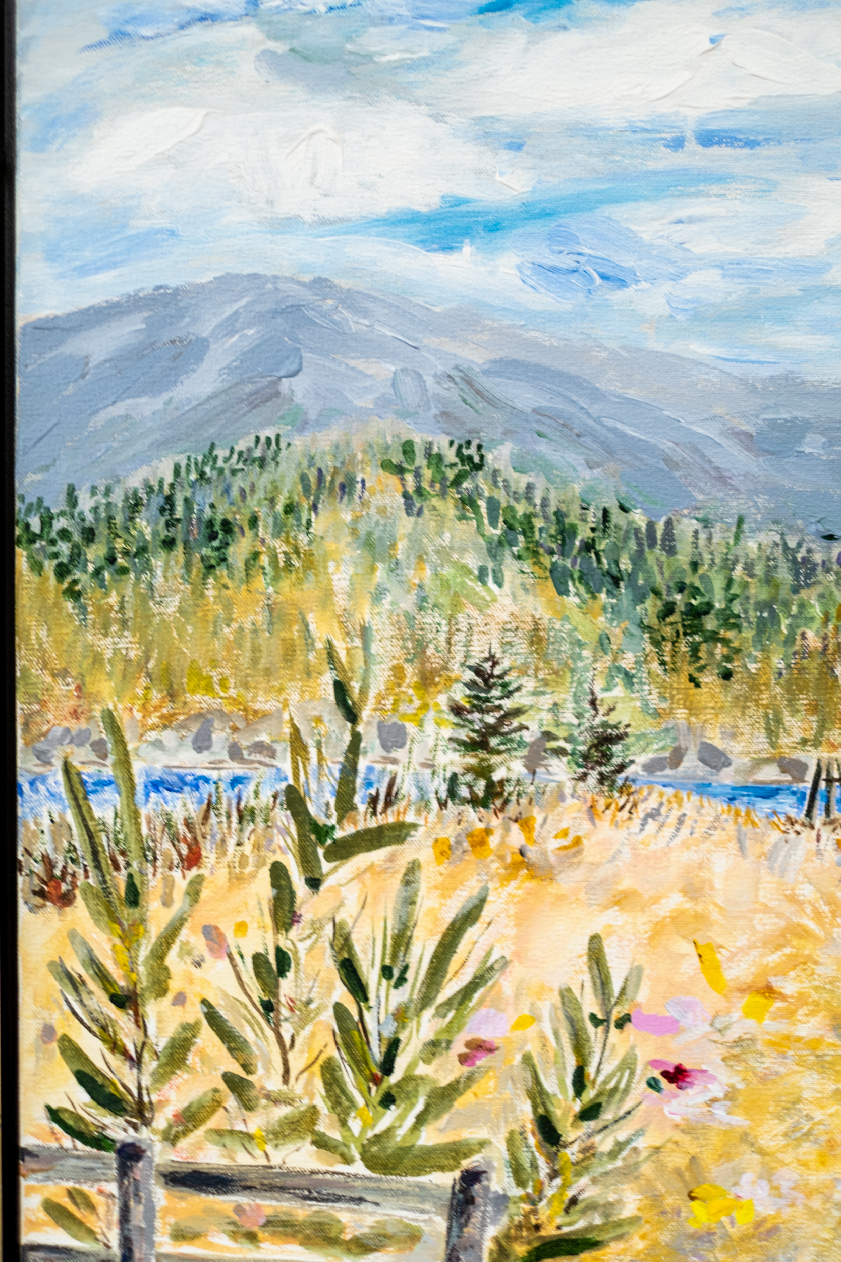 Her impressive oeuvre began documenting the mountains, forests and water she grew up near on the coast of British Columbia. Her style in this earlier piece is noticeably influenced by a love of the Impressionists. Delicate brushstrokes define a cloud-filled blue sky above a looming mountain —the lush green forests, a river winding through the center of the canvas, anchored by a section of fence and dabs of pink wildflowers. It is a serene scene rendered in pastoral colours.