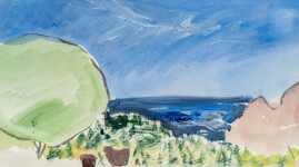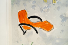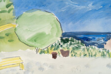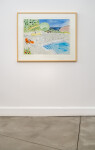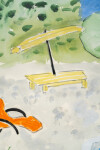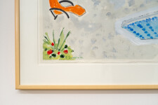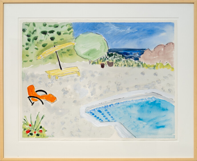 This watercolour on paper is rendered with expressive brushstrokes in a bright modern palette—blues, yellow, green, orange, red, white, and black. The mood created by the empty pool invites the viewer to dive in. One of a series.