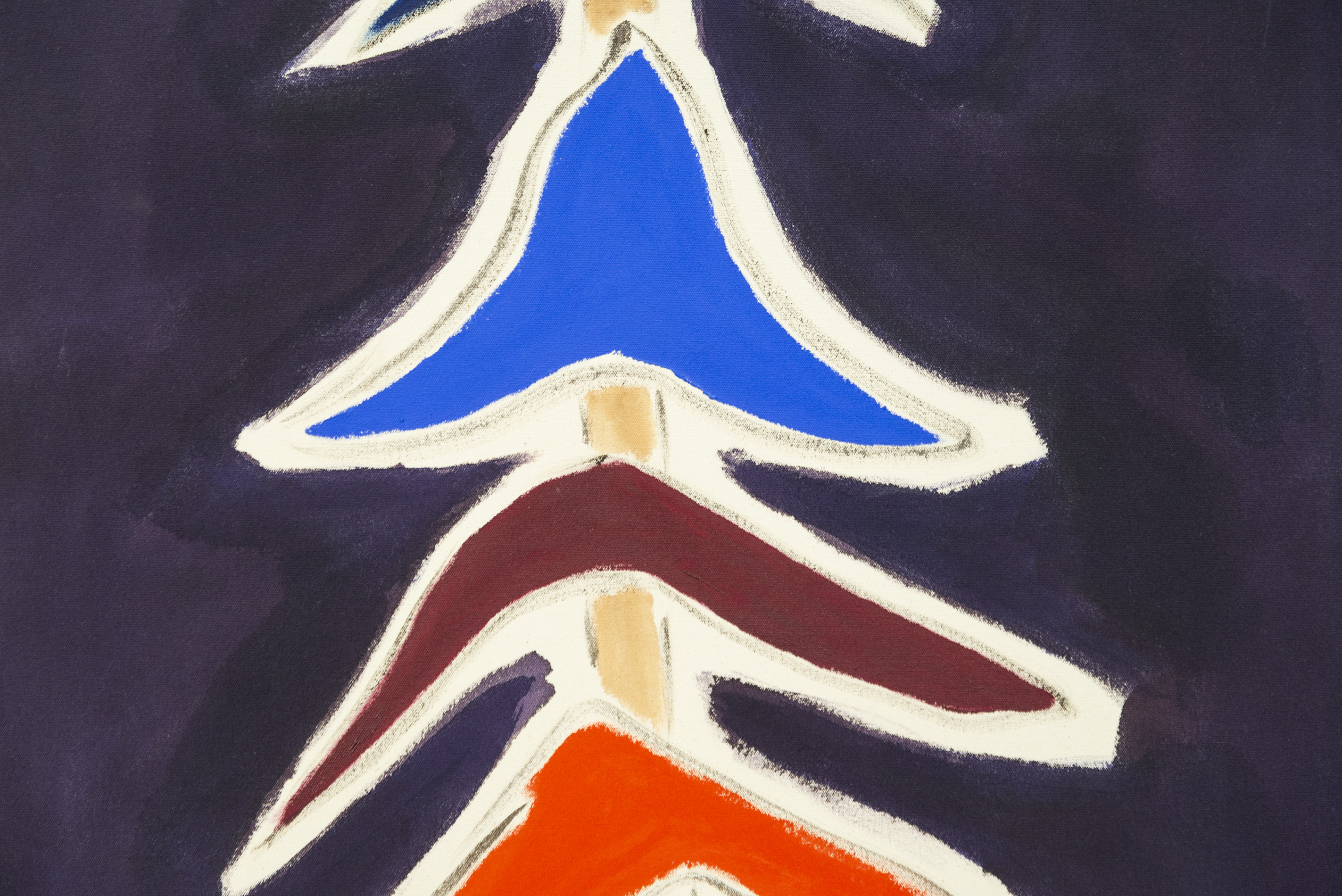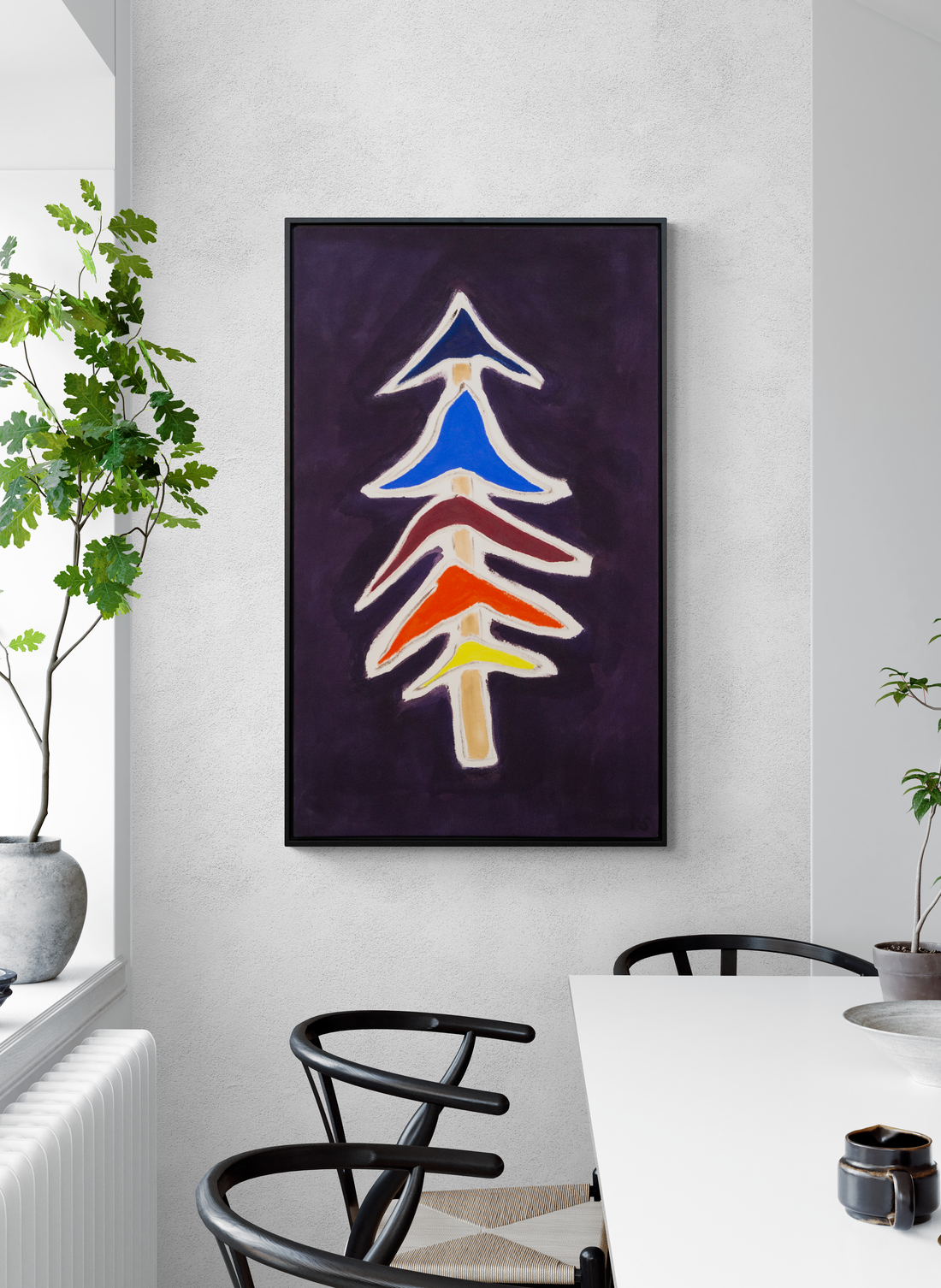 Considered one of Canada’s finest landscape artists, Pat Service’s work has evolved from classic form to minimalism. This is one of a series of paintings she created to celebrate her love of nature and specifically the unique character of trees. This piece—bright colours—in blue, red and yellow with a bold ‘pine tree ‘form pops against the jet-black backdrop.“Mister ‘Top Hat’ is more formal, spreading his branches out in a definite sort of way, not fooling around: ‘this is me and this is who I am’. The name ‘Top Hat’ suits this more sophisticated way of being.” Pat Service
