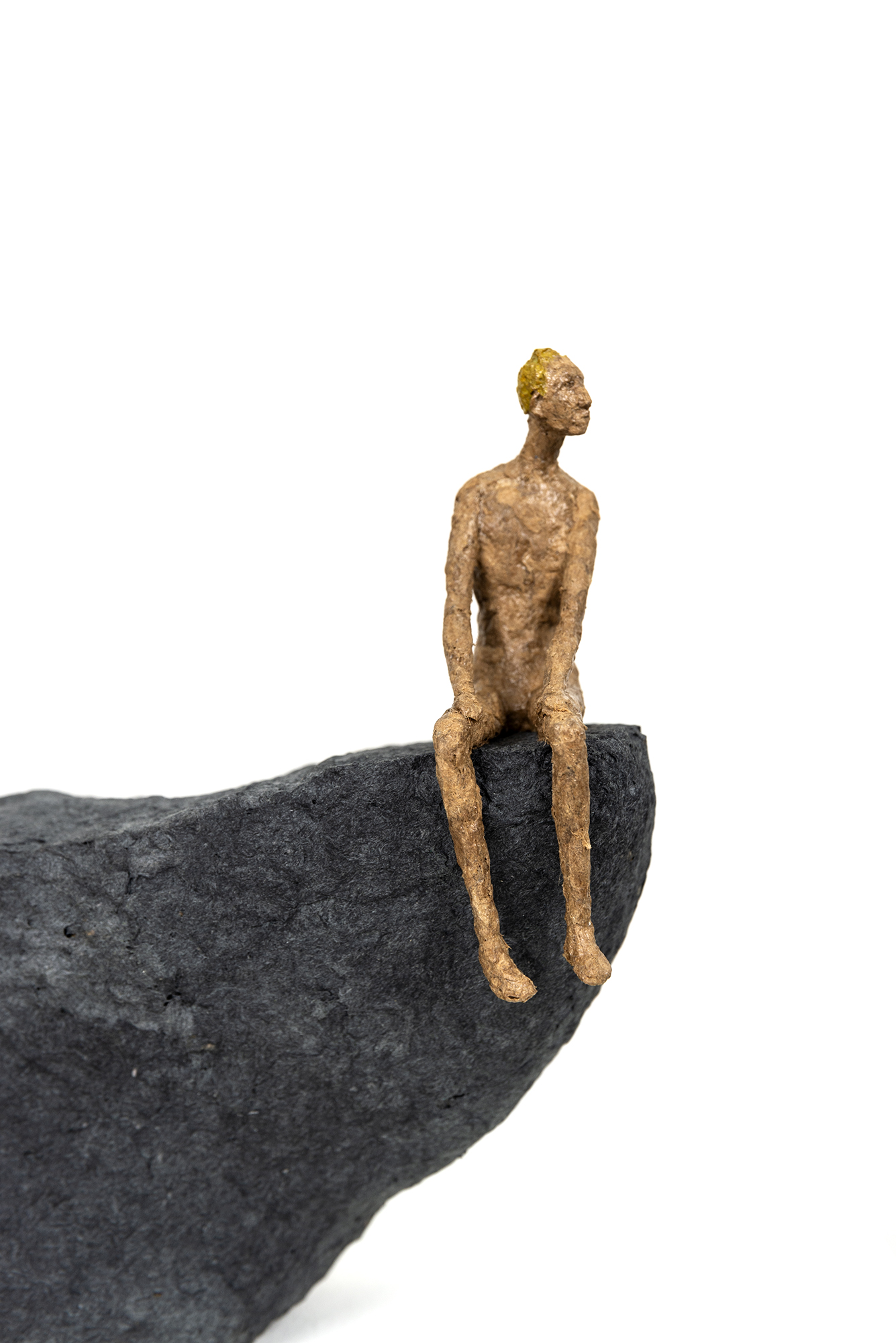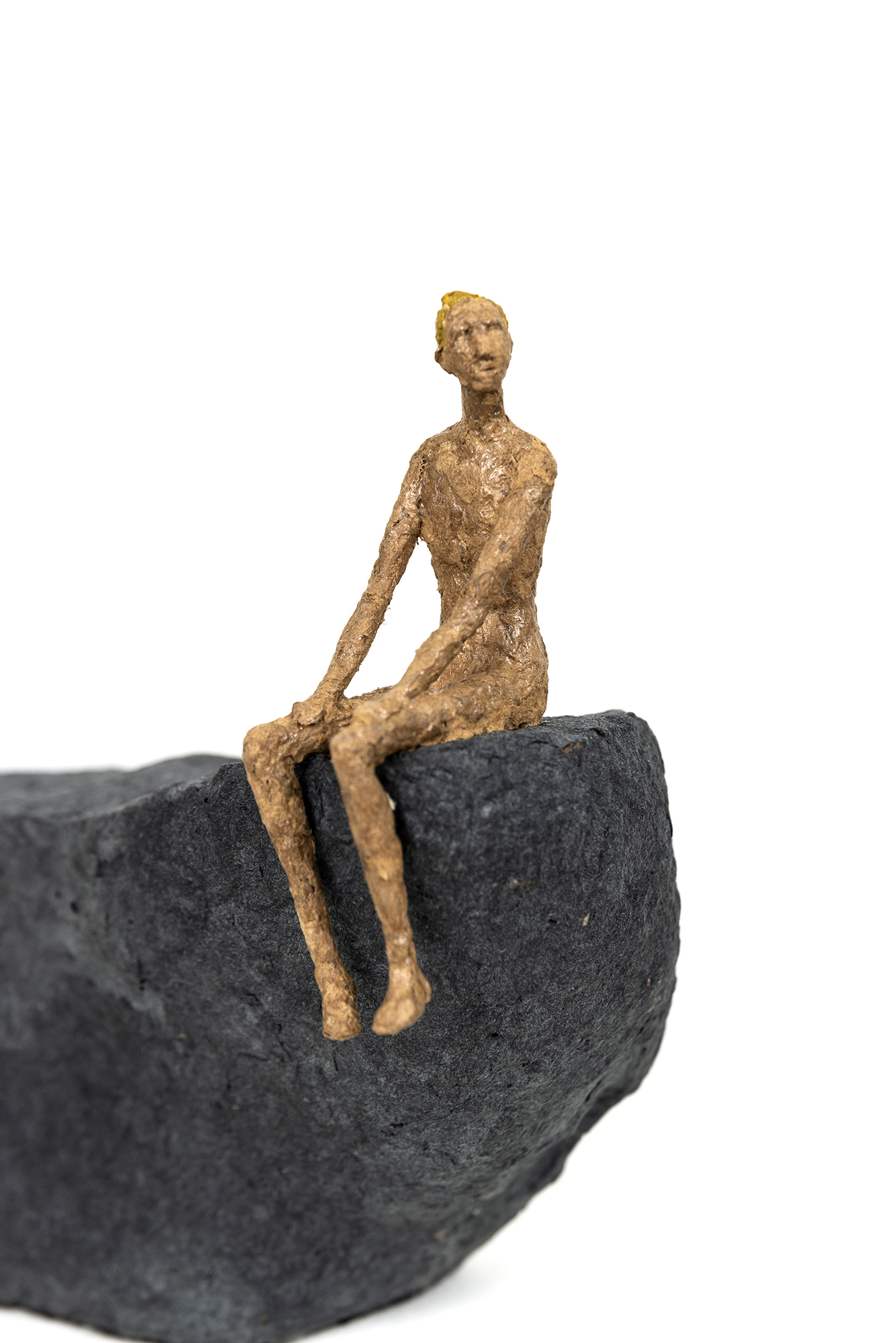 Gustavo is a young unadorned male figure handmade from golden-coloured papier mâché. He is sitting on a gray textured ‘rock’-like form, his head turned as if looking off into the distance—a contemplative pose. Both hands rest on his legs that dangle over the edge of the ‘rock.’