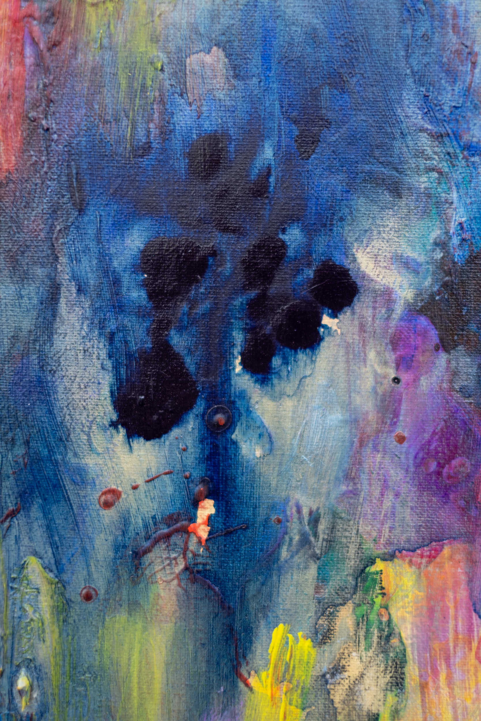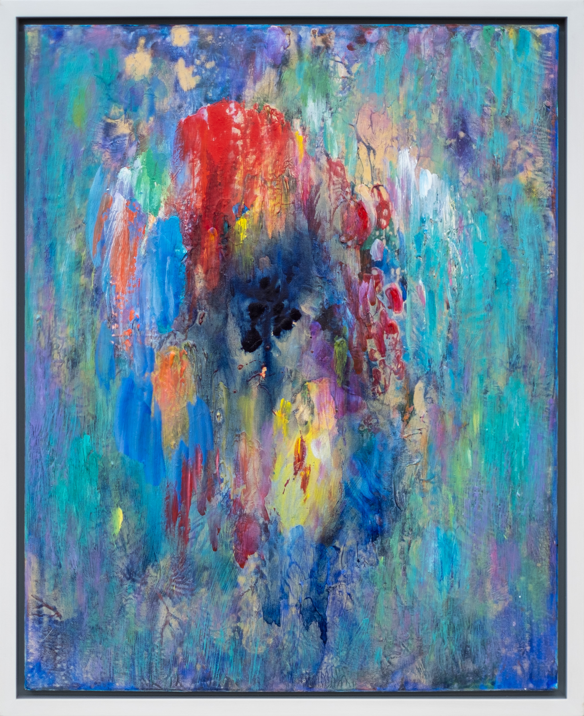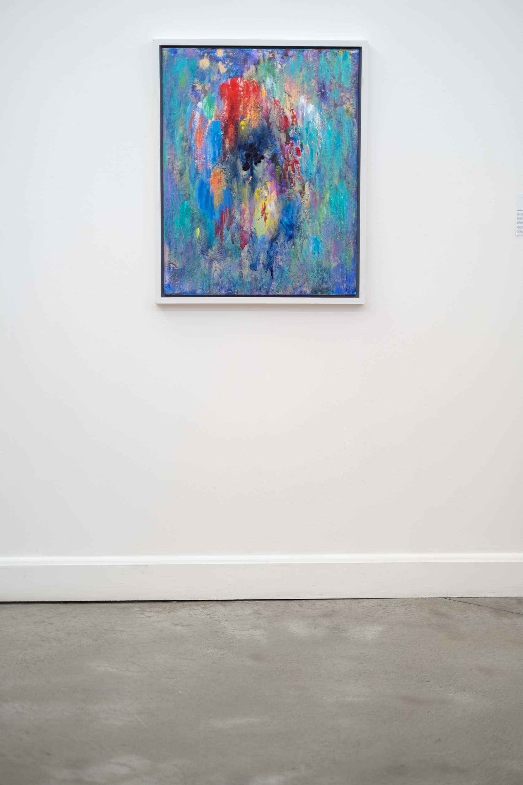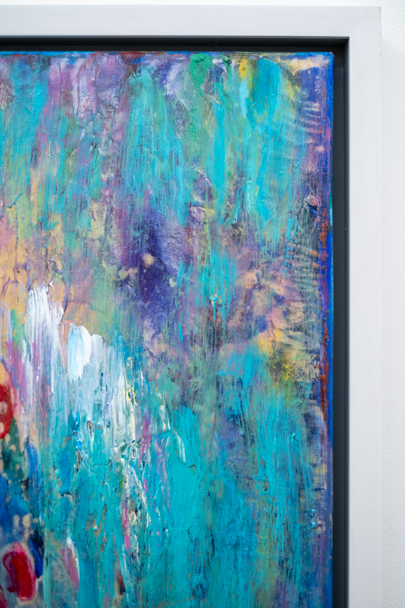 This large abstract expressionist painting by Paul Fournier has a tropical theme.The fantastical worlds of Paul Fournier capture the beauty of nature in all its colorful glory. This is one of a series of paintings inspired by the light, vivid colors and dreamlike imagery of the tropics. Fournier doesn’t work from a sketch. His weightless, lyrical form is created by ‘drawing with a paintbrush.’ This joyful painting attempts to emulate the explosion of color one sees in tropical azure blue waters—yellow, orange, green, melon, red, purple and white.
