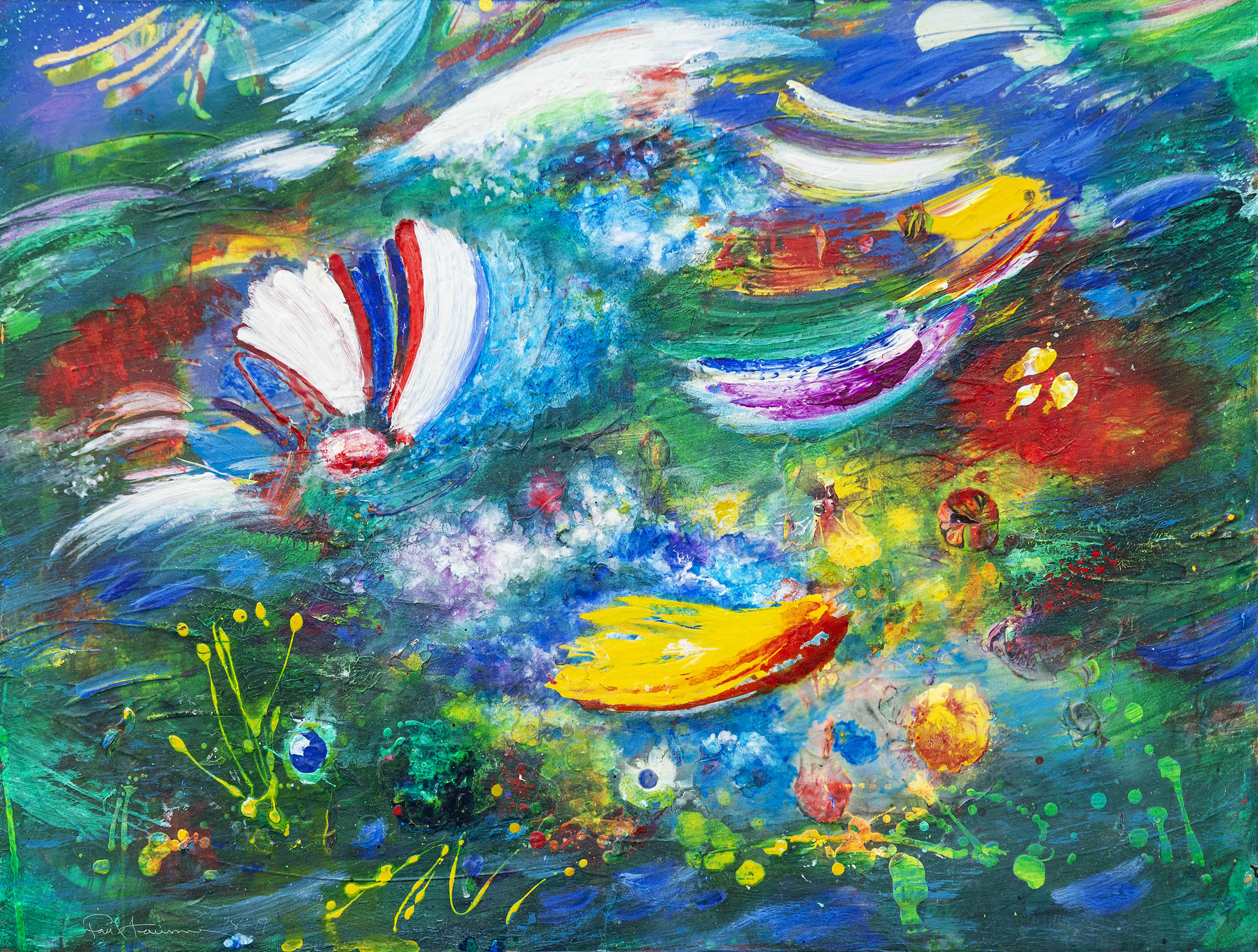 “I went down to the coral reefs in the Bahamas…in the sixties…ten days on a schooner…I snorkelled…and looked down…there’s no horizon line down there…When I saw the reefs just alive with colour…a wonderland…I just wanted to paint pictures that didn’t mimic the coral reef but were teaming with interest and life….” Paul Fournier