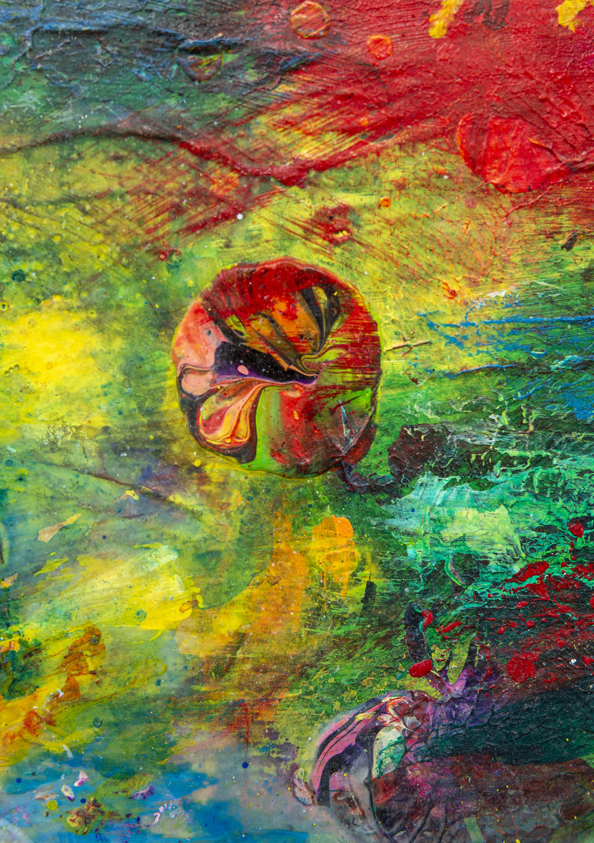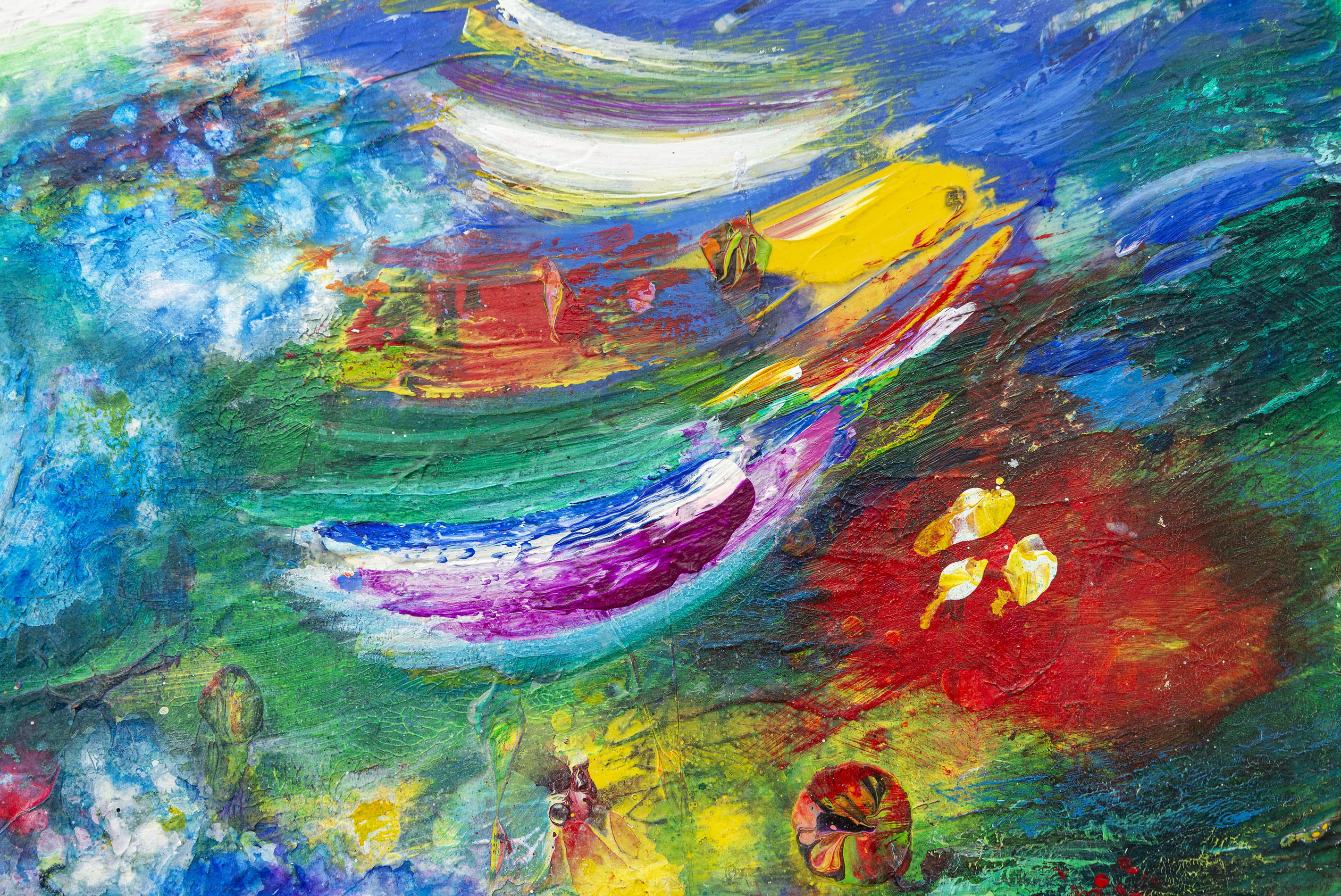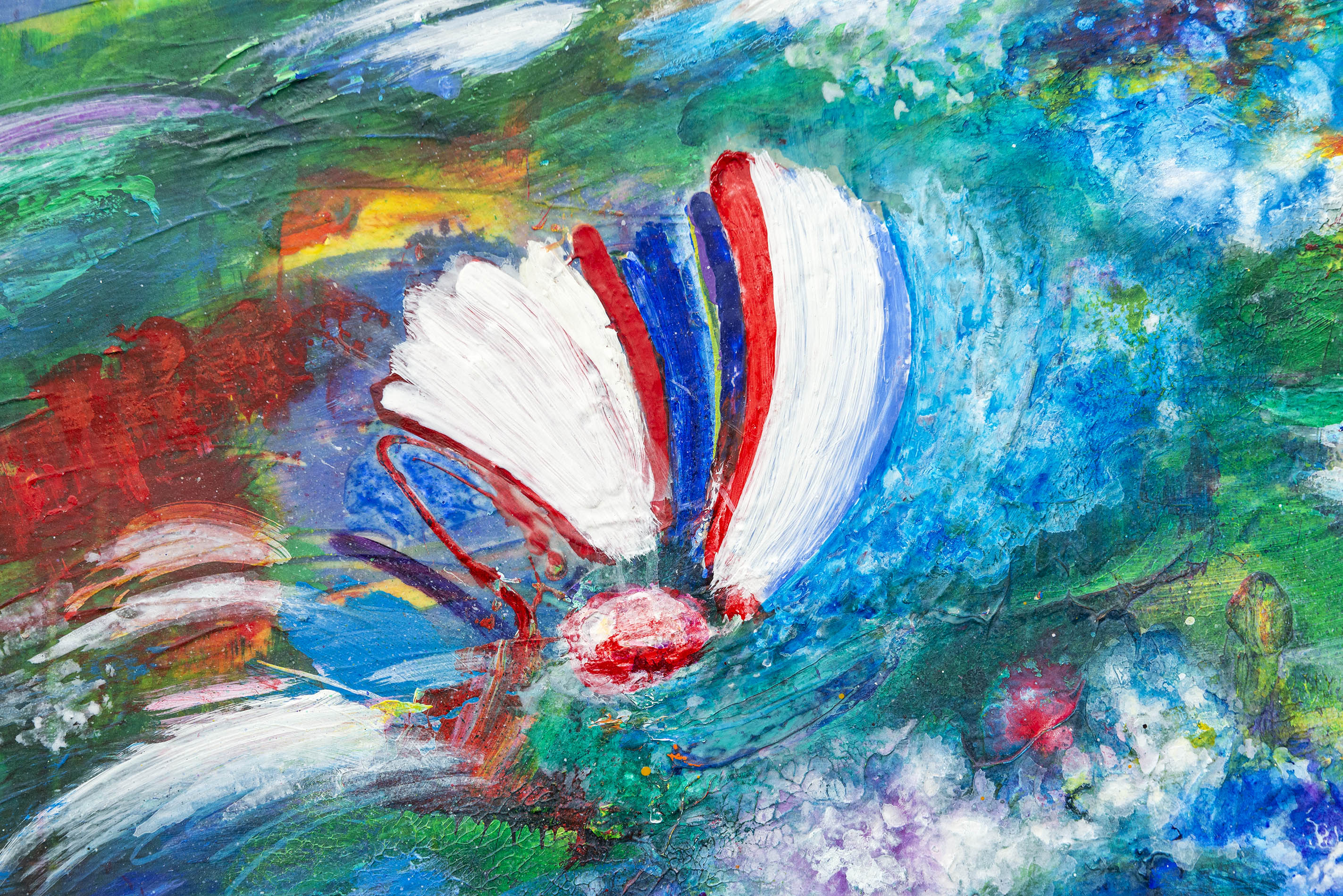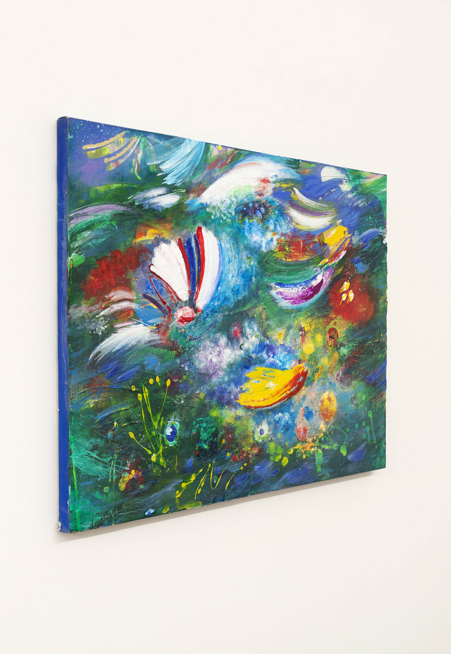 This colourful expressionist acrylic painting by Paul Fournier has a bird theme.He is known as the ‘exotic modernist’—Canada’s Paul Fournier has always loved the world of colour and how nature’s palette rendered in expressive form could evoke emotion. The brushwork here is spontaneous, and the dynamic imagery is reminiscent of a bird in flight. Paint drips and curated markings add to the energy of this painting. Inspired by the brilliant colours he once experienced in the Caribbean, Fournier’s paintings are often a wild melange of colours—reds, blues, purple, yellow, turquoise, and white. This joyful piece is named after the ‘Fire Bird,’ the ancient mythological creature also known as the phoenix.