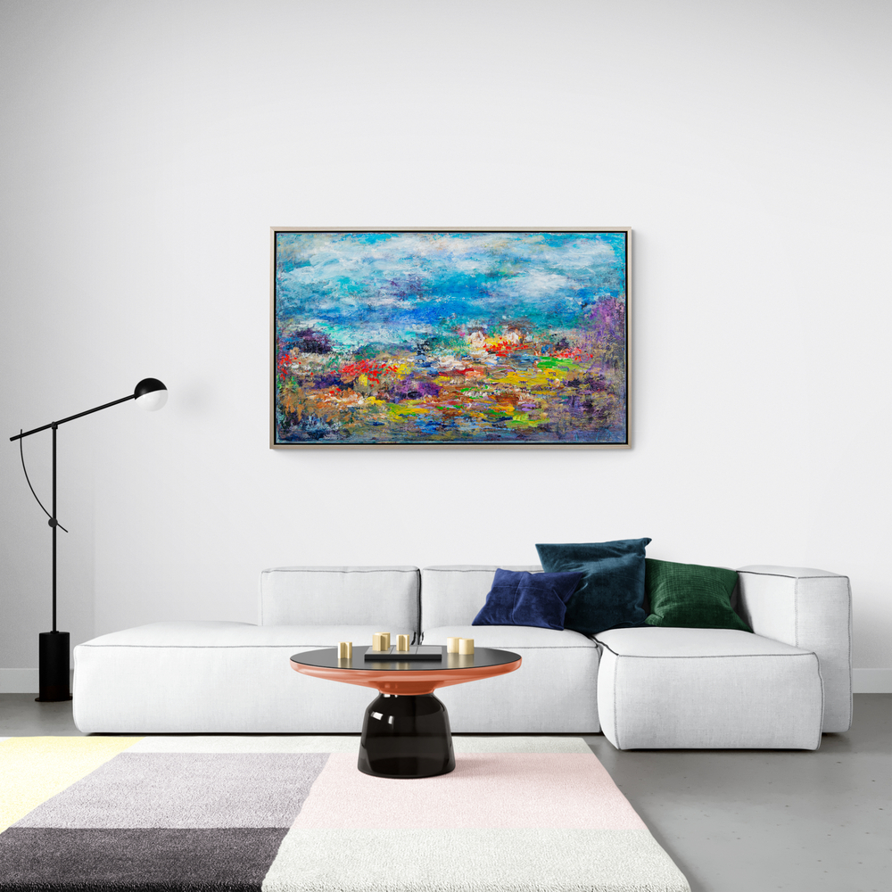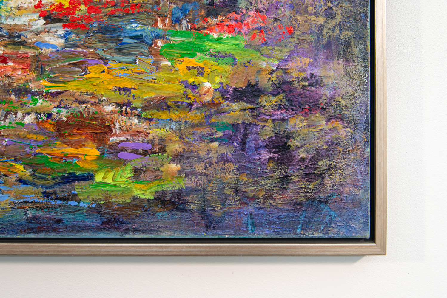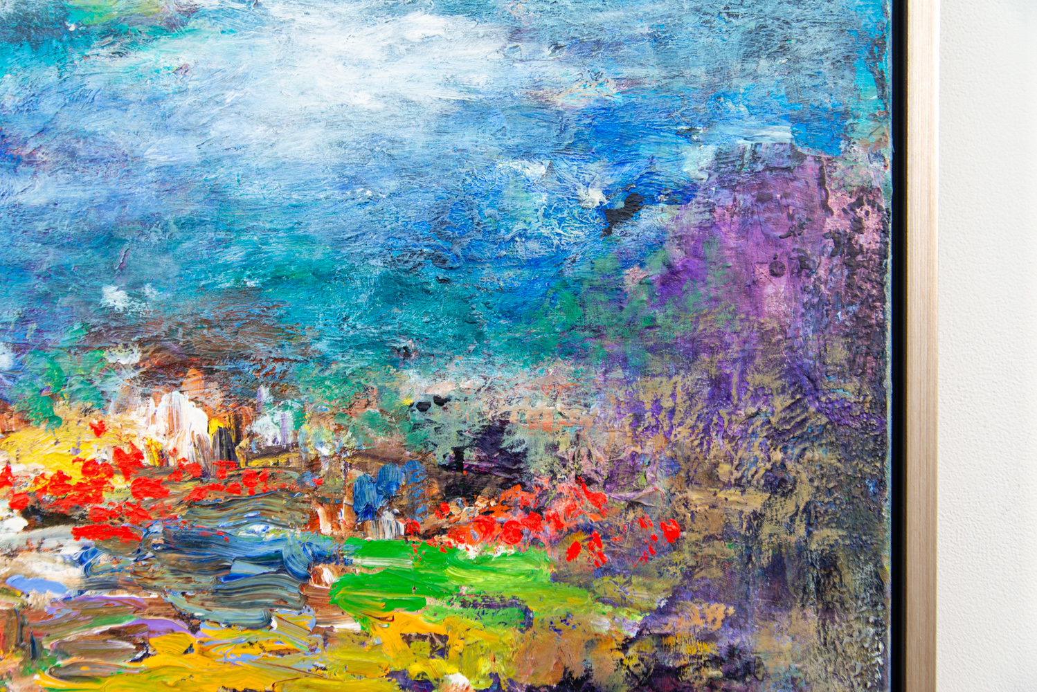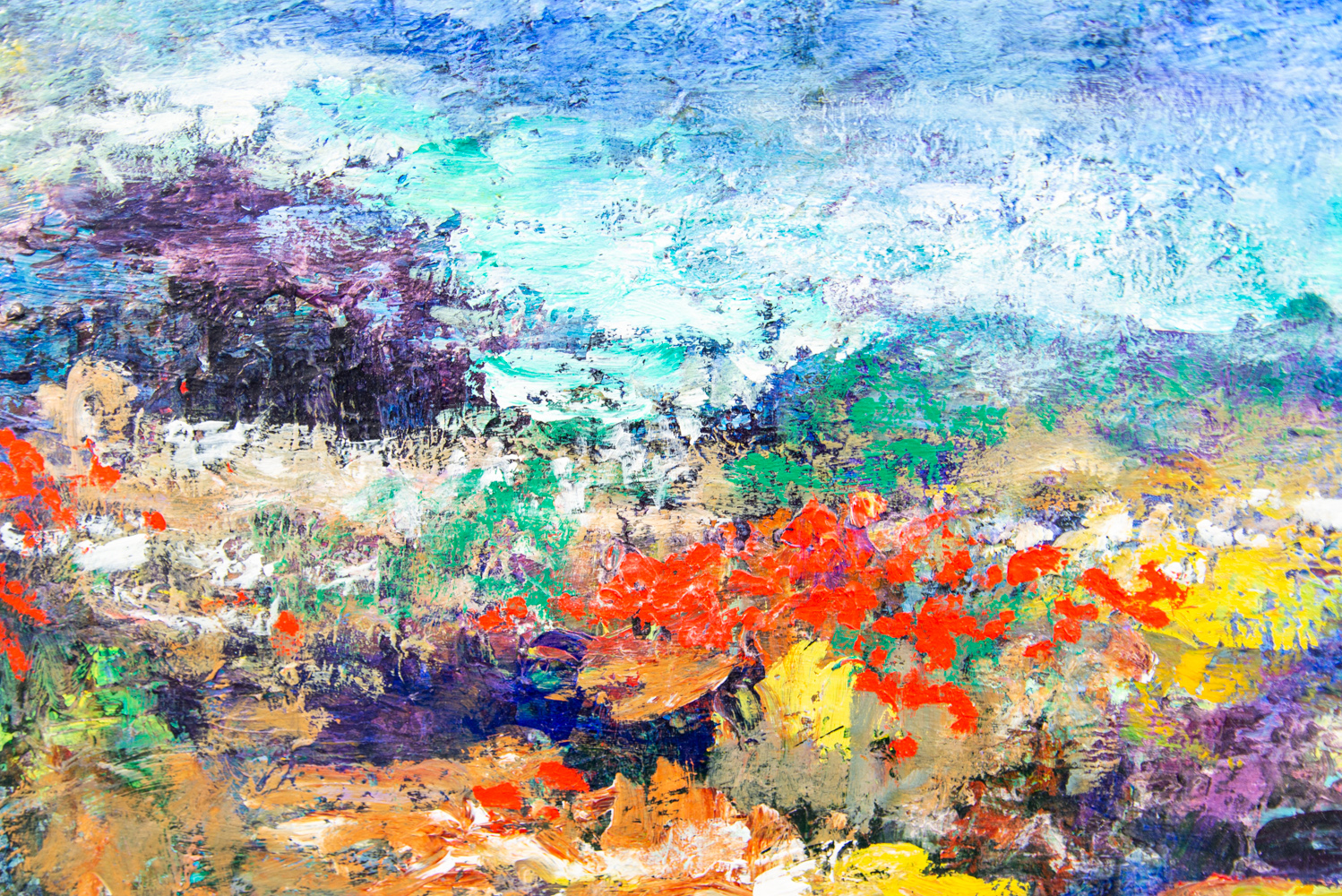 Beneath a deep blue, cloudy sky, the bright colours of what appears to be a tropical landscape –red, yellow, purples and green pop from the canvas in this beautiful composition by Paul Fournier. Considered to be one of Canada’s most significant abstract expressionists, Fournier received early praise from the distinguished NY art critic, Donald Kuspit, who described his work as that of an ‘exotic modernist.’ In the sixties, Fournier was part of a group of celebrated Toronto painters…Milly Ristvedt and David Bolduc, among others who explored the techniques and forms of abstraction.“You can do so many things with paint…it’s a wonderland.” Paul Fournier