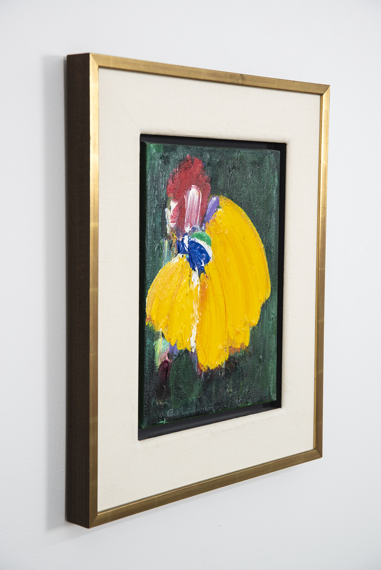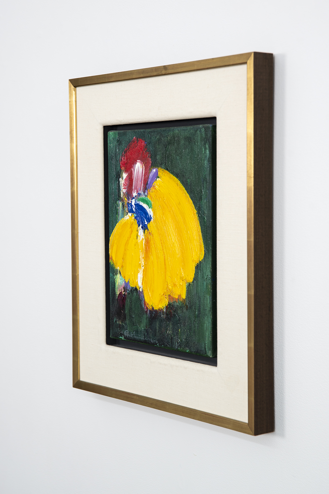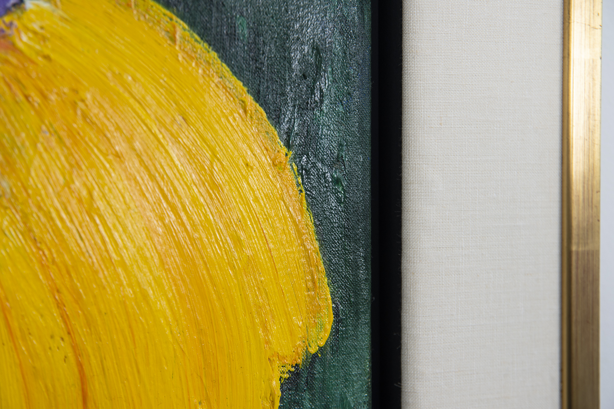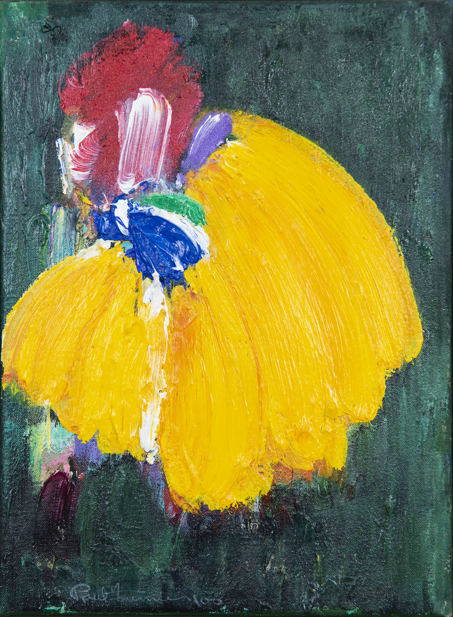 The viewer’s eye is drawn to this lush, colourful painting by a ‘plume’ of bright yellow and orange that pops against the rich green backdrop. Expressive brushstrokes of deep blue, light green, purple, pink and white ‘crown’ the yellow form. Fournier spent some time in the Caribbean, and the saturated colours of the tropics are referenced in much of his work.